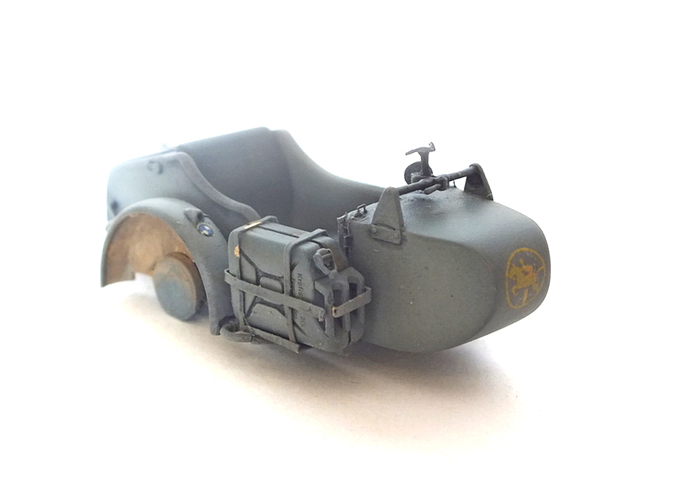 Забыл эмблемку БМВ на бак наклеить((Родную белую декаль дивизии на коляску не стал ставить,взял из запасов желтую.Декали очень нежные,так что успешно загубил пару номеров.Пришлось ставить тот где много цифирь.Декали номеров с планками не совпадают,пришлось задний номер подрезать,а передний растягивать.