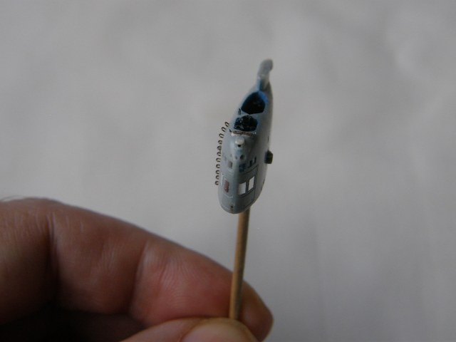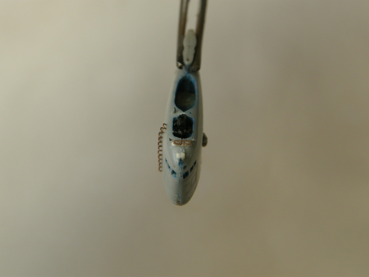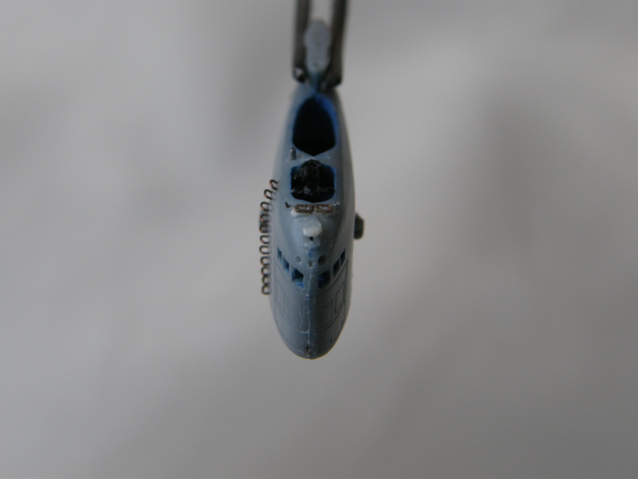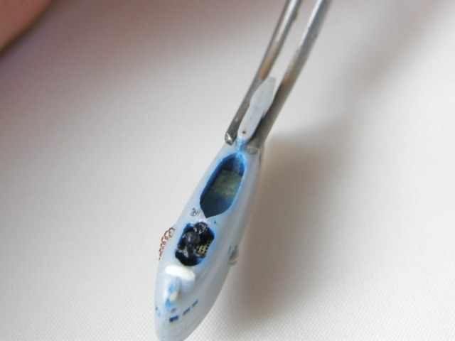Подобрав колер темно-голубого цвета, закрасил ранее зашпаклеванный супержидкой шпаклевкой от Mr. Hobby вертикальный шов внутри оргаждения рубки в корме палубы выдвижных устройств (ссылка).