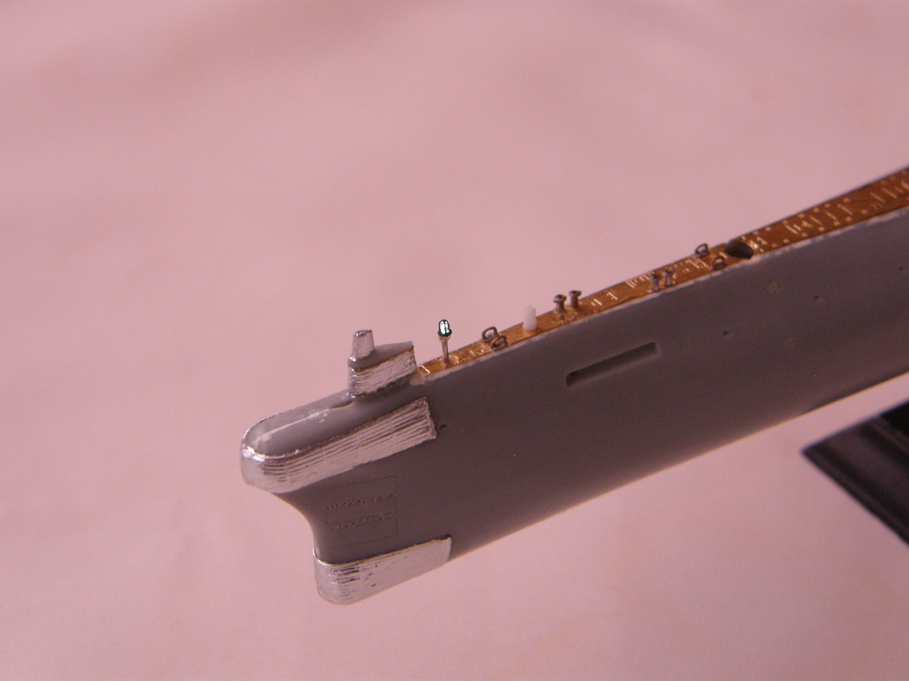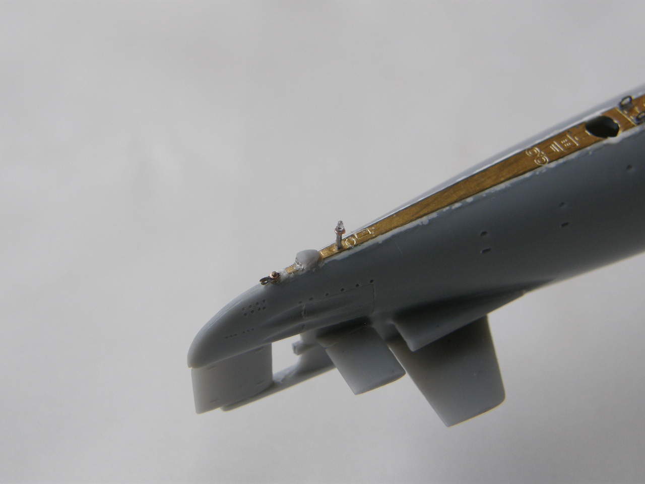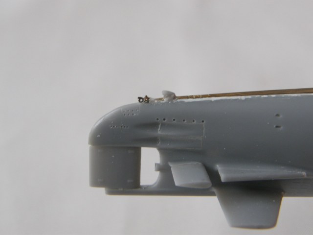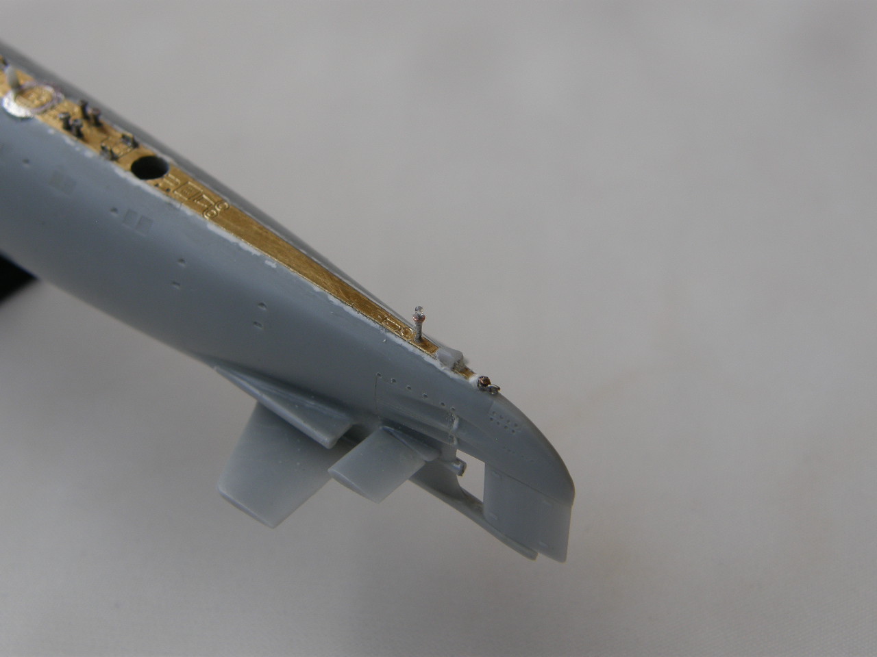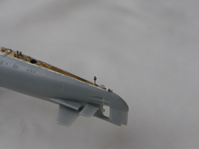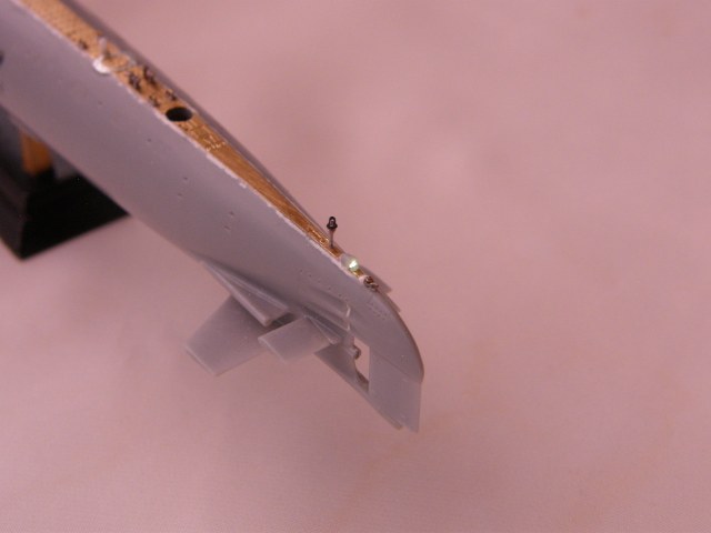 Из стоек лееров от Тамии изготовил два рыма для крепления растяжек штока торпедопогрузочного устройства (ТПУ) и также закрепил цапонлаком на штатных местах.