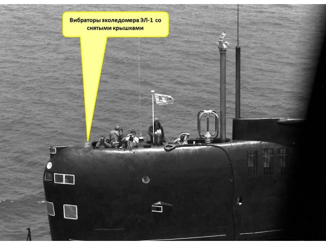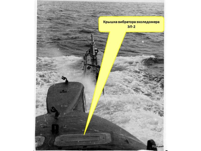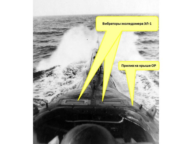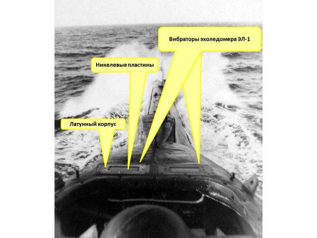 Согласно техническому описанию вибратор эхоледомера был магнитострикционным и имел латунный корпус (2) с установленным в нем пакетом никелевых пластин (1). Вибратор было запрещено покрывать краской. Рабочая поверхность пакета вибратора от мехинических повреждений предохраняется защитной крышкой (10), которая должна сниматься только перед выходом подводной лодки в море.