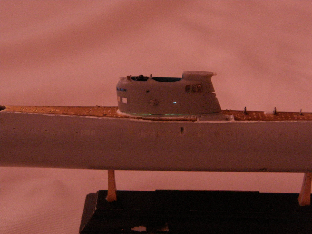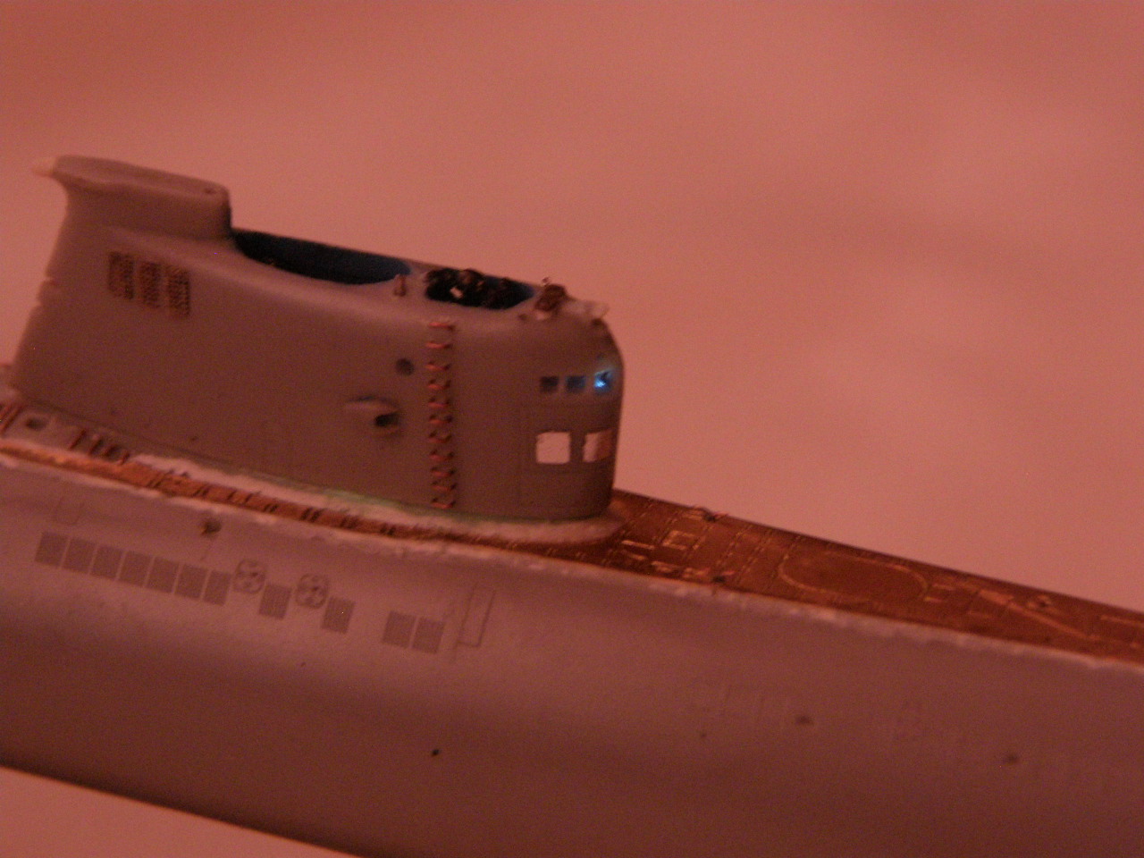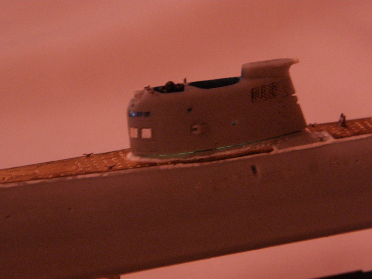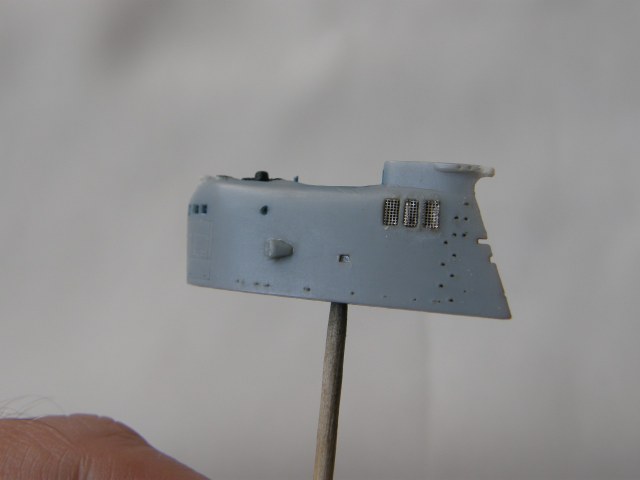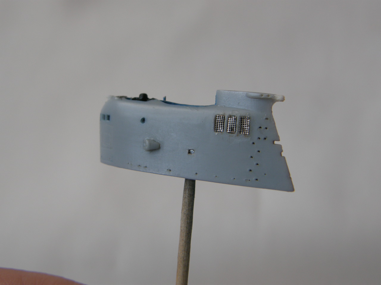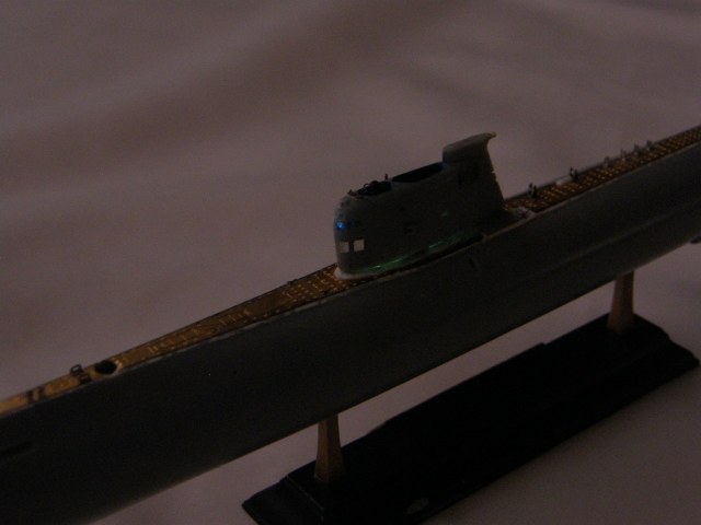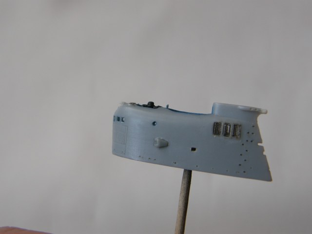 Склейка обеих половинок ограждения рубки потребовала еще ряд подготовительных мероприятий. Отполировал наждачной шкуркой 2500 места акустических антенн станции ОГС (обнаружения гидроакустических сигналов) в носовой части ОР под поталь и углубил замыленную расшивку в той же носовой части ОР. Кистью 0000 покрыл грунтом Праймер Металс снаружи решетки общекорабельной вентиляции в верхней кормовой части ОР. Далее, собрал все детали ОР и скрепил супержидким клеем от Тамии.