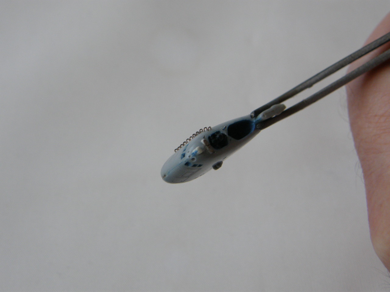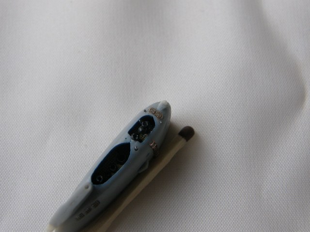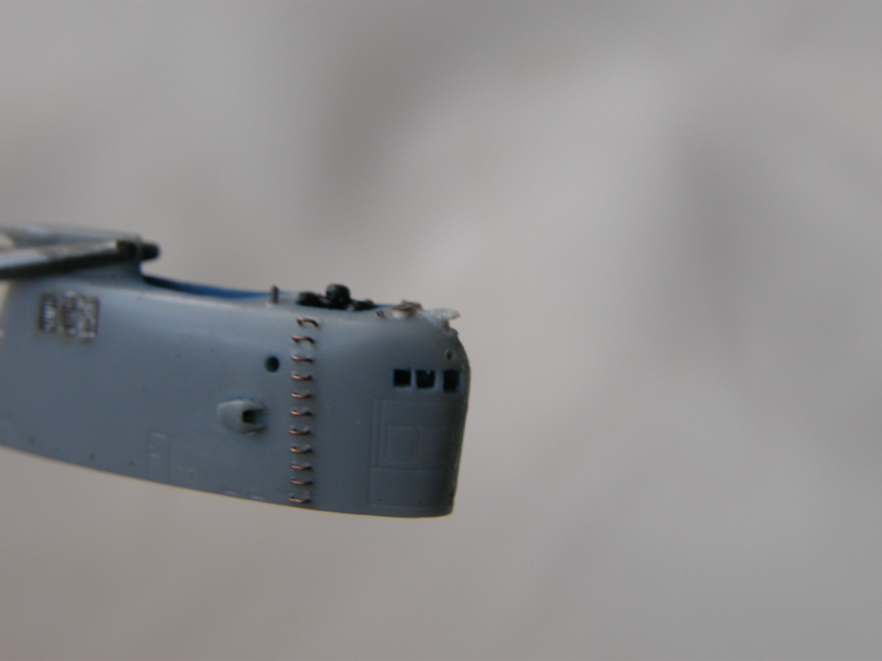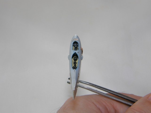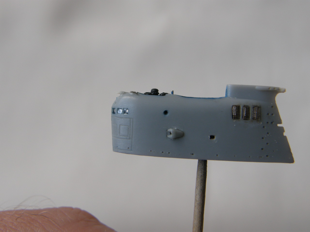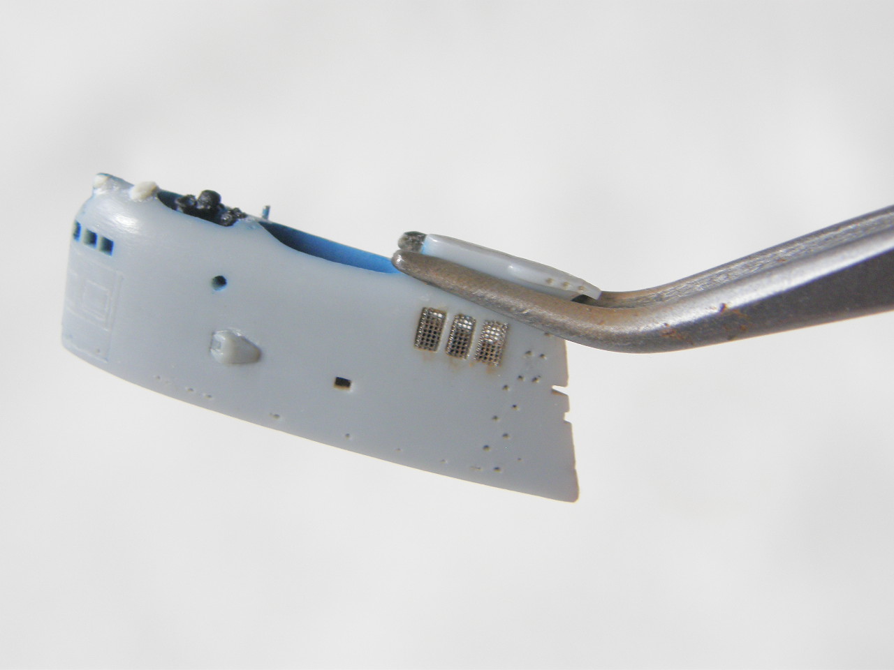 Склейка обеих половинок ограждения рубки потребовала еще ряд подготовительных мероприятий. Отполировал наждачной шкуркой 2500 места акустических антенн станции ОГС (обнаружения гидроакустических сигналов) в носовой части ОР под поталь и углубил замыленную расшивку в той же носовой части ОР. Кистью 0000 покрыл грунтом Праймер Металс снаружи решетки общекорабельной вентиляции в верхней кормовой части ОР. Далее, собрал все детали ОР и скрепил супержидким клеем от Тамии.