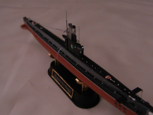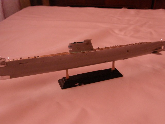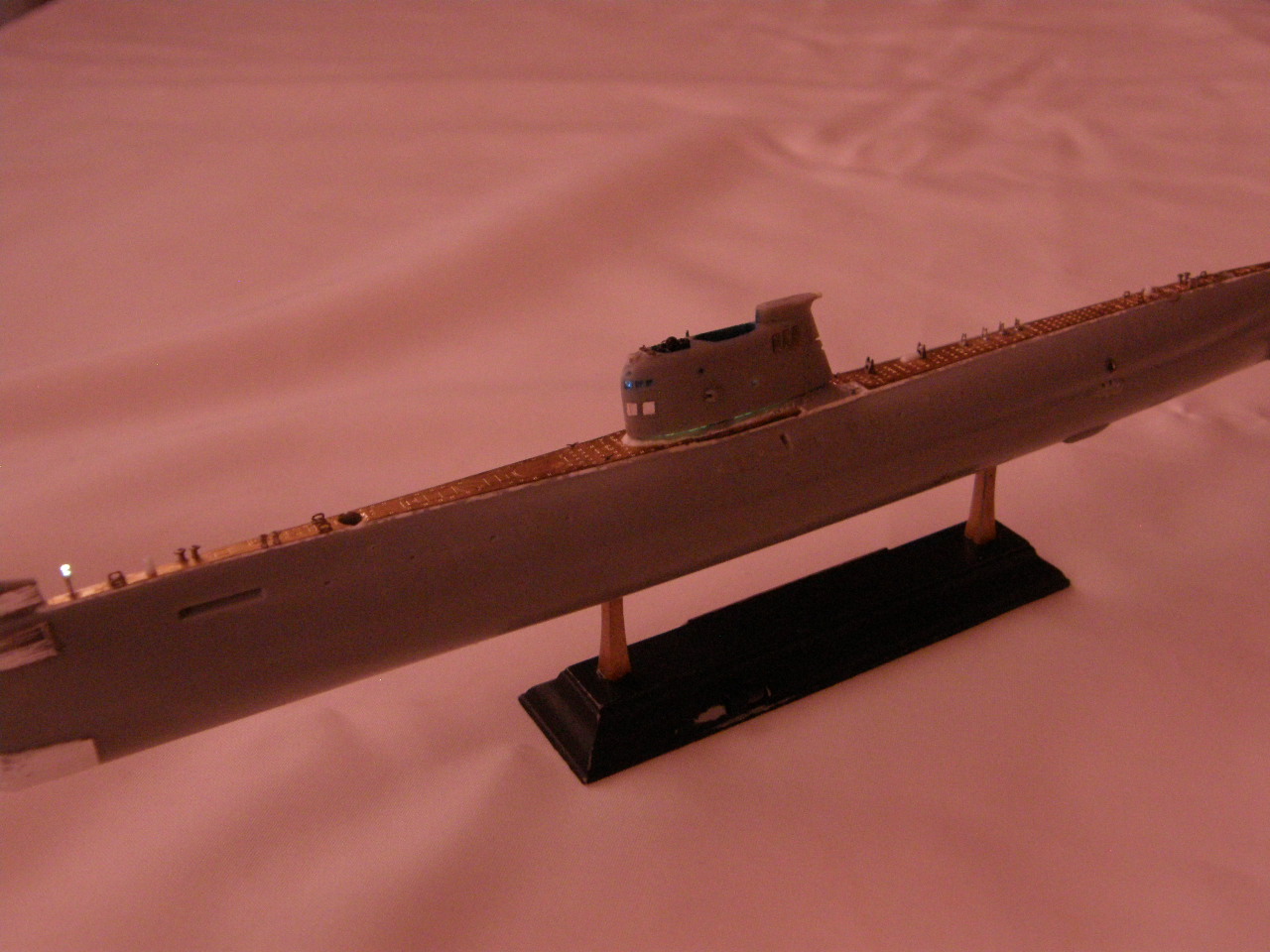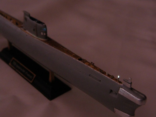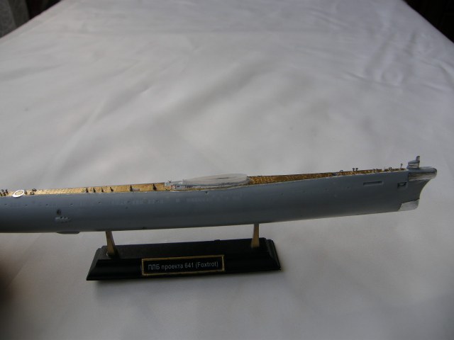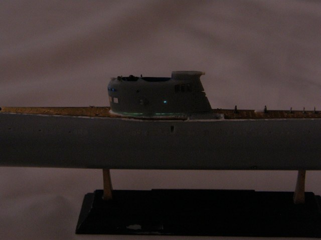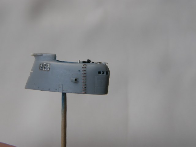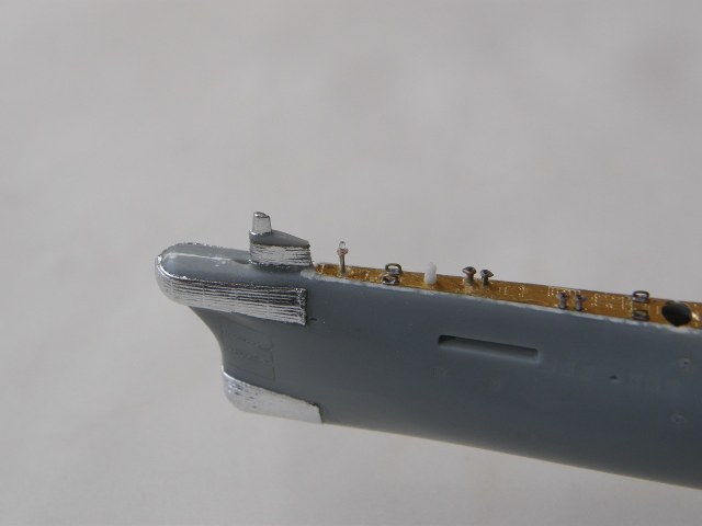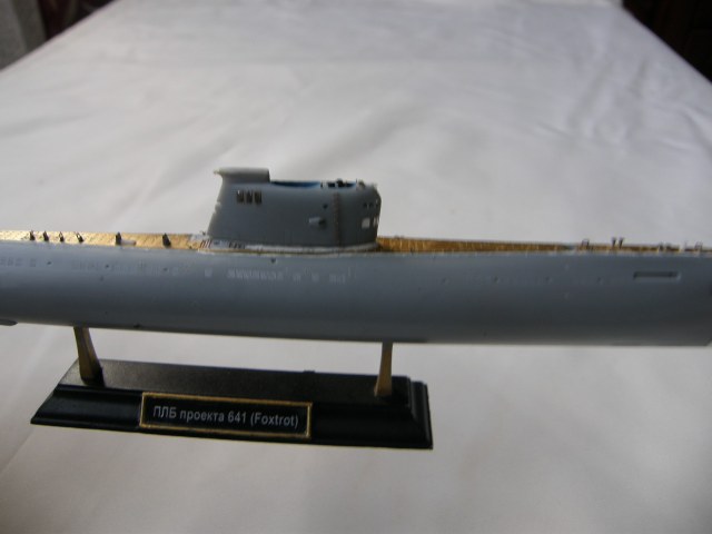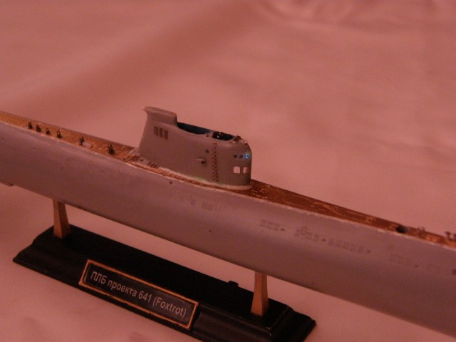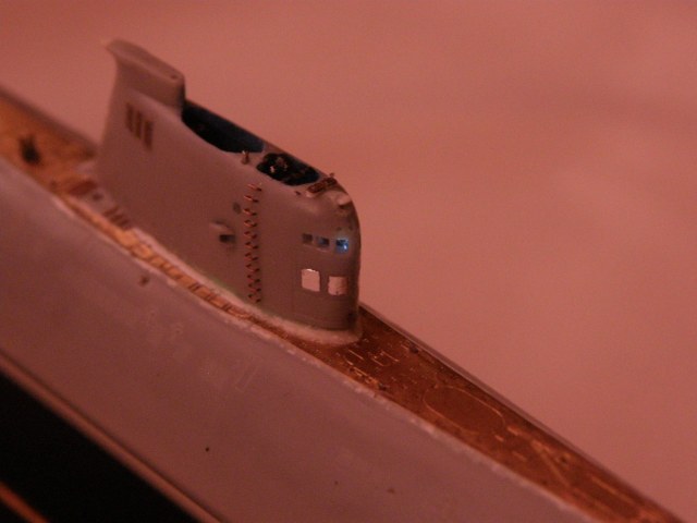 Продолжил работу над ограждением рубки (ОР). В носовой средней по высоте части ОР сымитировал обтекатели ГАС ОГС (обнаружения гидроакустических сигналов), контуры их расшивкой показал производитель.