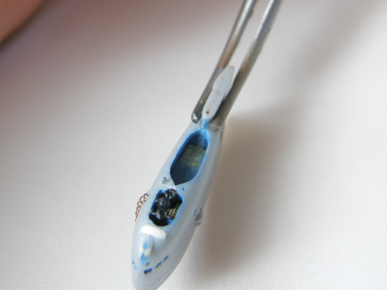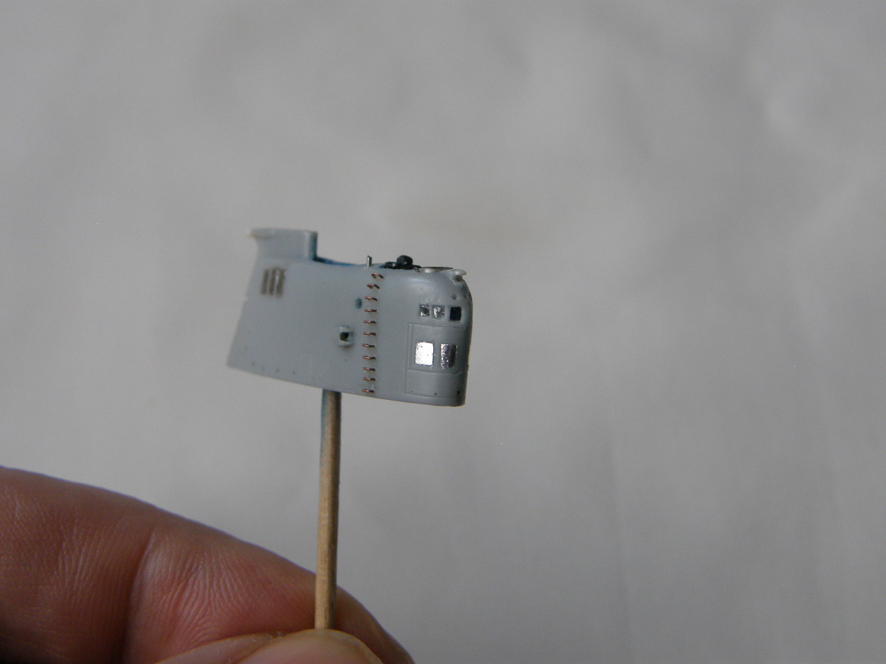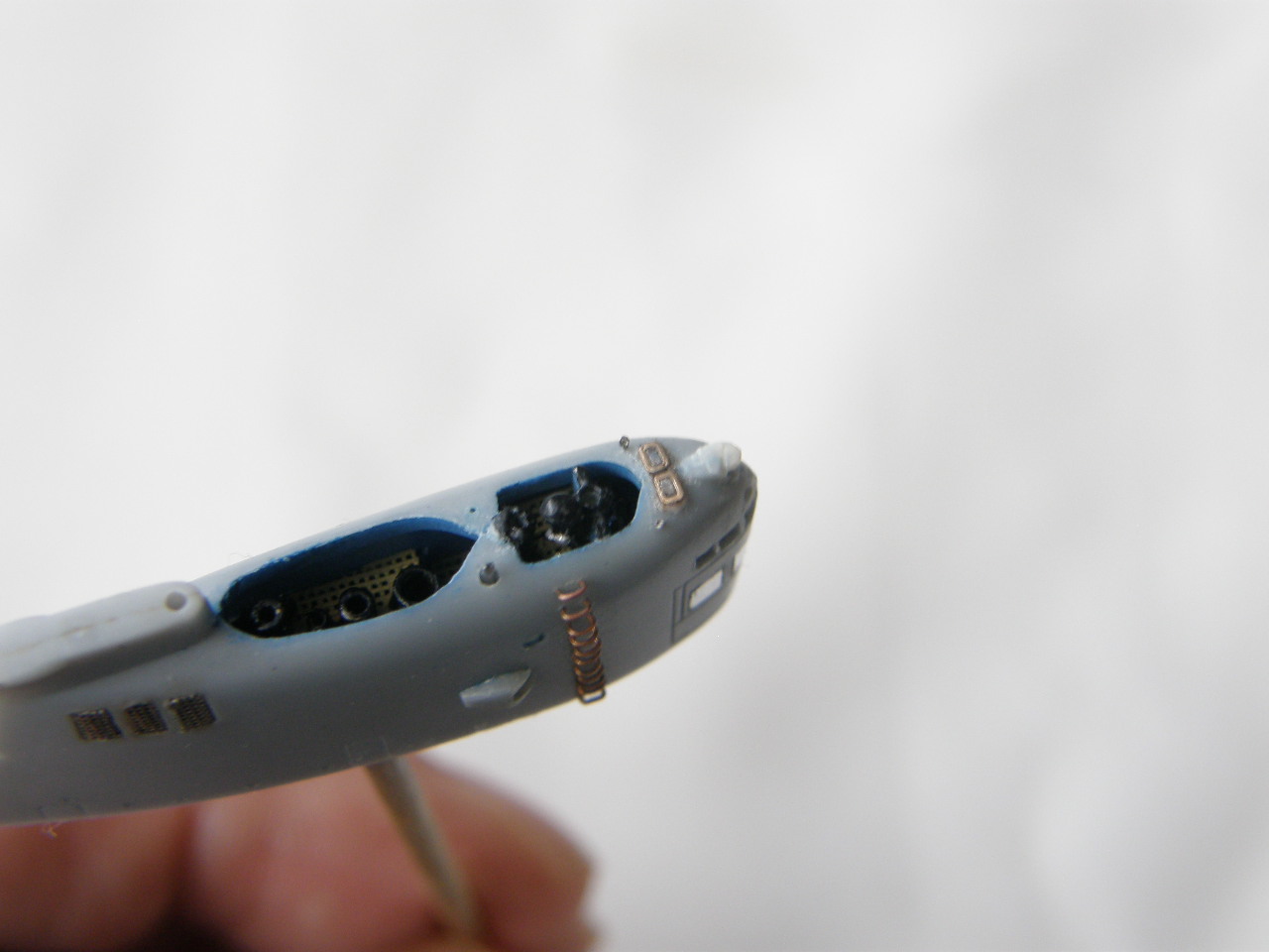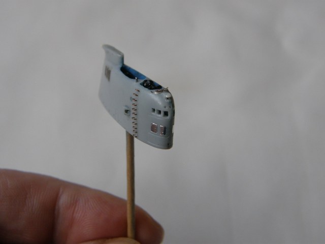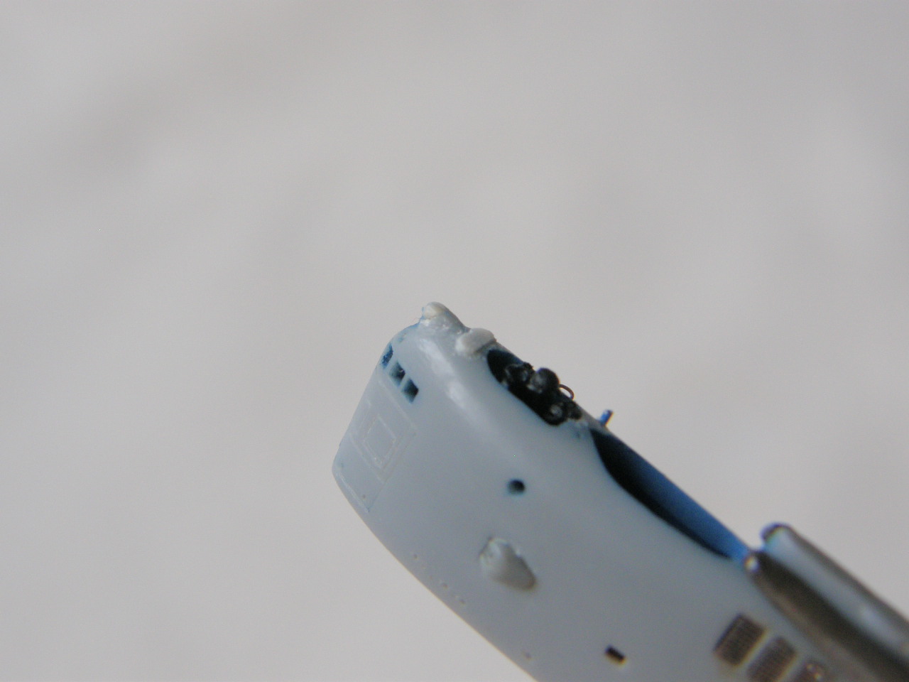 И в самом конце модельным ножом аккуратно вырезал углубление под плафон топового огня в обтекателе (выгородке) топового огня.