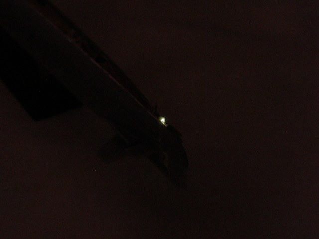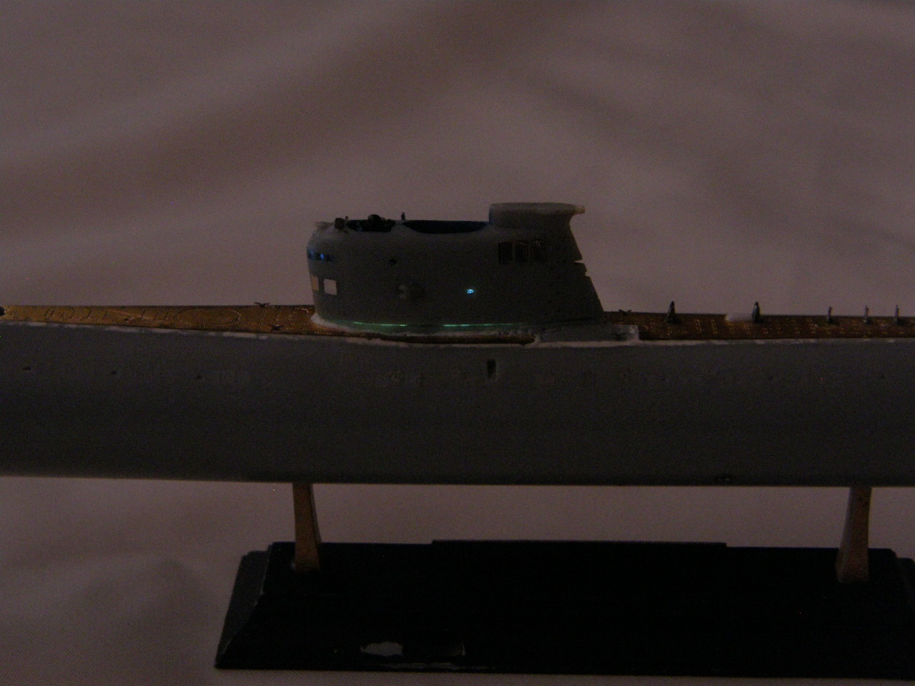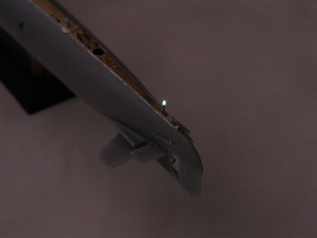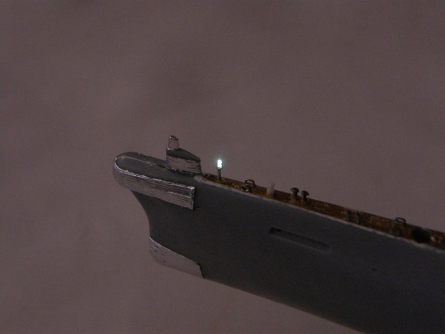 Пока я все это делал, хитрый мехиник пробрался на борт модели, вкрутил лампочки в стойки якорных огней и обтекатель (выгородку) кормового огня и уговорил включить их..