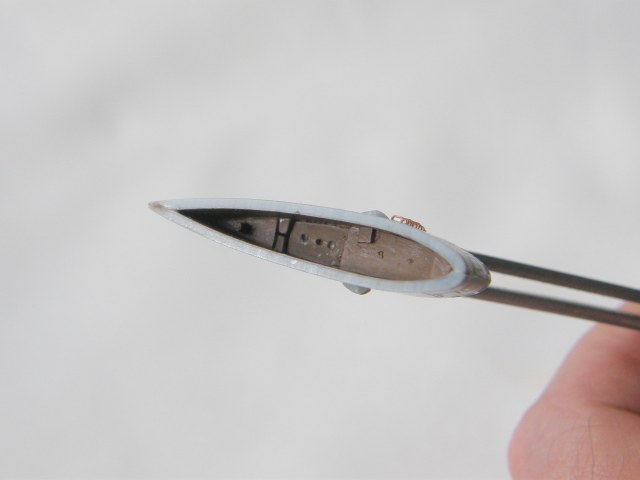 Установил и закрепил цапонлаком рыбины на палубу выдвижных устройств ОР. После чего, замаскировав скотчем от Тамии внешнюю поверхность ОР, покрыл матовым акриловым лаком от Тамии кормовую часть ОР изнутри. Работа с внутренней частью ОР закончена.