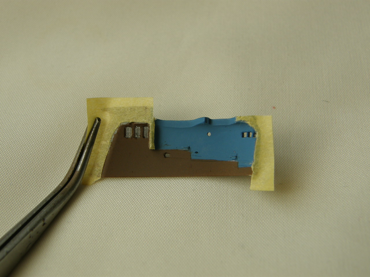 Проделал стекольные работы. По результатам проведенных ранее экспериментов (ссылка) решил снова остановиться на жидком стекле от Пластмастера. Остекление иллюминаторов ограждения рубки из тонкой пленки жидкого стекла от Пластмастера (прозрачность по отношению к стеклу равна приблизительно 0,95). Чтобы получить тонкую пленку необходимо развести жидкое стекло (выглядит как гель) напополам спиртом. Остекление ренее было проверено на жидкую маску и жидкость для декалей от Тамии. Снимки остекления сделаны после испытания на агрессивные жидкости (ссылка).