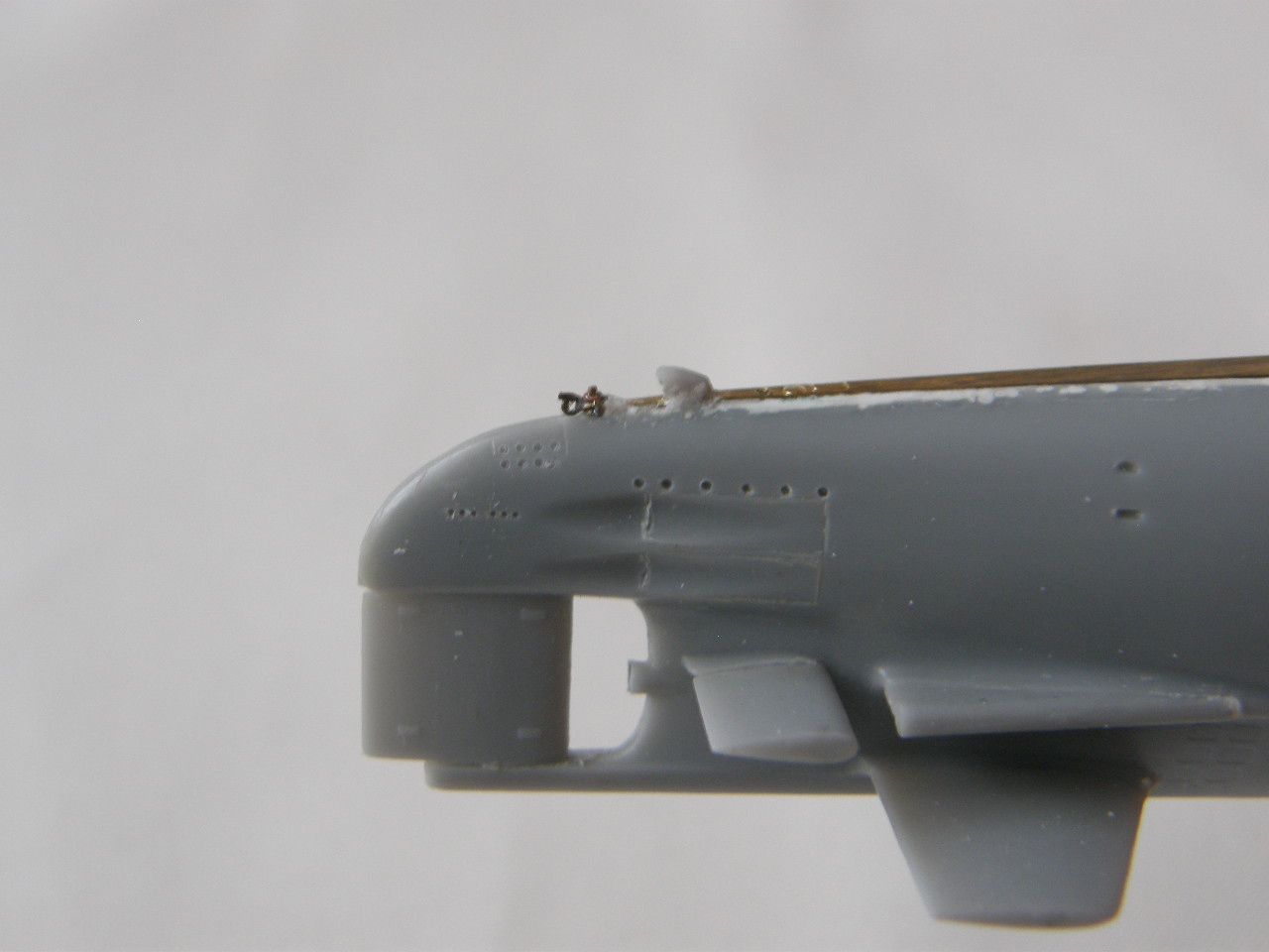 После этого, зашпаклевал супержидкой шпаклевкой от Mr. Hobby вертикальный шов внутри ОР в корме палубы выдвижных устройств.