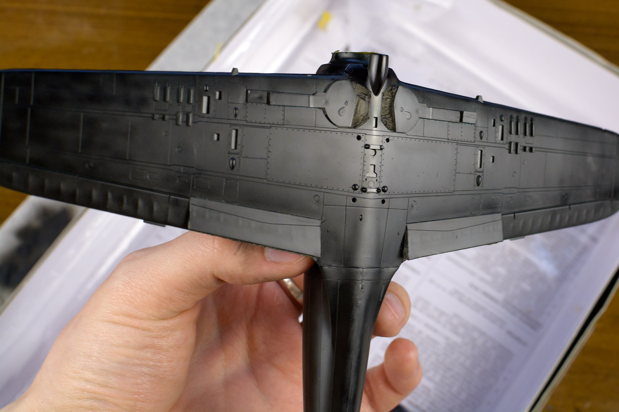Вобщем покрасил двигатель. Подзагубил немного красивый переход от красноватого цвета в коричневый на выхлопных трубах, подзадув нагаром красноватость. Красноватость совсем чуть осталась, но фото не передает. Ну и подсобрал самолет, зачистил швы, щели подшпаклевал, их очень мало. Утвердился в том, чтобы не использовать грунтовку, аэр ее чет плохо выдувает, как бы не разбавлял. Аотаке в ниши шасси надул, ну и на детали шасси прямо на литниках.