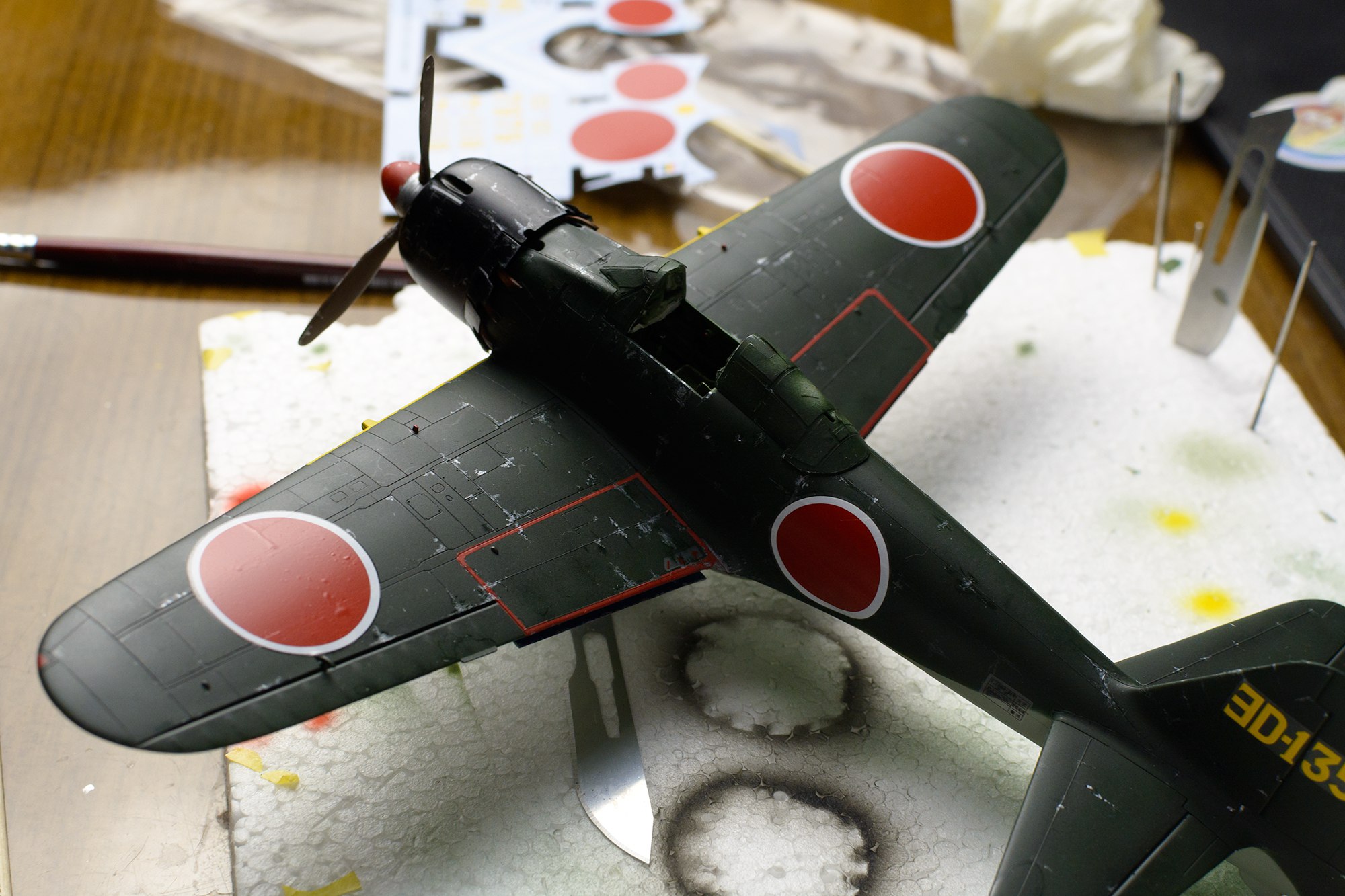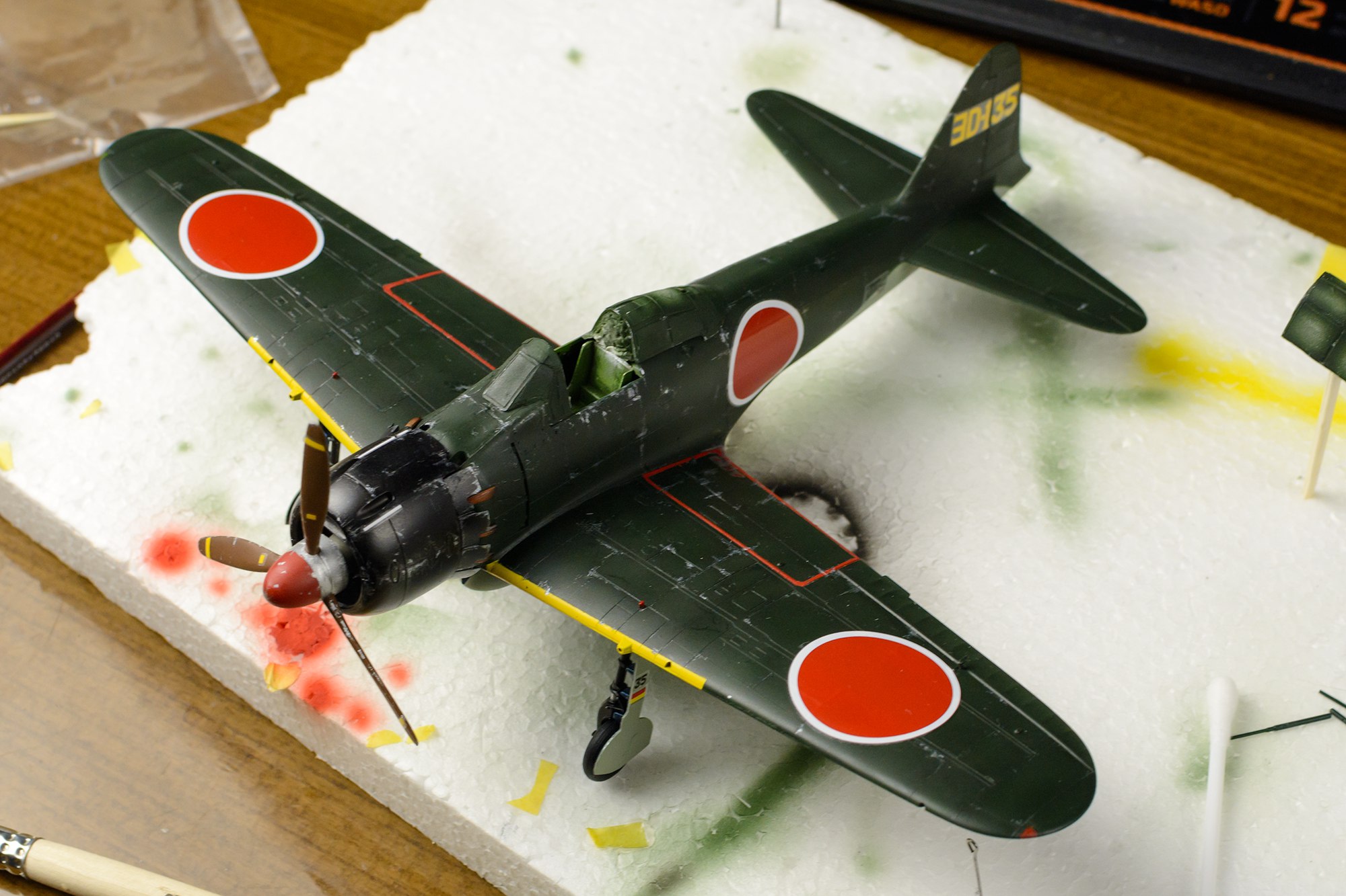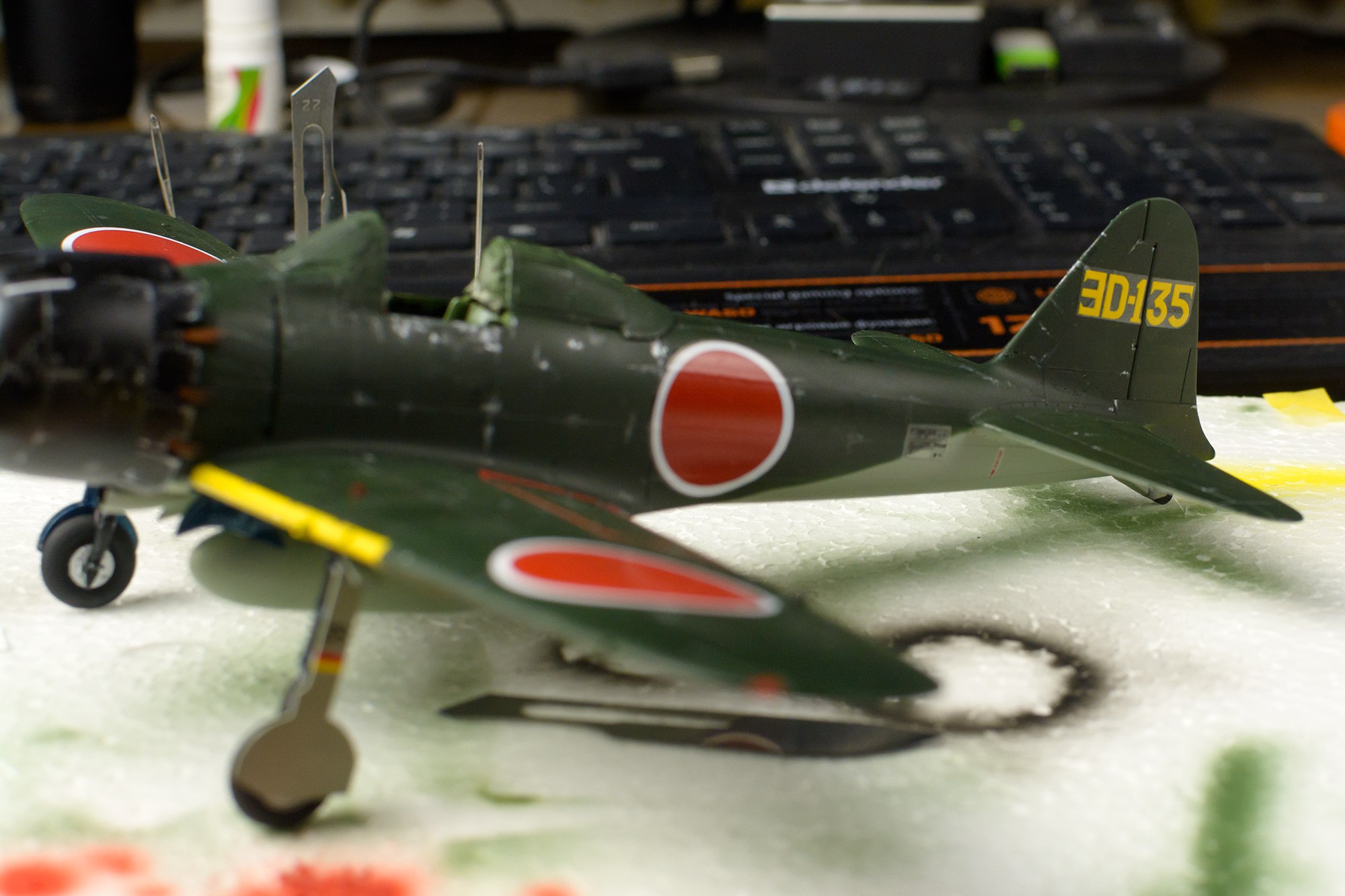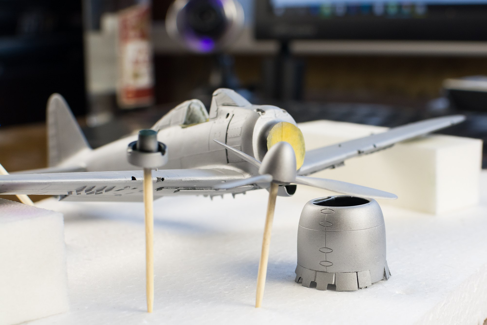 Ну во-первых дальше в планах тамиевский "мустанг", поэтому практикуюсь лишний раз в нанесении металликов. Опробовал новый для меня способ. Ранее собрал мустанг от итальери в 1/72, там не совсем этот металлик задался. Почему бы и не набить руку. Ну и во-вторых у японцев судя по всему с краской была какая-то беда и в условиях тихоокеанского климата и солености она лупилась на самолетах очень бодро и по многу. Я планирую имитировать это содрав зубочисткой базовый зеленый до металлика. Можно конечно кисточкой нанести металлик на базу, но я решил убить двух зайцев сразу и опробовать такой метод старения) Он вроде как если все аккуратно сделать выигрывает по виду у ручного нанесения потертостей. Краски, кстати, что черной, что алюминиевой потребовалось совсем мало)bek пишет:а зачем тратить столько дорогой краски - черной и алюминиевой, если модель будет зеленой?