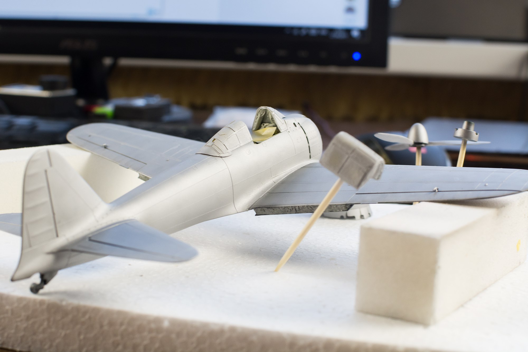 На данный момент кокпит идет полным ходом. Задул деталюхи жидкой белой грунтовкой.