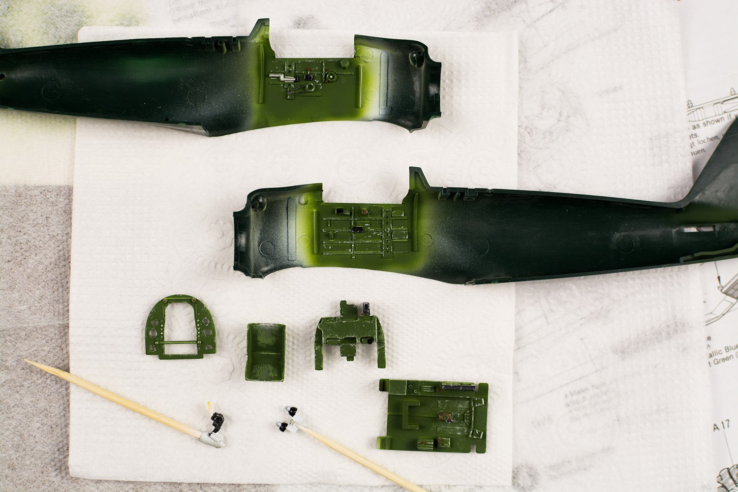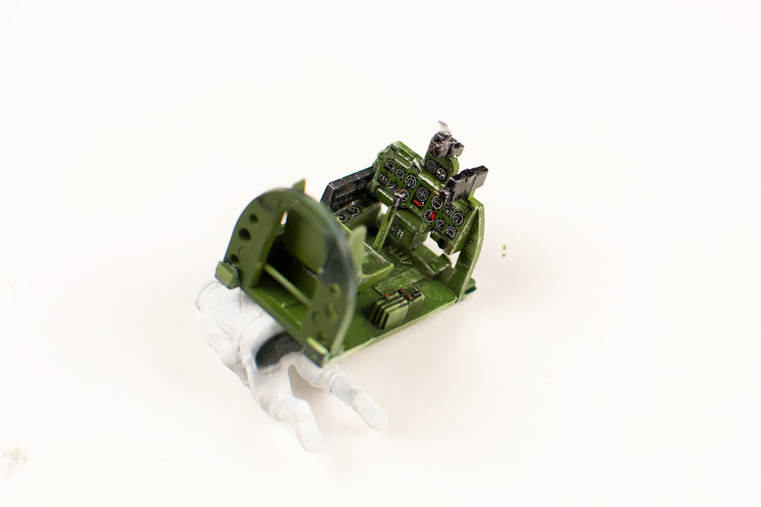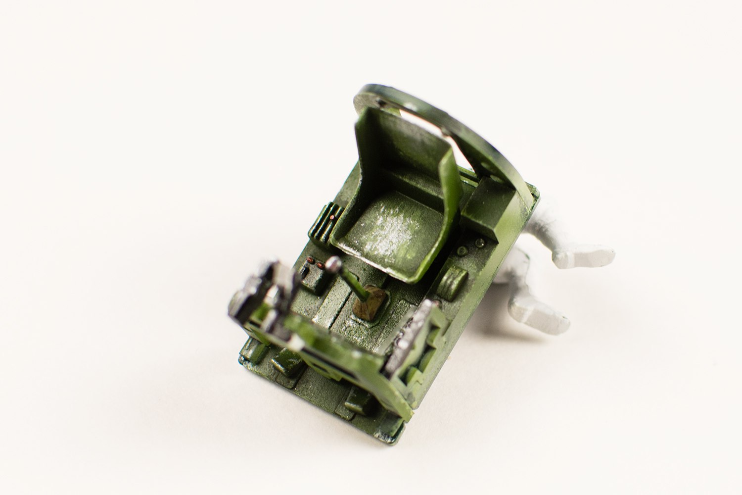 Задул детали кокпита базовым зеленым (xf-5), потом капнул белого и сухой кистью попробовал хайлайта местами добавить. На полу как раз та самая манка, пытался наждачкой ее, вышло не очень, покрасил как есть и закрою пигментом песка мб) После "подрал" кистью. В инструкции сказано было спилить один пулемет, полагаю модификация такая. В следующий сеанс задую тамиевским акриловым лаком, хотя он мне не очень нравится, но другого не достать.(есть и от звезды, но его использовать не рискую, не думаю что он лучше тамиевского) Развожу обычно 1к3 с родным разбавителем. Смотрел на днях видео, где зарубежный моделист задувал слой аллюминия перед нанесением на него базы обычным дешевым лаком для волос О.о, мб кто-нибудь знает хороший бытовой лак?...После нанесу декали приборов на положенные места и смывку. Смывка тоже тамия. "дарк браун на пол" и черную на бока и приборную панель кокпита. Ну и соответственно соберу воедино. А пока пойду отдыхать)