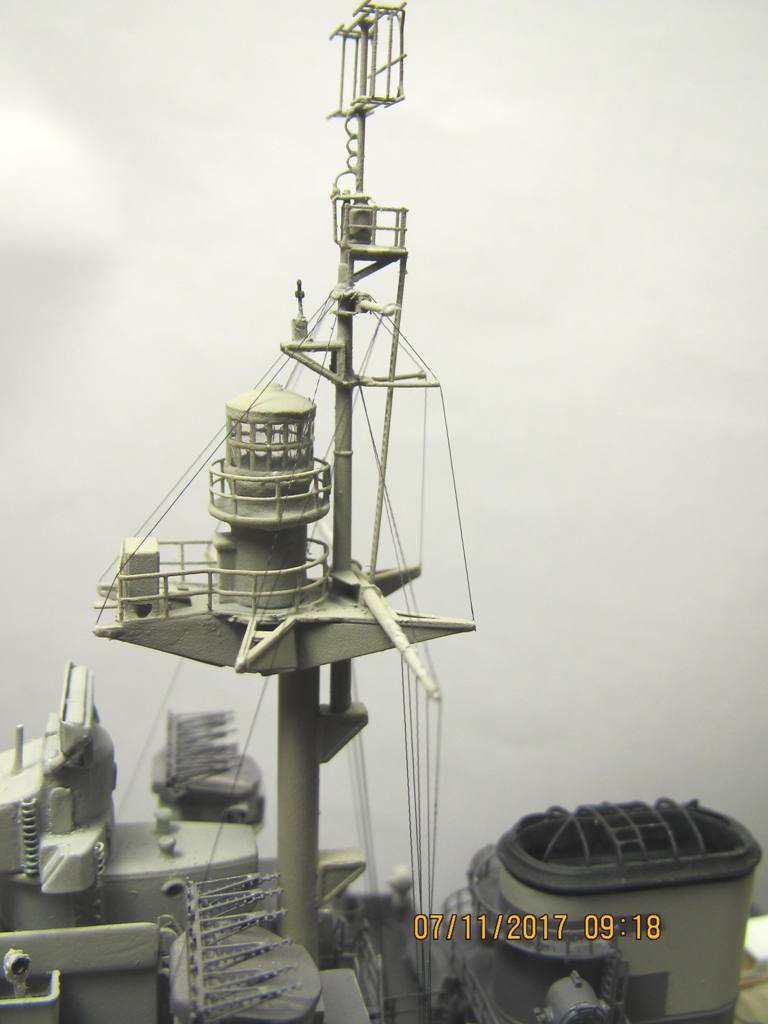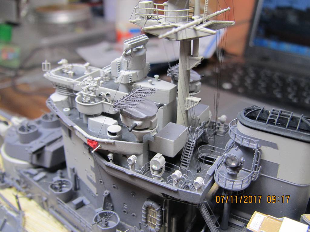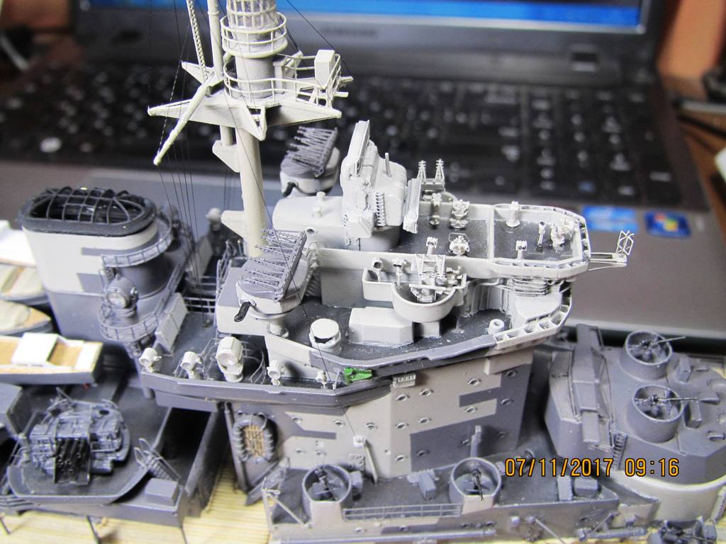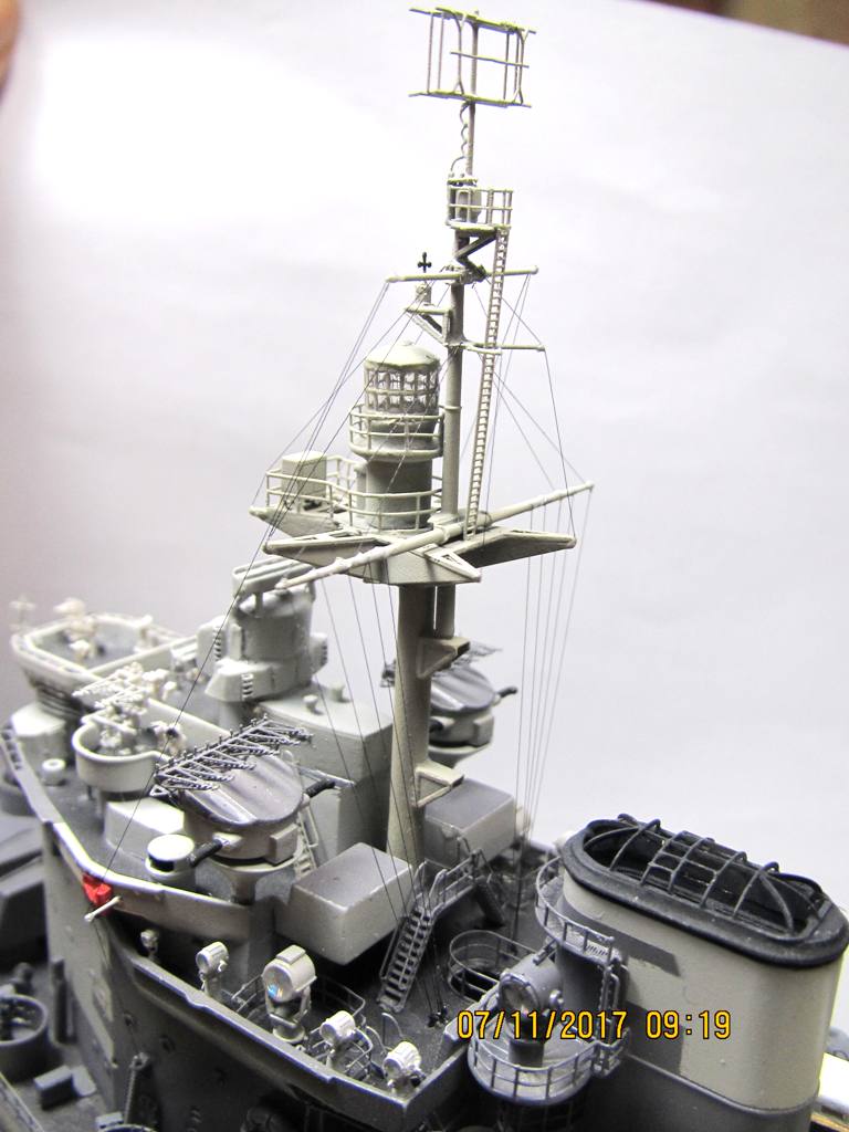 Не удержался и поставил мелочевку, там где она уже , по идее, мешать не будет. Сделал такелаж на мачте. Использовал нить от бантика, но как то все очень тонко выглядит, пусть и масштабно, а не везде видно.