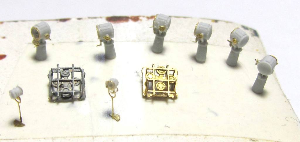 А также склеил прожектора. После чего задумался о том будут ли видны после покраски мелкие травленые элементы. Все маховички меньше 1 мм в диаметре, есть и 0.5 мм. Без лупы (или макрофото) и не рассмотреть, а времени отнимают уйму. И не только на срезание-наклейку, но и на поиски того что уронил. А Нордстар - жадный - ни одной детали в запас.