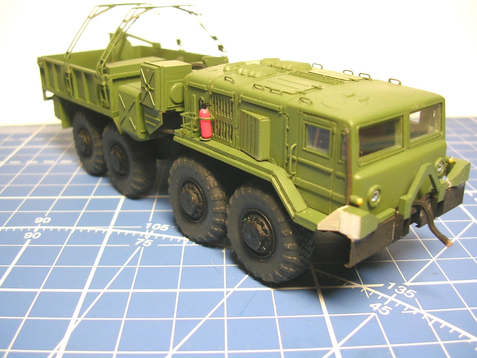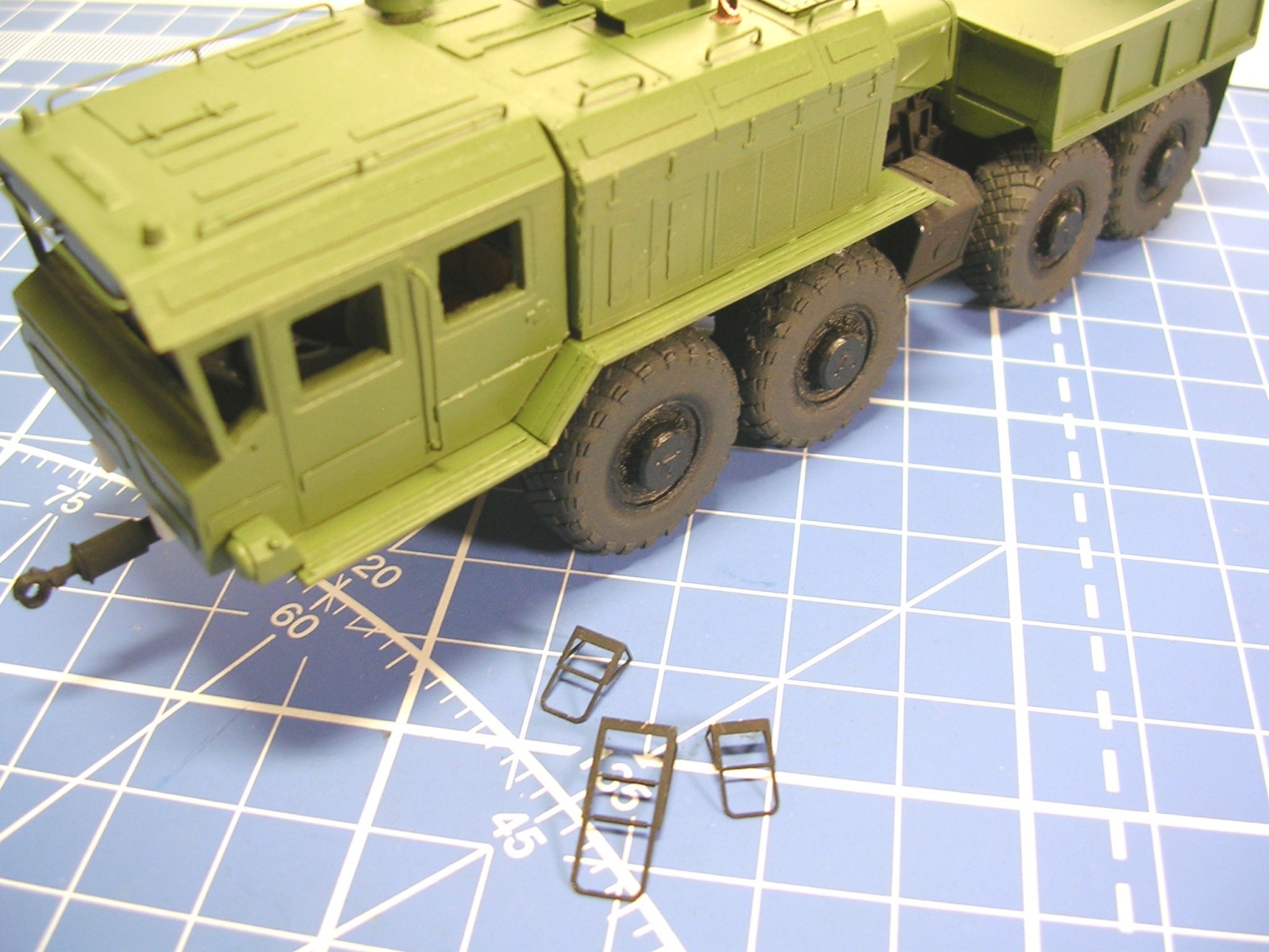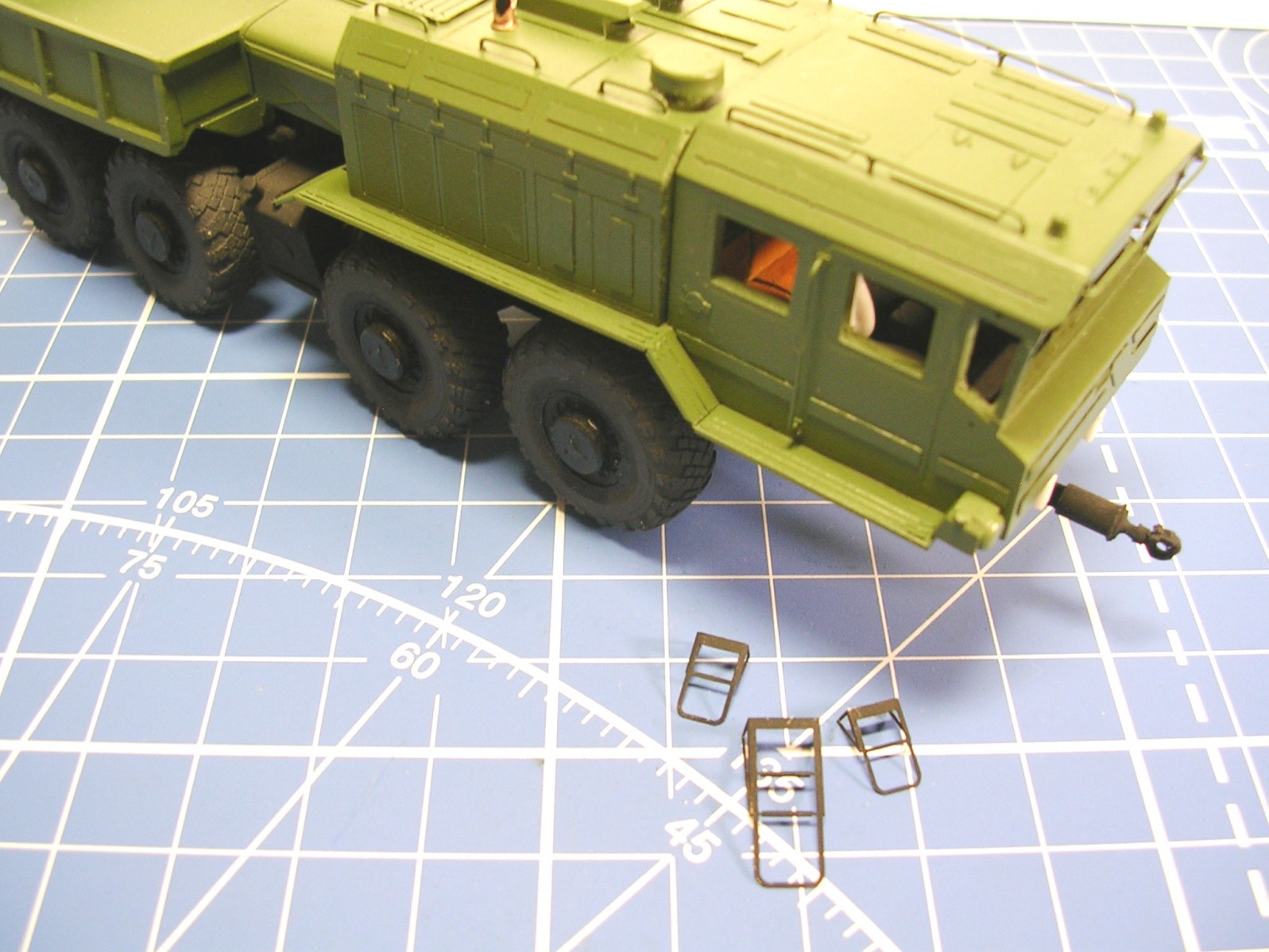 В моих наборах Armada дала и для МАЗ и для КЗКТ одинаковые выхлопные трубы (по образцу МАЗ), да ещё и по одной для обоих моделей... а между тем они разные и к тому же парные... КЗКТ "отдал свой "полнабор" МАЗу... Я же рассверлил некопийные "пеньки" труб и вклеил как мне кажется "реальные".