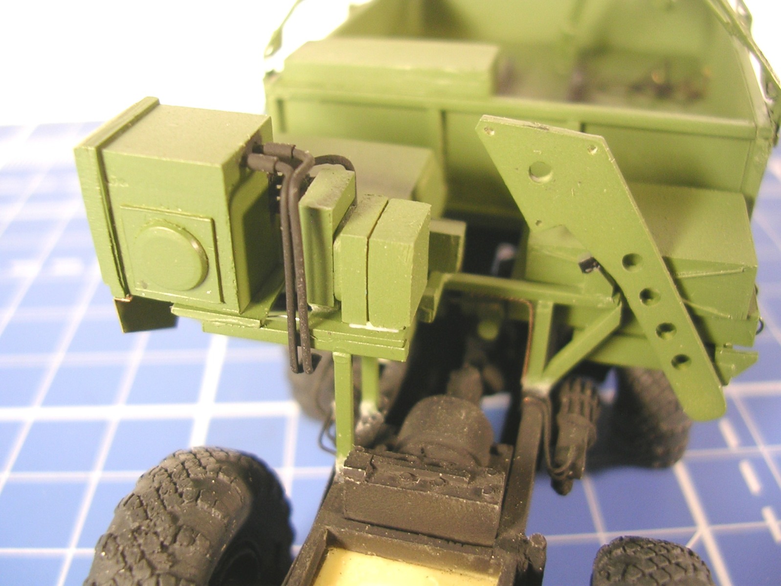 Исходя из расчёта мощности электромоторов активного полуприцепа, который должен подталкивать тягач (такая вот тавтология), мощность установленного в кузове генератора 200 кВт… не так много в те времена было столь мощных генераторов… выбрал самый «прогрессивный», получил раму с отверстиями для крепления. Сам генератор «копировать» не стал, поскольку адаптирую модель для «аэродрома», а там он ни к чему. Добавил люк для прохождения карданного вала от раздатки до генератора… получилось как то так…