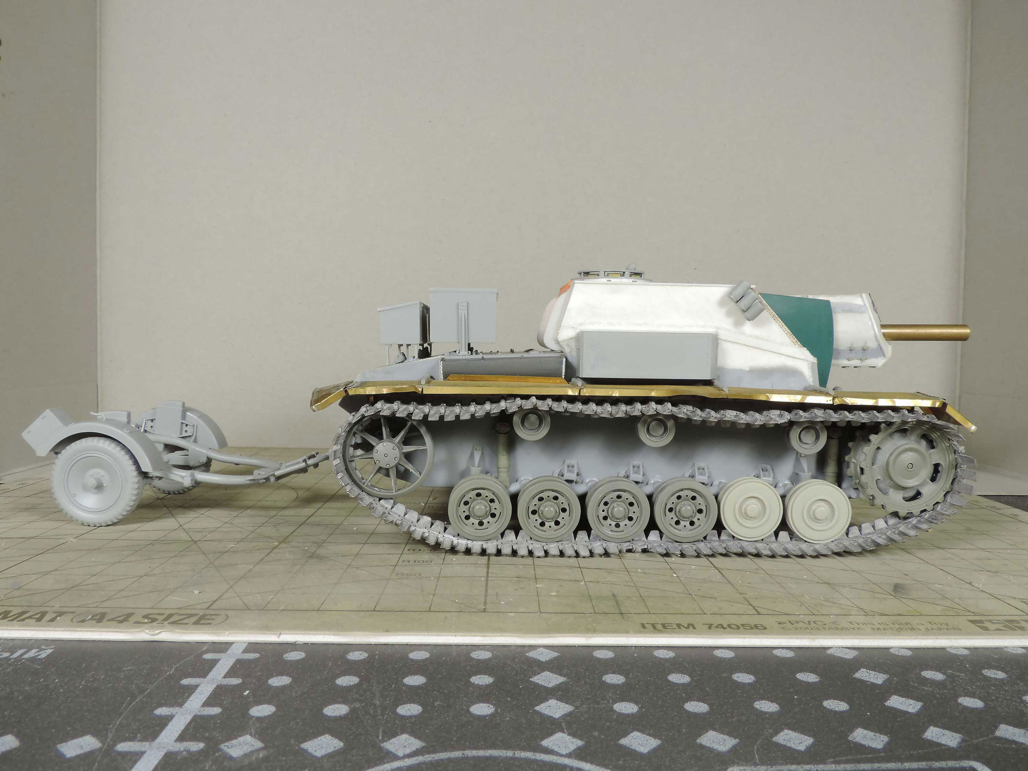 Продолжаю строить самоходку. Так как решил делать её трофейной, то пришлось внести некоторые изменения которые видны на фото. Флака на прицепе не будет, да и нет его у меня, а будет дощатый пол и разный скарб типа бочек и т.д.