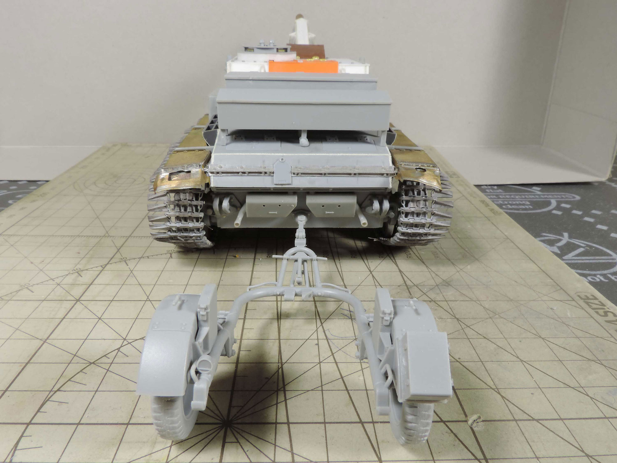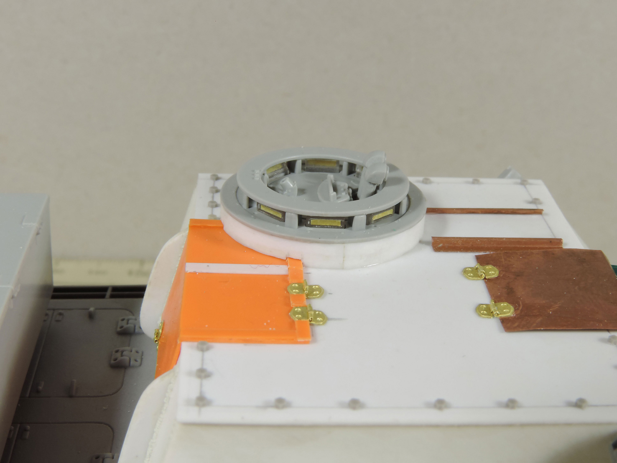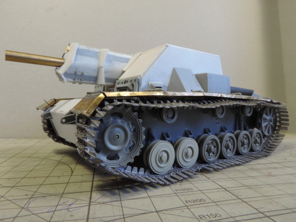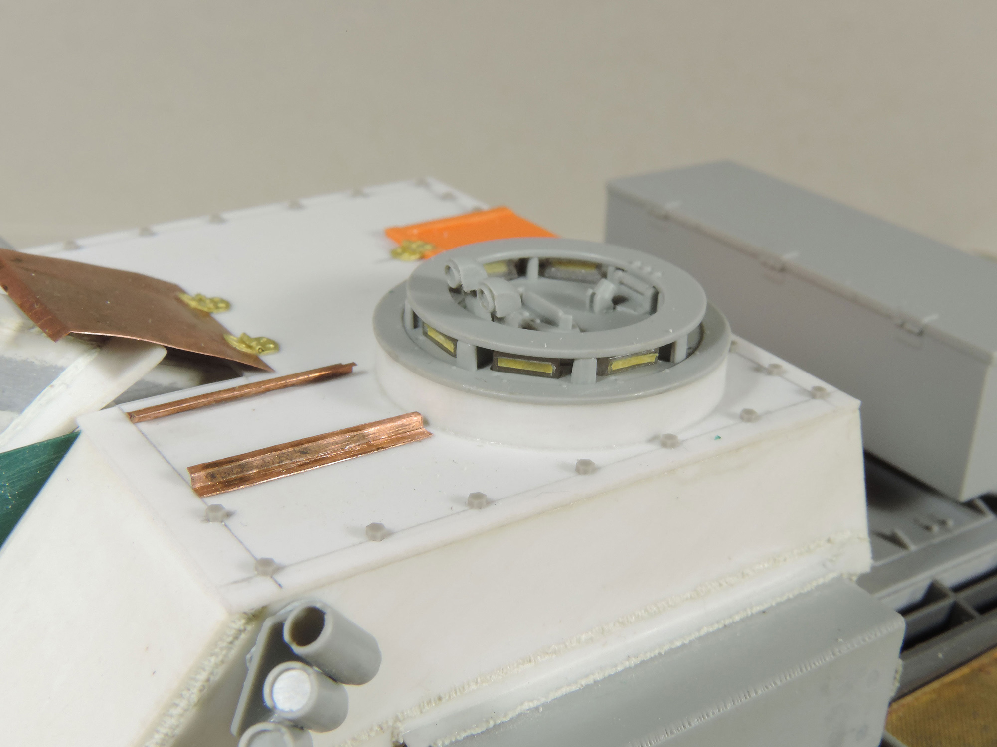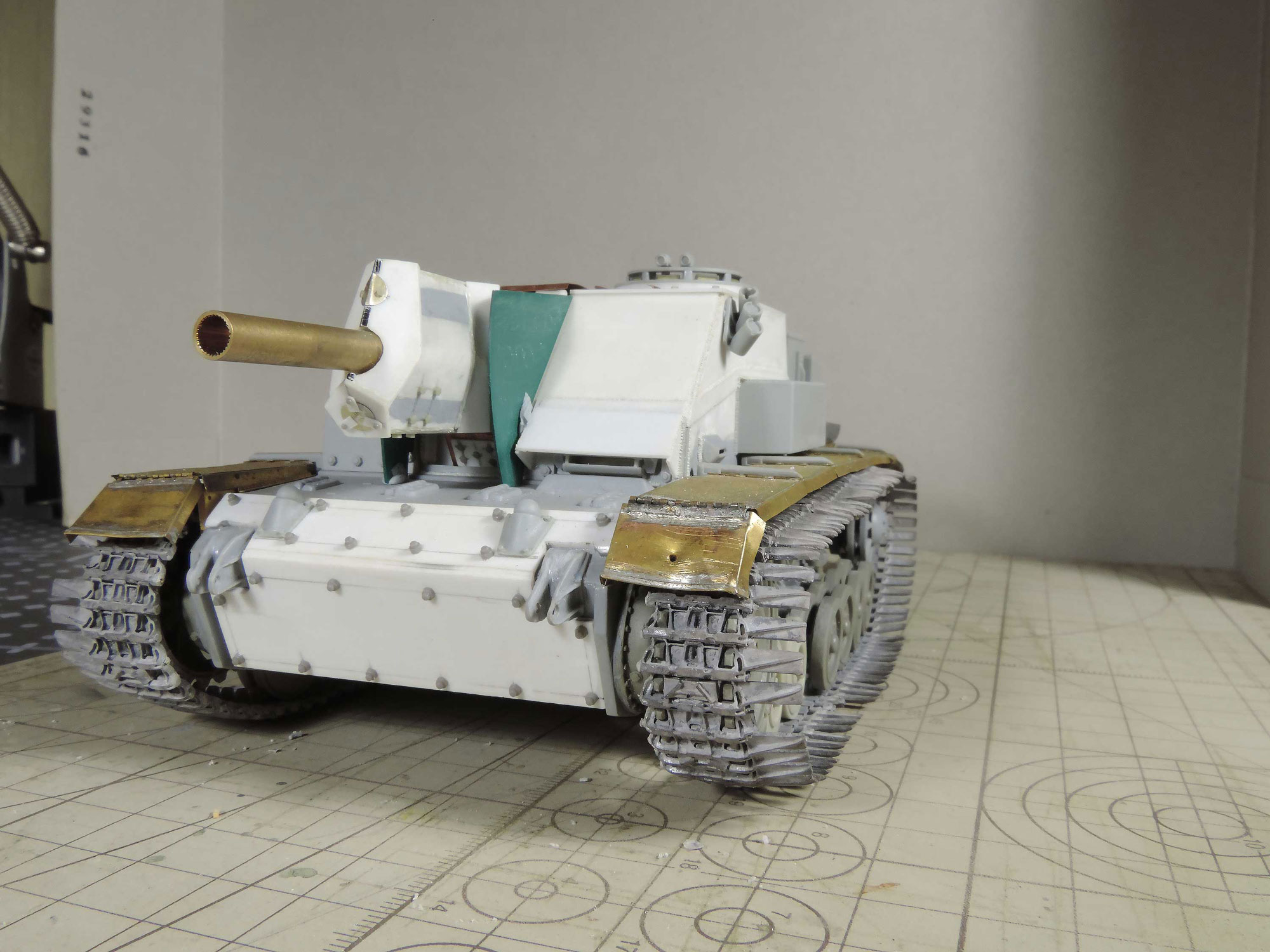 -пришла идея навесить сетчатые экраны, как на наших Т-34 в Берлине, но это решится тогда, когда будет в сборе корпус с рубкой, дабы представить как это будет выглядеть.