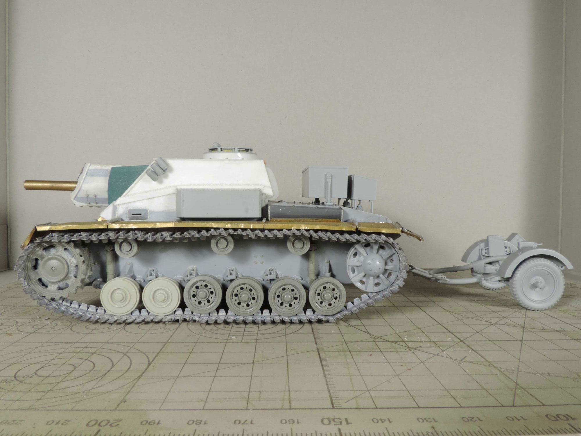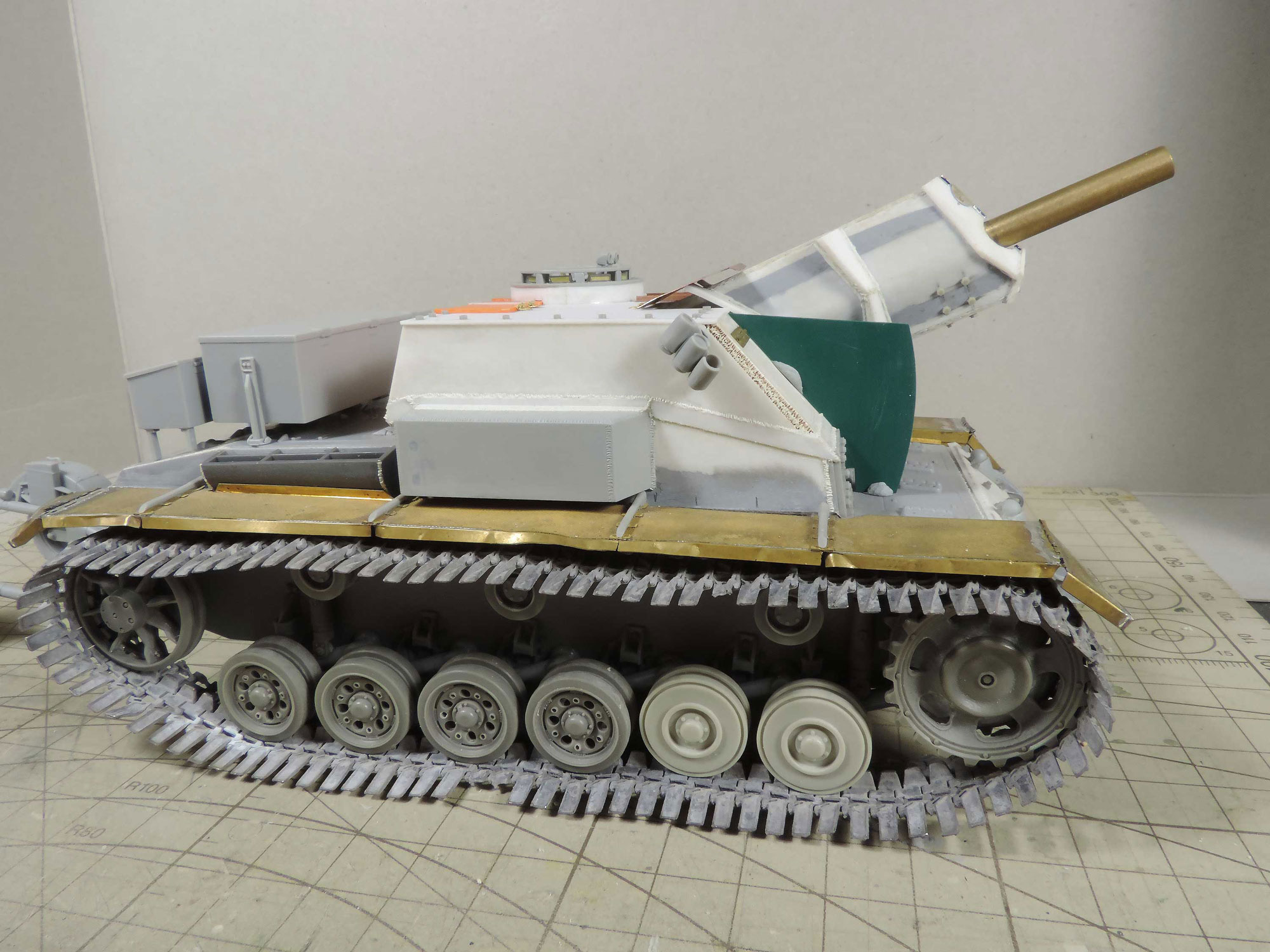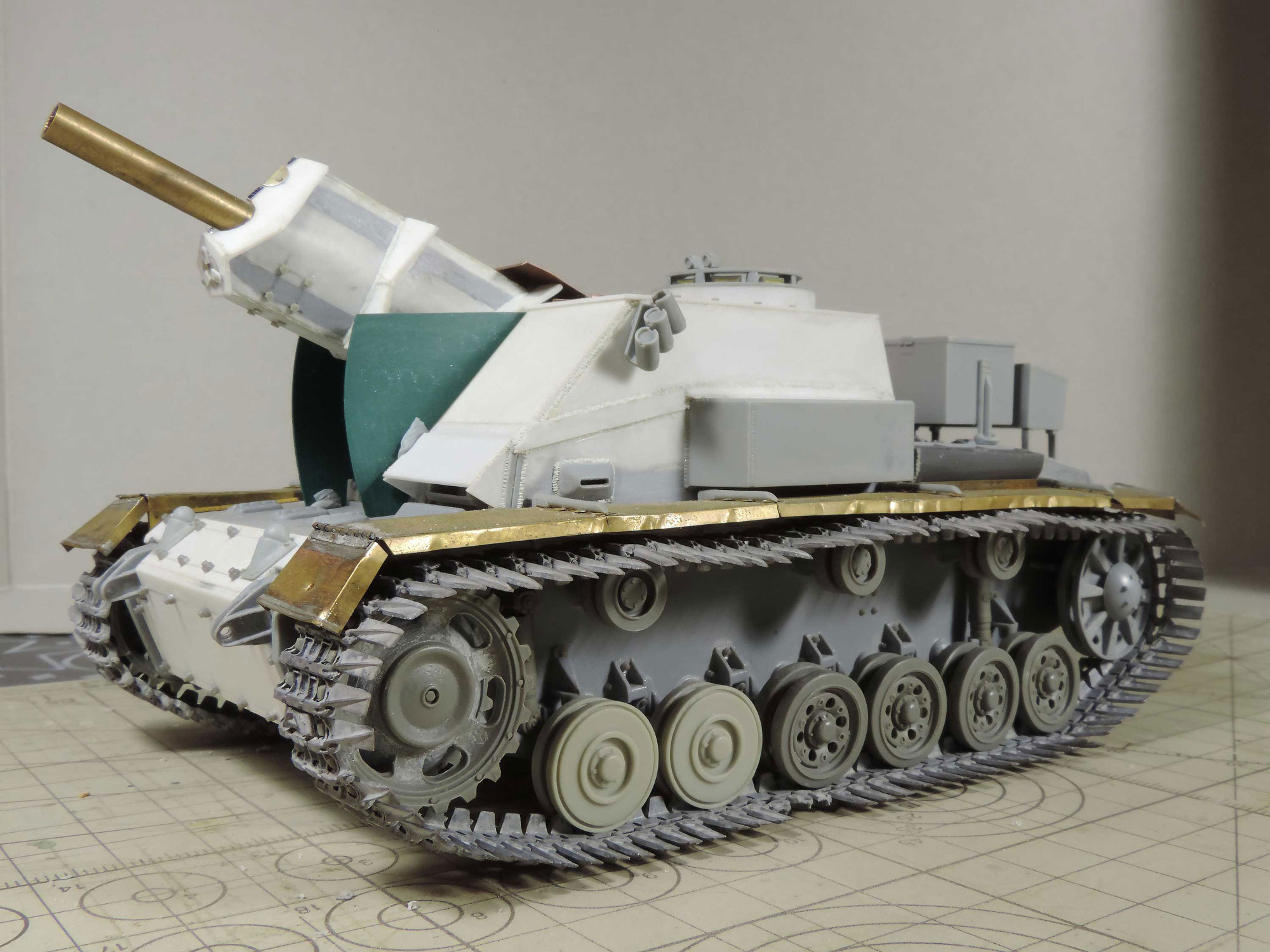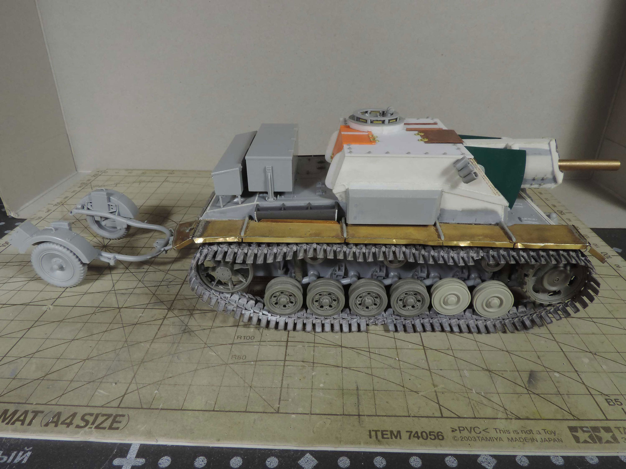-пришла идея навесить сетчатые экраны, как на наших Т-34 в Берлине, но это решится тогда, когда будет в сборе корпус с рубкой, дабы представить как это будет выглядеть.