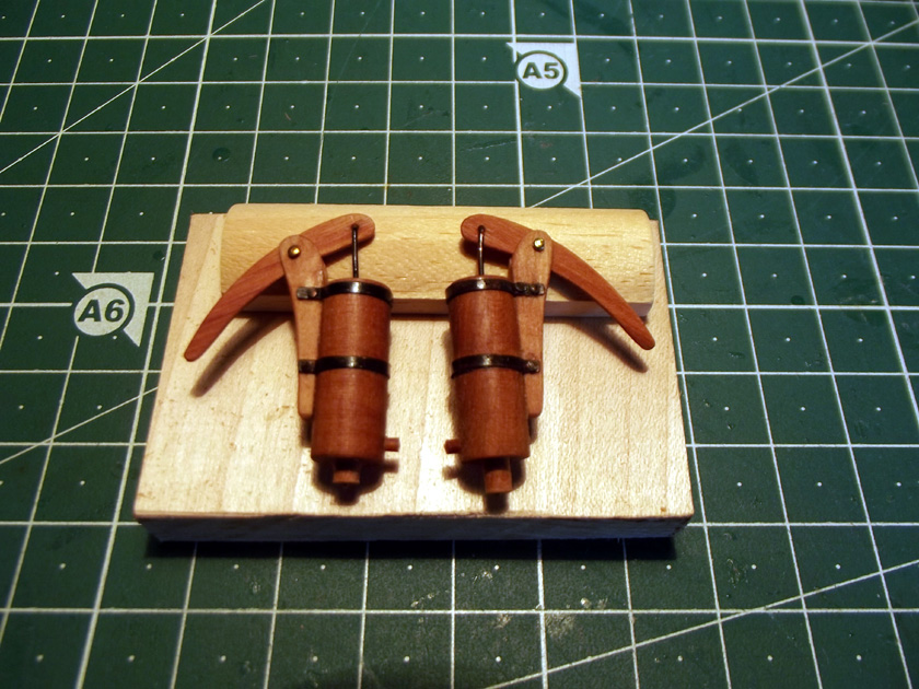 Всем привет! Продолжаю заниматься мелочёвкой на палубу. Изготовил большой и малый мачтовые битенги, якорный битенг и пр. с кофель-нагельными планками. К планкам наточил нагели. Всего заготовил 70 шт нагельных близнецов. Рядом с битенгами лежит "исходный материал" для нагелей.