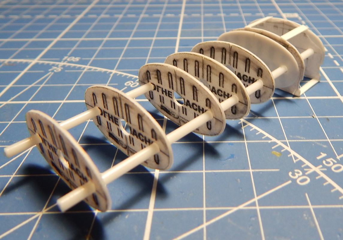 Распечатал шаблон овала цистерны, наклеил на пластик, стянул болтами ребра, обтачил до нужной форма и размера, после чего на пластиковых направляющих наметил место каждого ребра (в те места где будет необходима дополнительная жесткость) и приклеил сами ребра,  дальше все обклеил одним листом пластика толщиной в 0,25мм... по другому не получалось сделать цистерну нужного овала...