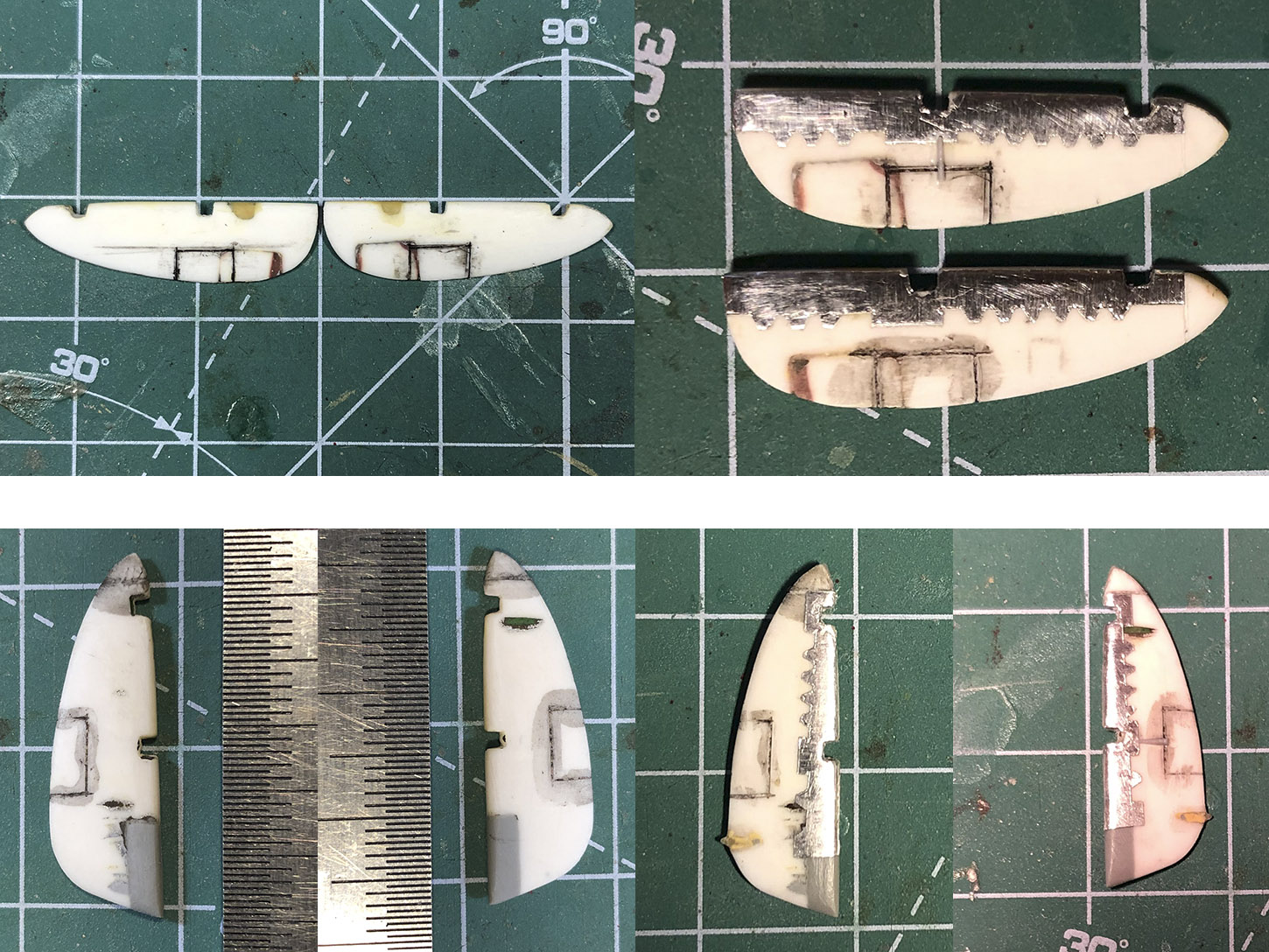 Сделал зализы на стабилизаторах и киле из фольги. Для их стыковки методом подбора пришлось вырезать кусочек интересной формы. Вспомнил занятия по аппликации в детском саду