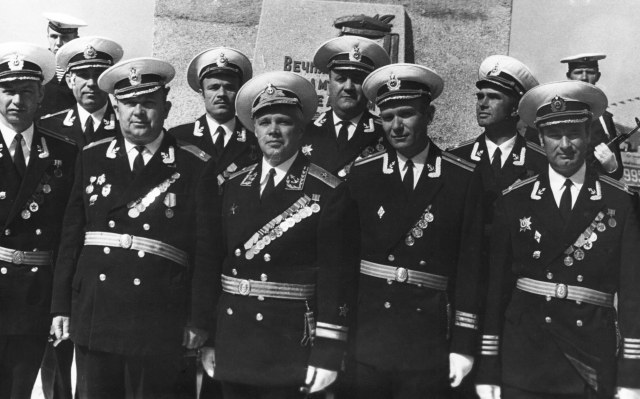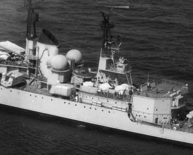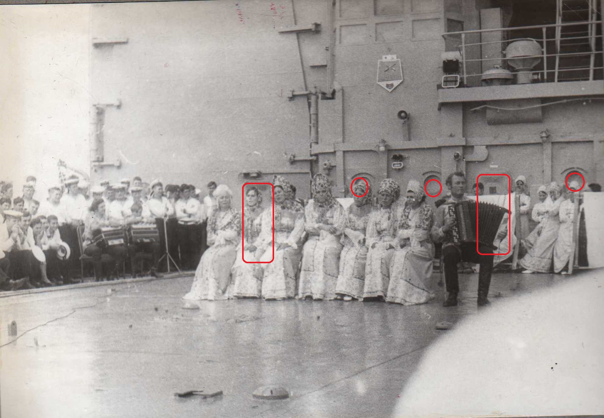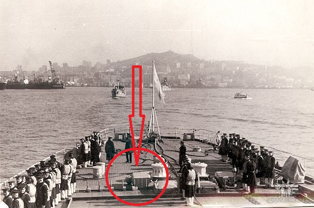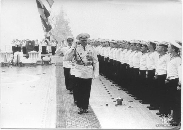 при сильном увеличении похоже что командир Плахов...... хотя есть и вероятность ошибки. Если угадали то фото можно датировать осень 1977 или весна 1975. Форма при построении №4 бушлат бескозырка. Осенью 1975 Плахов был понижен в должности и ушел с мостика.