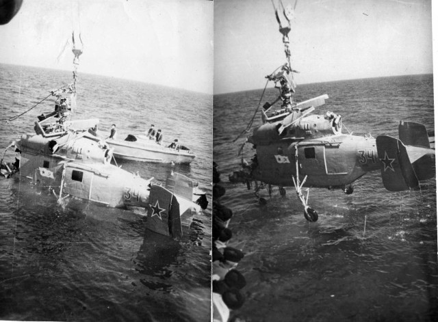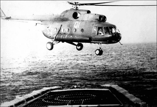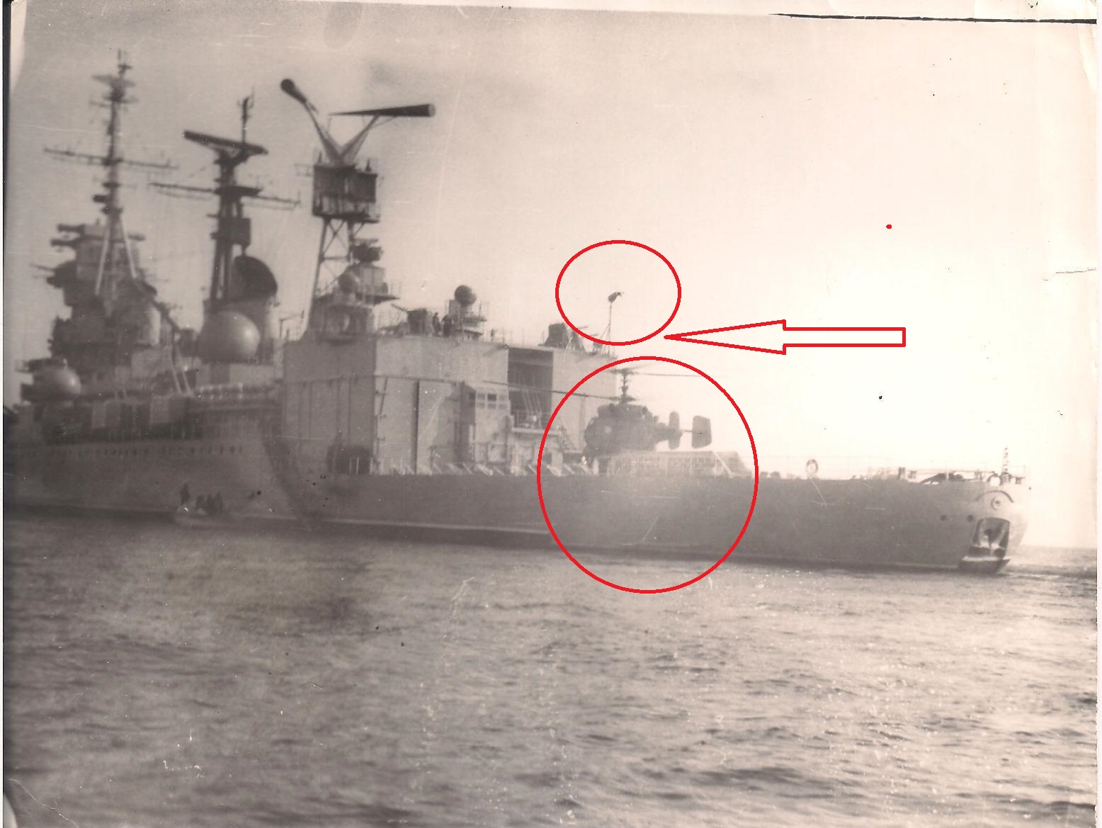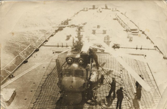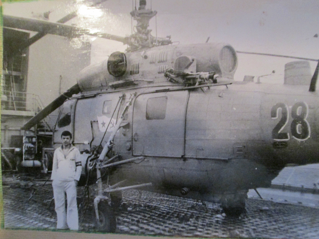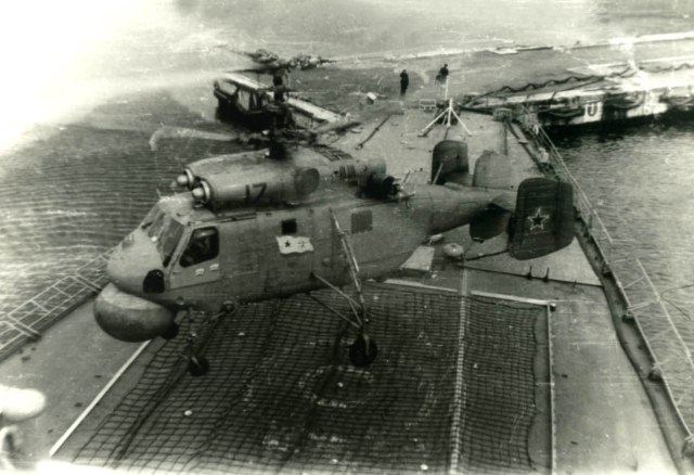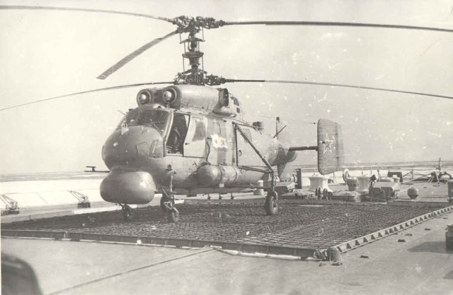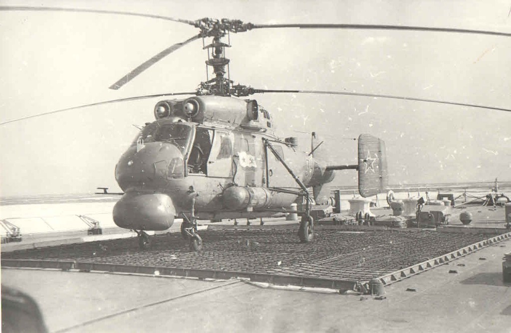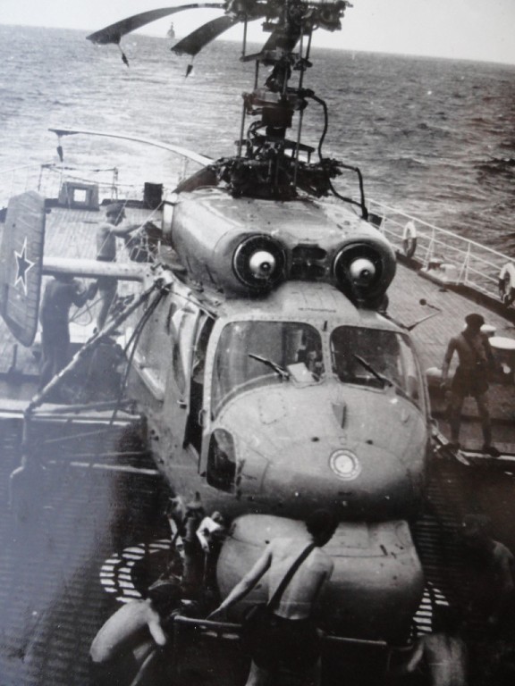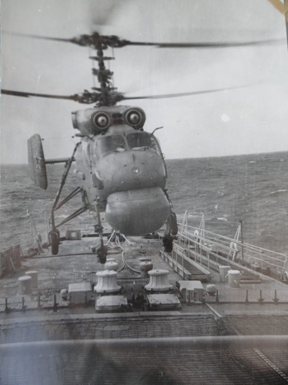 Вот Вам фото стрекозы Сени. И при заходе и просто на хранении. В ангар вмещалось две стрекозы, но как правило на борту была одна, да и то не постоянно, только для отработки задач. Леер заваливали по разному, что хорошо видно на снимках. Все зависело от погоды и какой был ход корабля. Было единичное исключение из правил. Стрекоза стартовала когда стояли у пирса. Поднялась зависла, развернулась в сторону правого борта и ушла в свою стихию. С правого борта акватория была всегда чиста до берега, а вот с левого борта стояли соседи и плотно.
