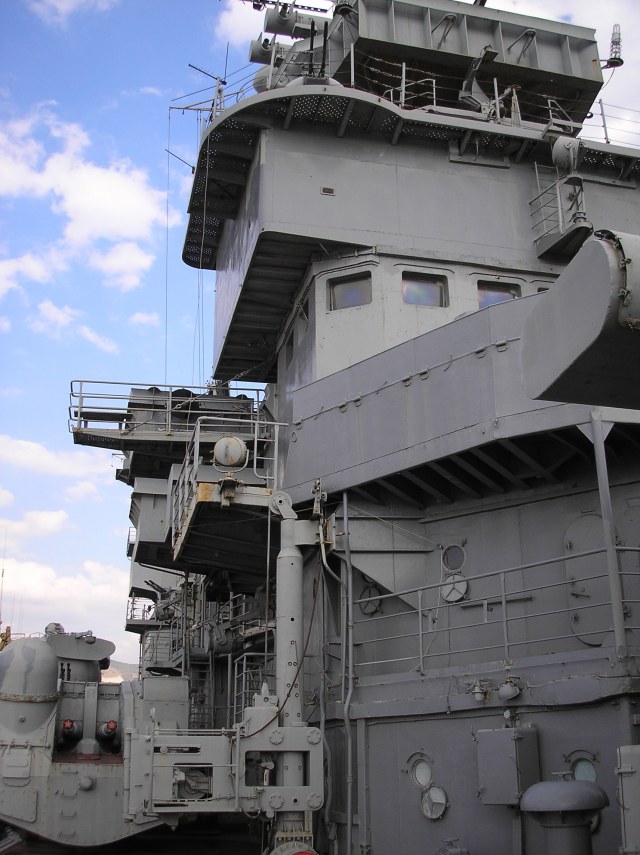 ангар очень узок. По правому борту проход шире и намного, так что Короб ангара слегка смещен к левому борту. Стрекоза на снимке в висячем положении, это видно по лопастям винтов стрекозы. Сходня (трап) хорошо видна на фоне стрекозы и подтверждает утверждение - Вертушка еще не коснулась палубы