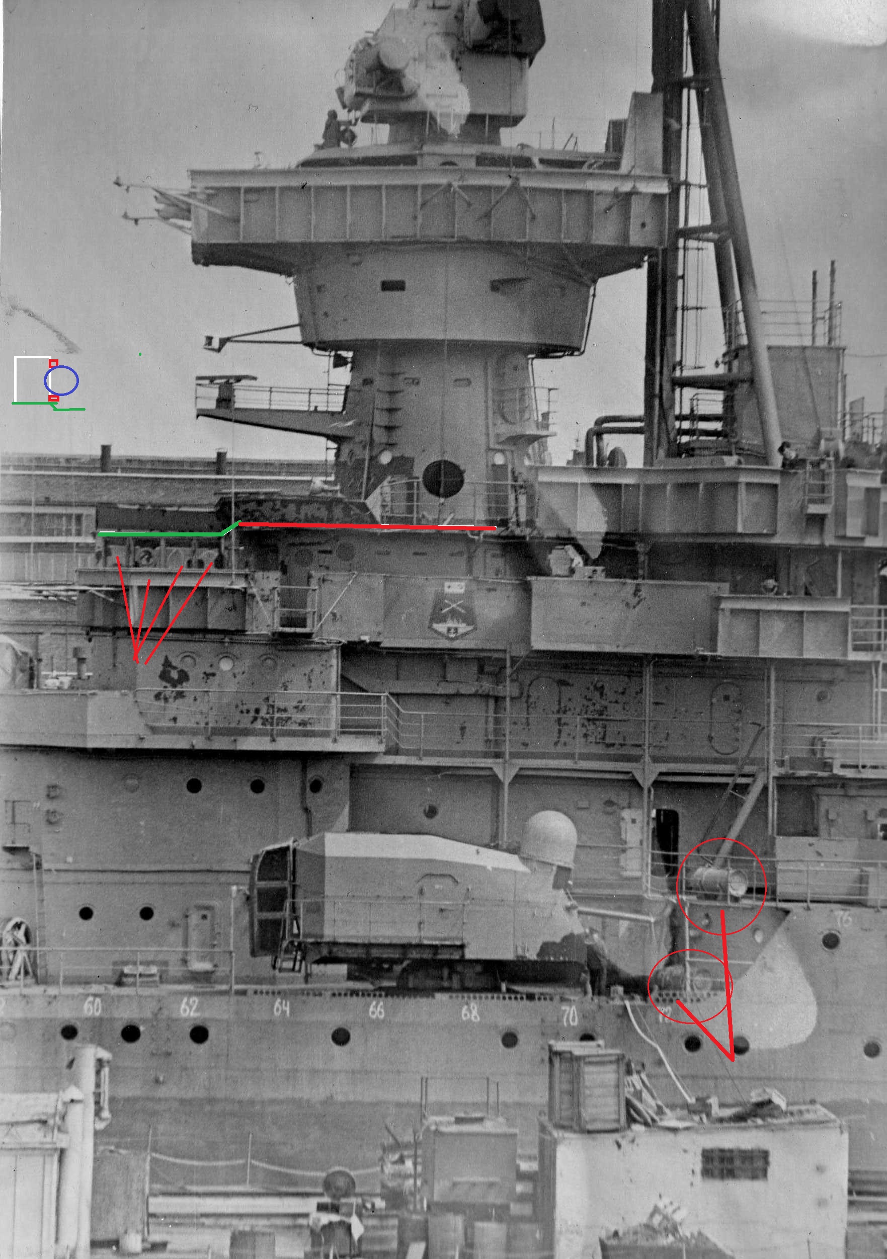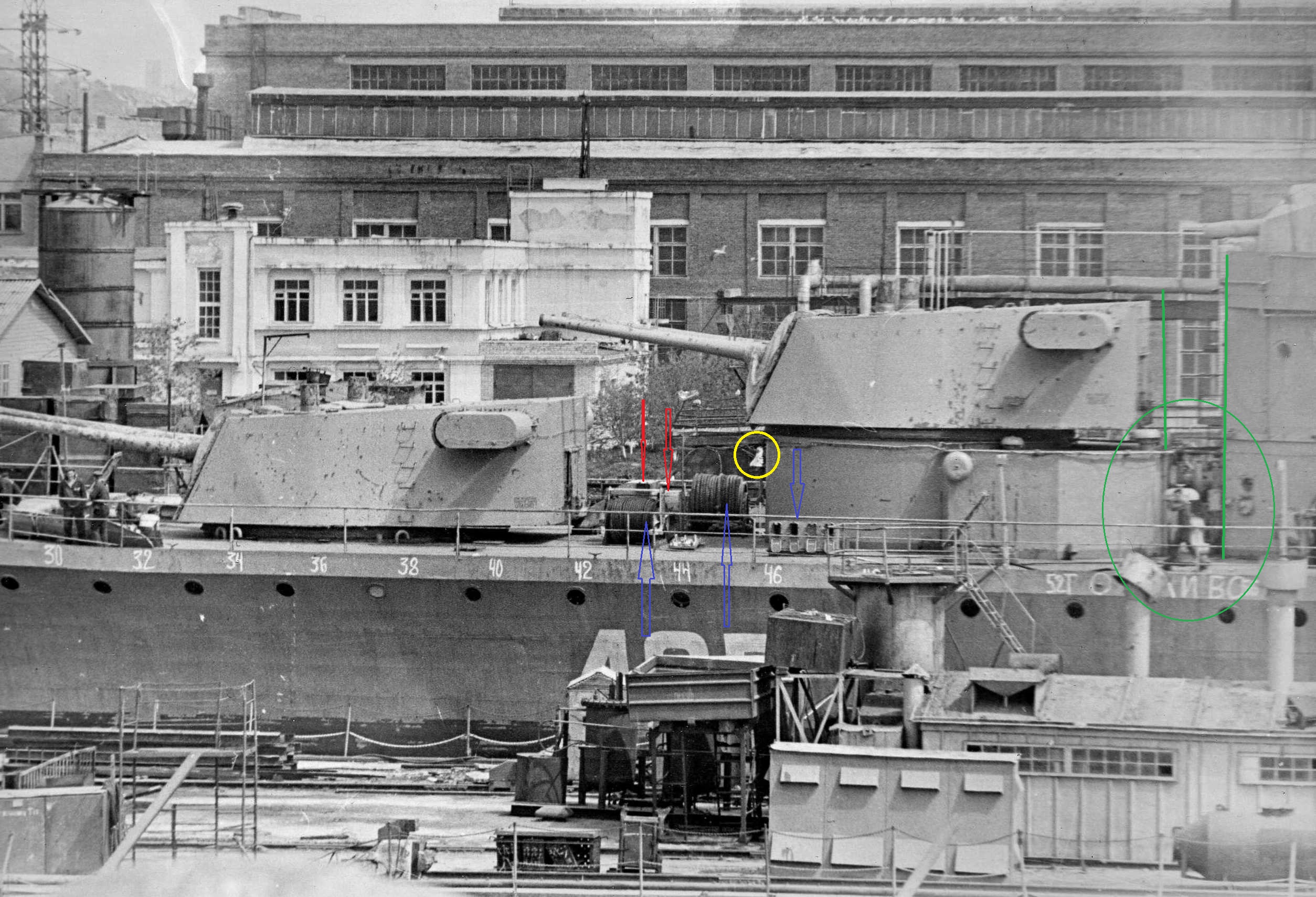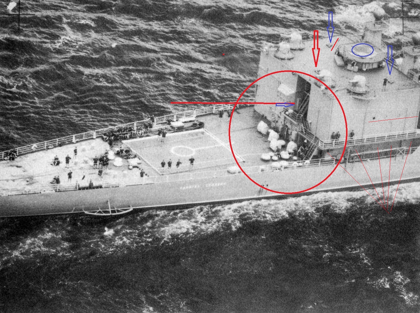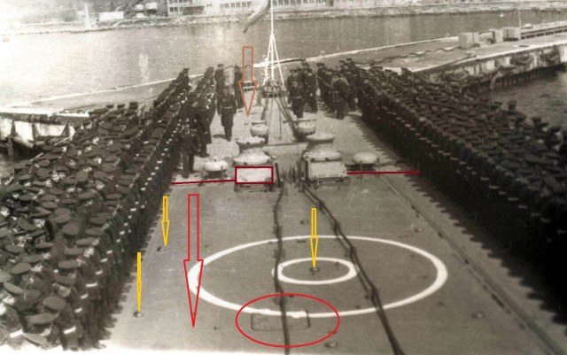 Внимание!!! бочки на верхней палубе ( заведование хим службы) там где ограждение винтов только по правому борту. Выход на площадку ангара где ака 230 красная стрелка. Поднимаясь на площадку смотришь на левый борт. Ограждение прохода буквой П, люки (синяя стрелка) в помещение погребов БЗ ака 230. Красный штрих это направление трапа на площадку ОСЫ. ее люк синий круг. Площадка Осы имеет леерное ограждение. У Жданова она ДРУГАЯ! Трап на палубу юта с правого борта смещен к ангару, площадка образует угол.