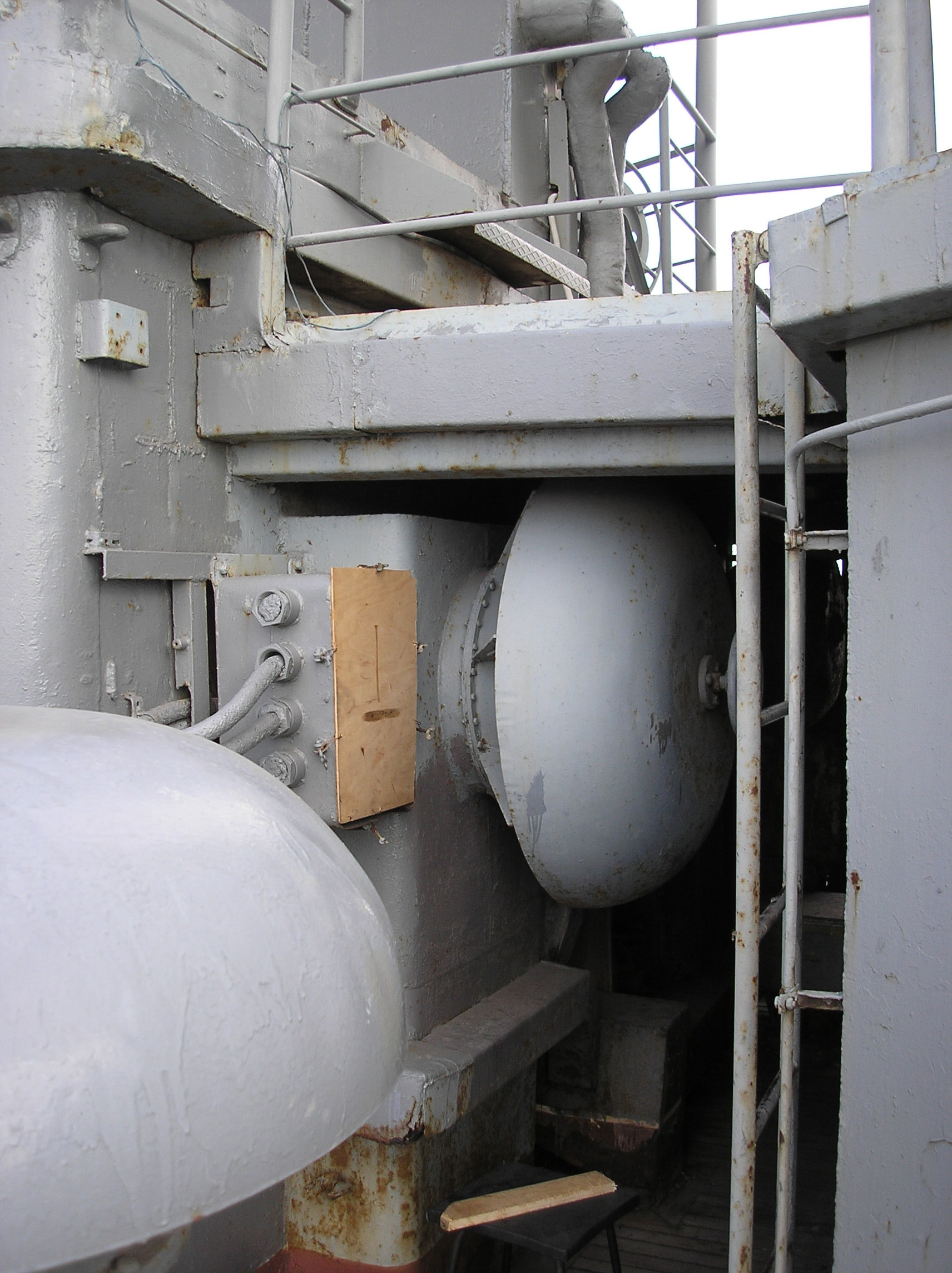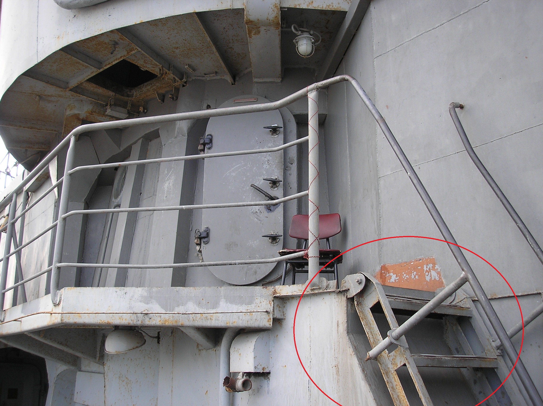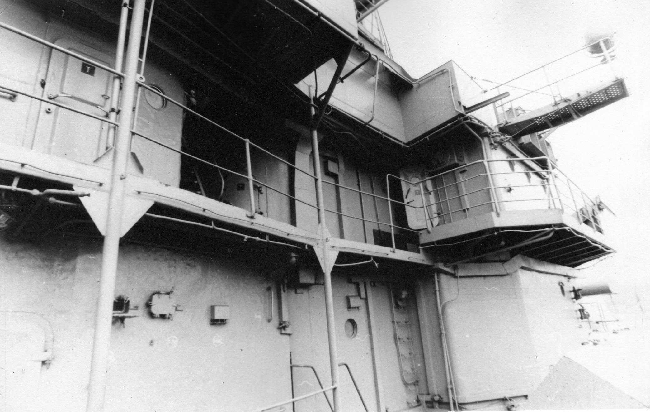 Нижний коридор у башни ДУК... Задрайка двери штурвал. При мне были просто две рукоятки с каждой стороны двери.... Дверь выше сквозной коридор на оба борта, так же возможность попасть через трап на офицерскую палубу. Автомат Веди -11 на площадке БИП, на Жданове выше на площадке. Характерный излом площадки сигнального...