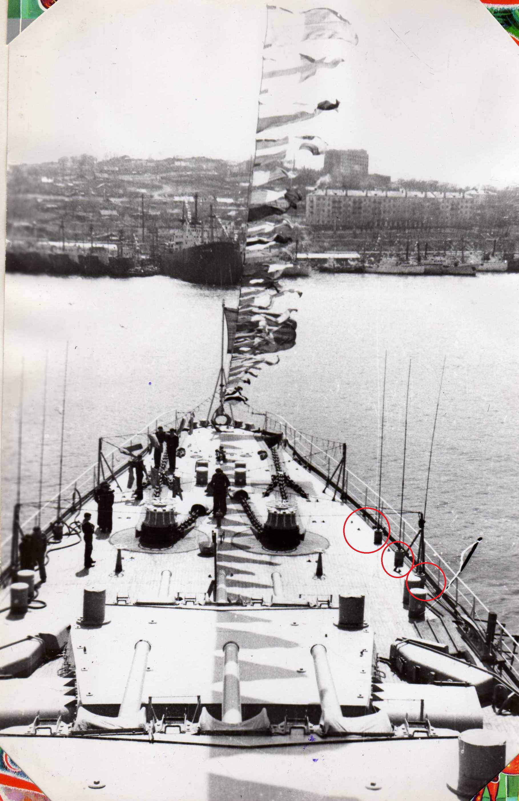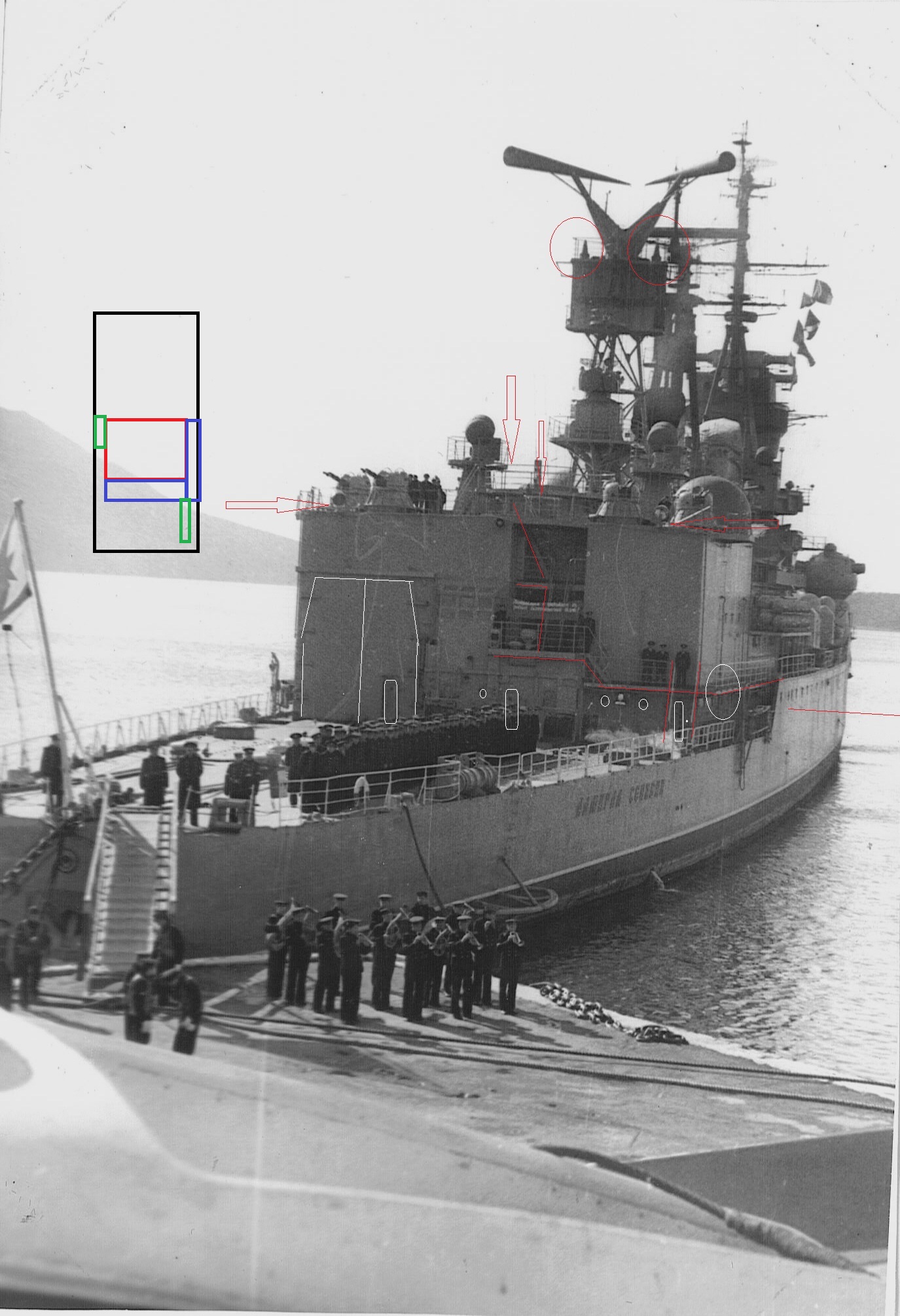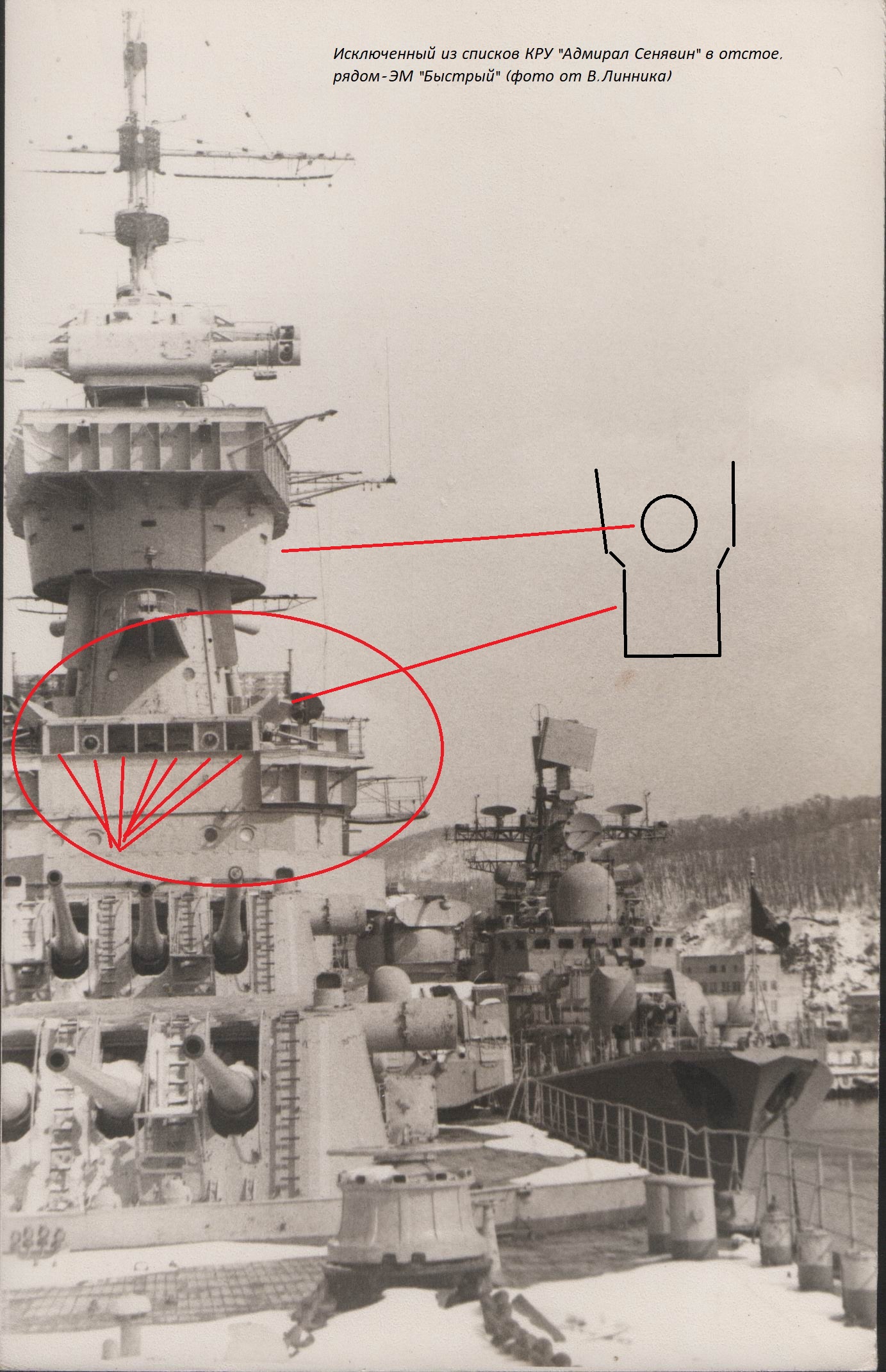про трап лишний тут тоже - вообще надсройки Сенявина и Жданова похожи относительно , нормальных фото гшде б видно было отсутствие трапа у Сени нет ....вот и решил что было как у Жданова ....а у Жданова он точно есть