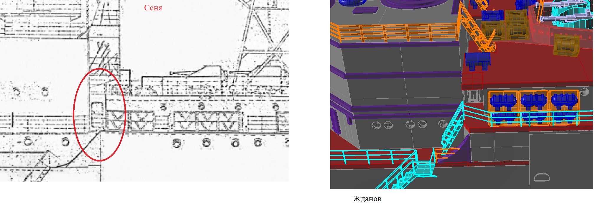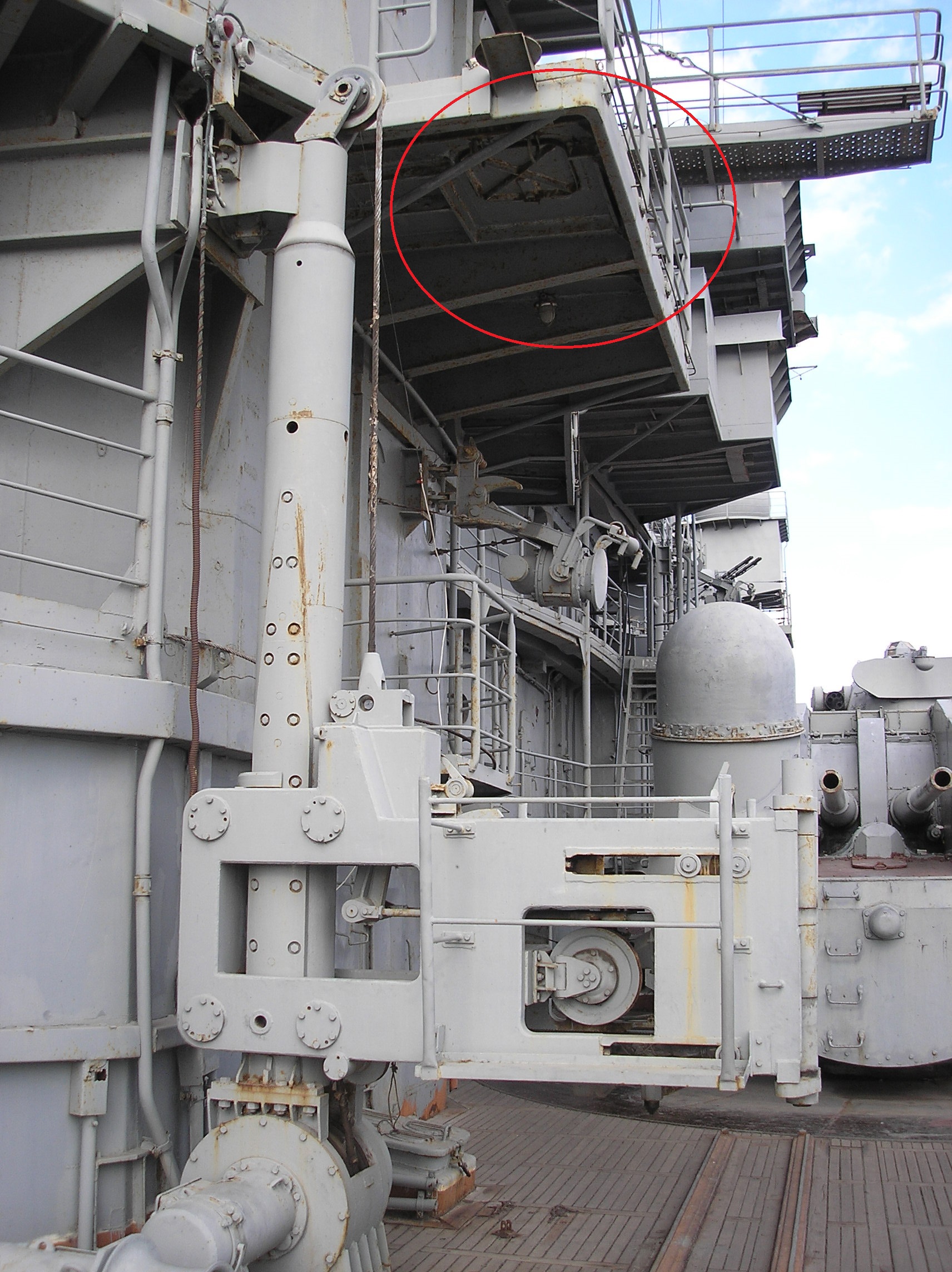 Кубрик машиной команды похож и очень как у нас. Ступенька и выход к кормовому эшелону. Плотики у ангара в сетках на верхней палубе, но проход там есть. У вас Алексей там как бы его нет. Хорошо проглядывается трап на верхнюю палубу с площадки куда выходит дверь кубрика. Так же видны пиллерсы под площадкой на которой расположены фундаменты шариков. В последствие шары перенесли на другое место, но конструкция фундамента осталось не тронутой. Также хорошо виден подиум ОСЫ. Он совершенно другой на Жданове.