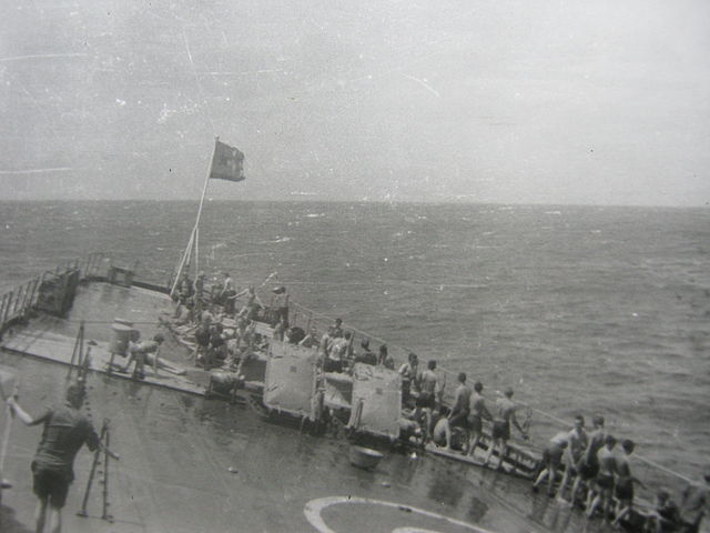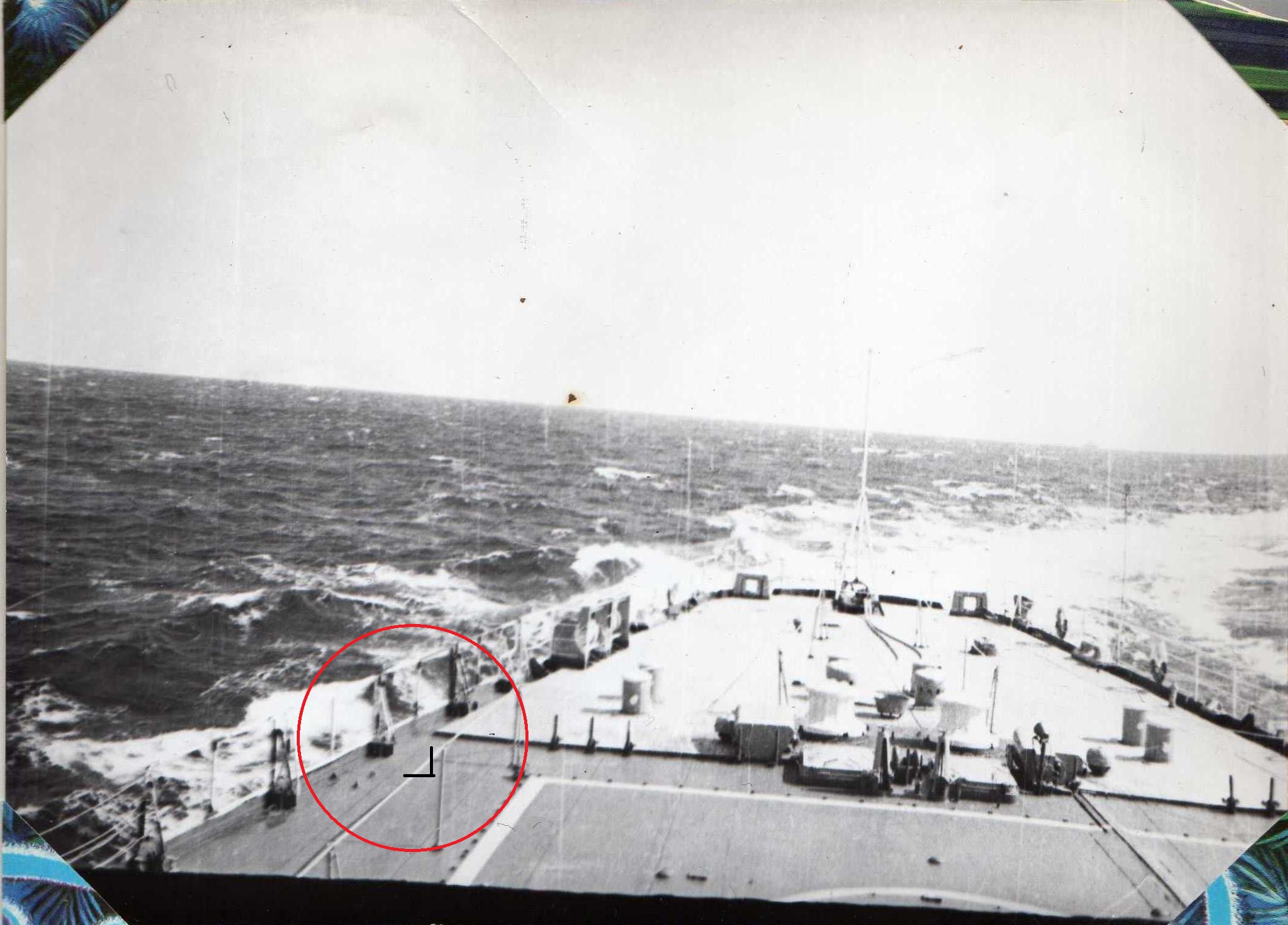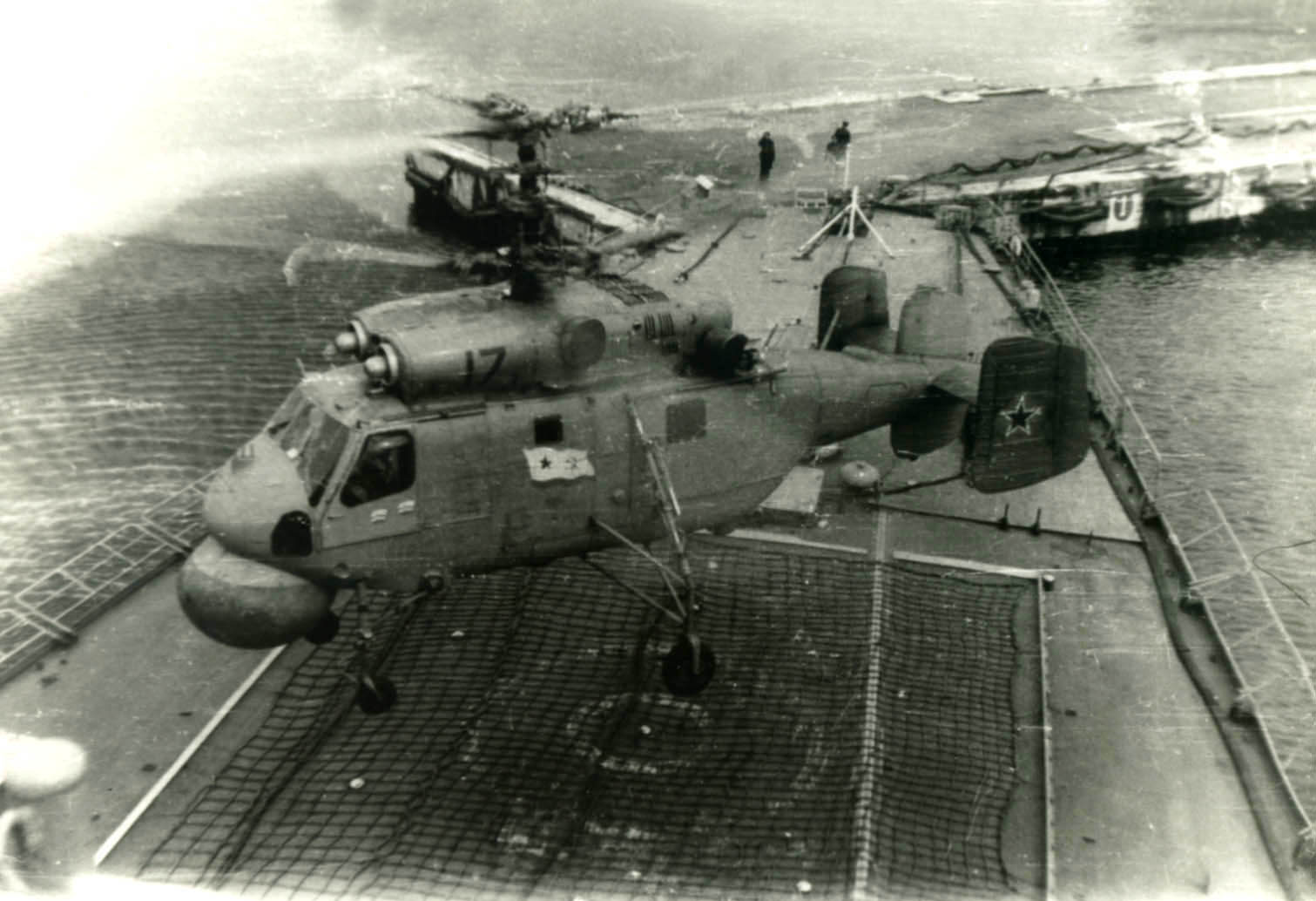 На предыдущем фото виден "Колдун" или конус. Прием стрекозы дело хлопотное, корабль шел против ветра, но не четко по направлению. По конусу опытный экипаж определял как и ход корабля так и ветер, его направления. Чтобы более точно подсказать с какого борта ветер, конус ставили с того борта куда дует ветер. На прошлом снимке ветер с правого борта . Тут конуса нет. Сеть для стрекозы растягивали только при приеме, потом убирали вместе со стрекозой в ангар. Иллюминаторов по левому борту на переборке ангара не было!. По правому борту иллюминаторы были как и под навесом площадки (Три фигуры) так и выше где то на уровне автоматной площадке.