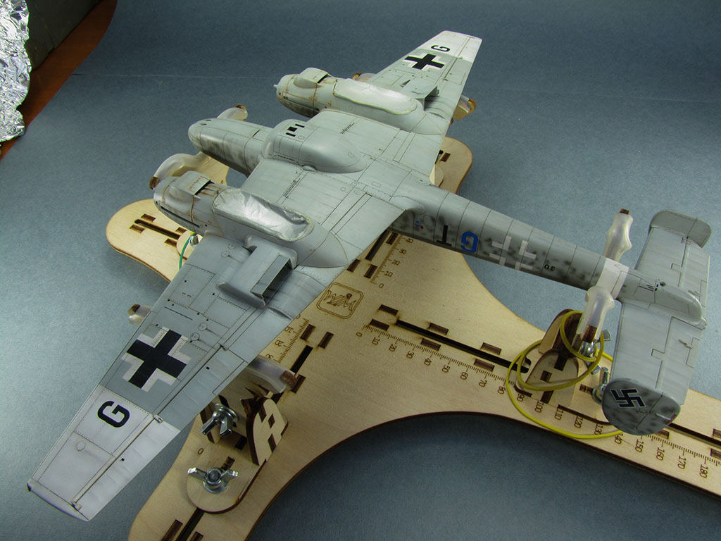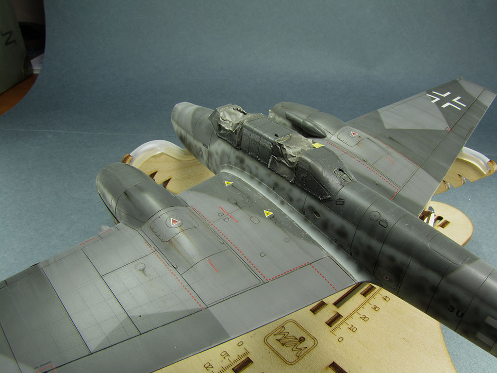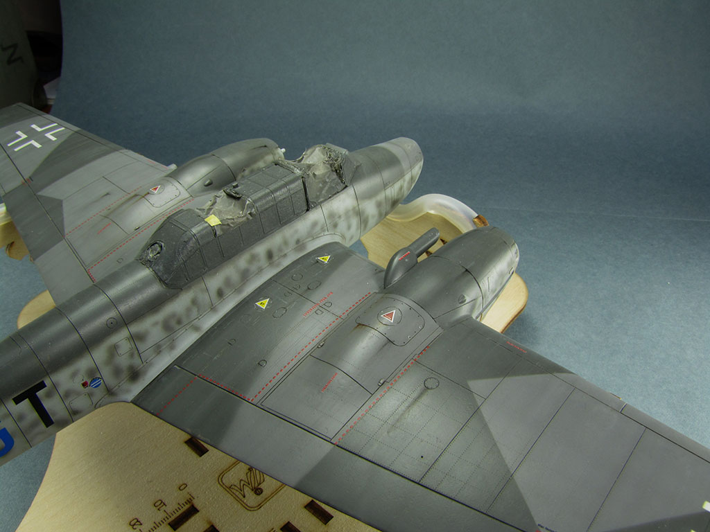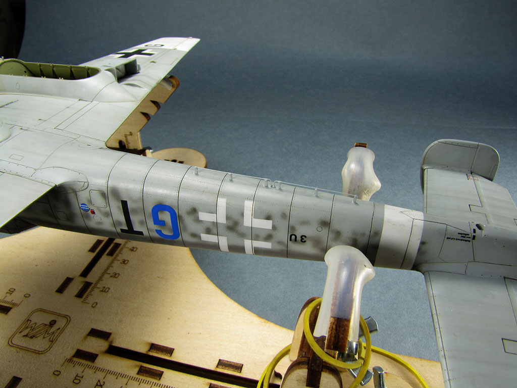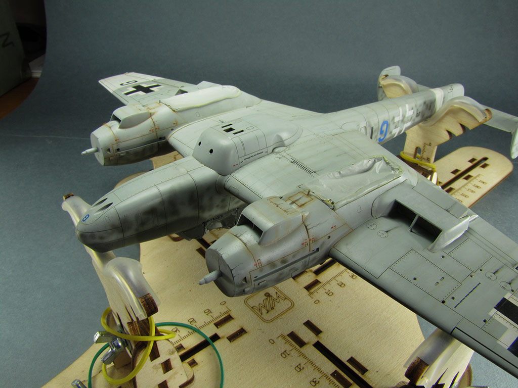 , потеки эксплуатационных жидкостей (масляные краски, акварельные карандаши), выделил стык панелей мотогондол снизу (пигменты), небольшой обдир краски сверху на центроплане (акварельные карандаши).