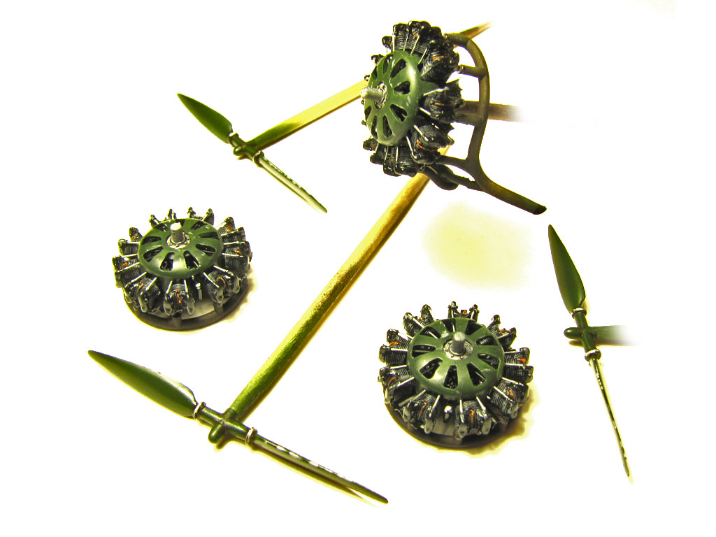Ну, отпуск, как и все хорошее, когда-нибудь заканчивается, поэтому продолжим. На данный момент установлена крыша салона, склеены плоскости, сделаны двигатели и винты. Окончательная сборка винтомоторной группы будет производиться после сборки и установки капотов. С моторами пришлось повозиться- так как Вектор дает только картер и "горшки", то сделаны толкатели, проводка к свечам, какие-то кожухи с задней и верхней частей двигателей. Также переделан выхлопной "паук" на центральном двигателе, снизу он там вообще неправильный. На винтах переделаны коки. Толщина кожухов на картеры сточена бормашиной до масштабной.