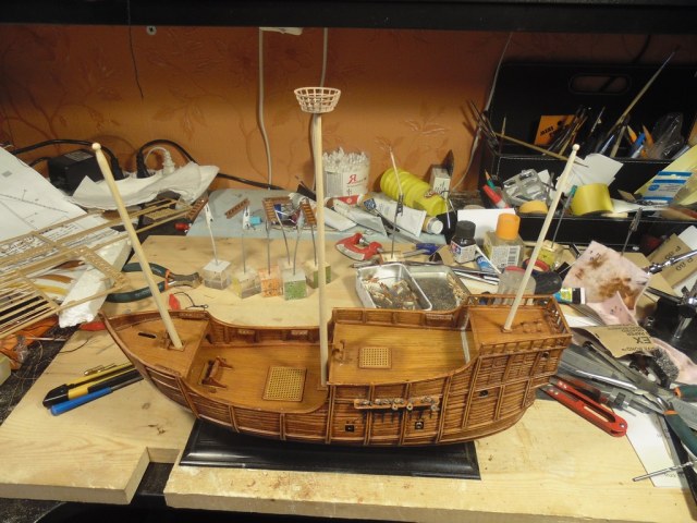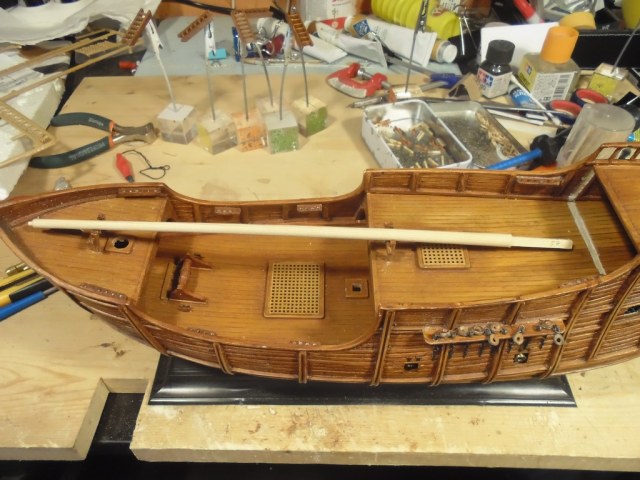 Установил две стойки для крепления такелажа на палубах.