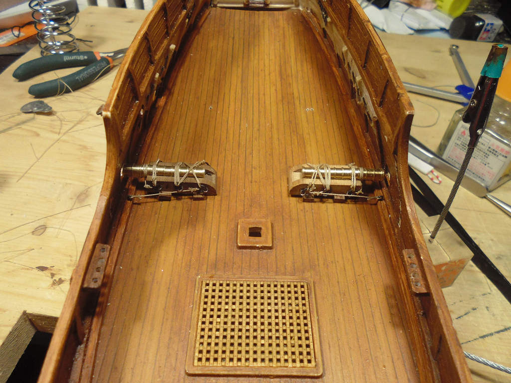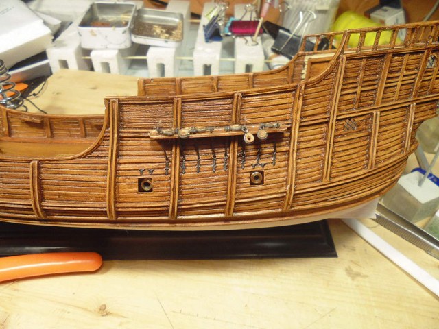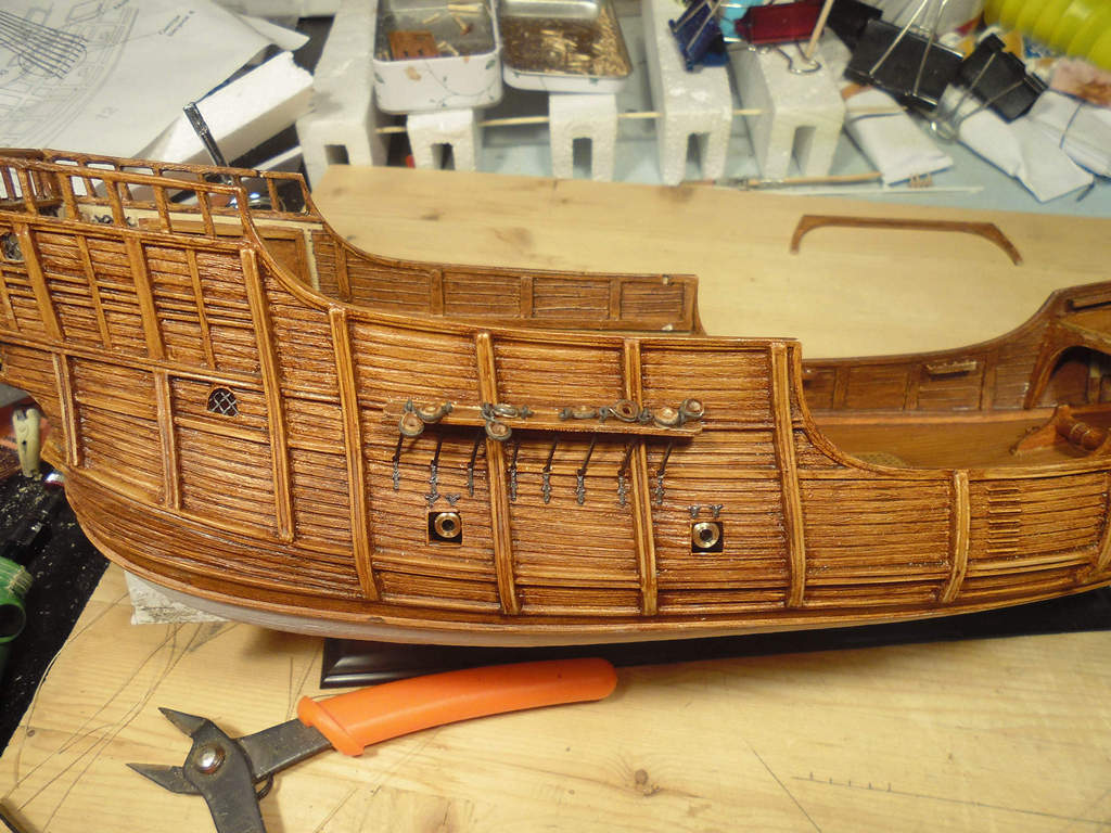 Покрасил на бортах окончания вант-путенсов и петли люков пушечных портов.