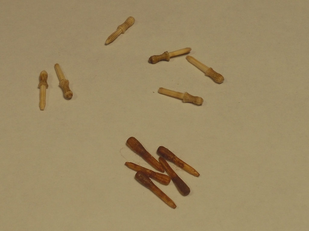 Как бы то ни было, я внял критике и попробовал сделать нагели примерно по чертежу, представленному @Владимиром. И вот что у меня получается. Жду критики, поправок или одобрения строгих коллег, пока не напилил все 54 штуки.