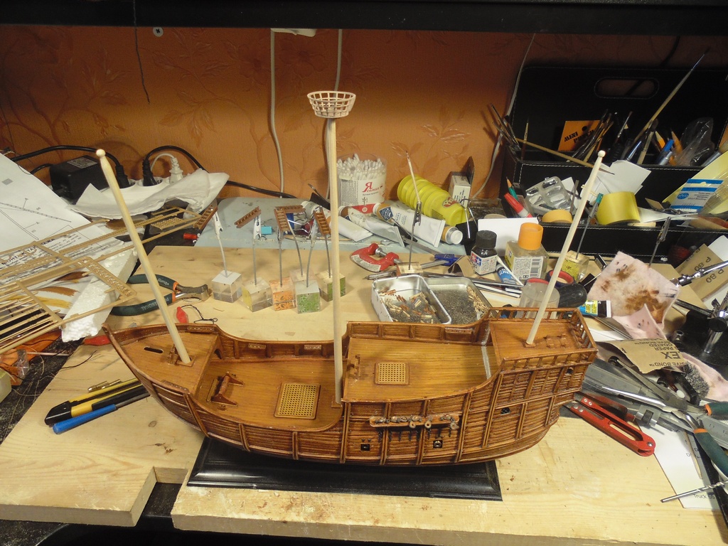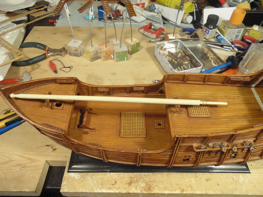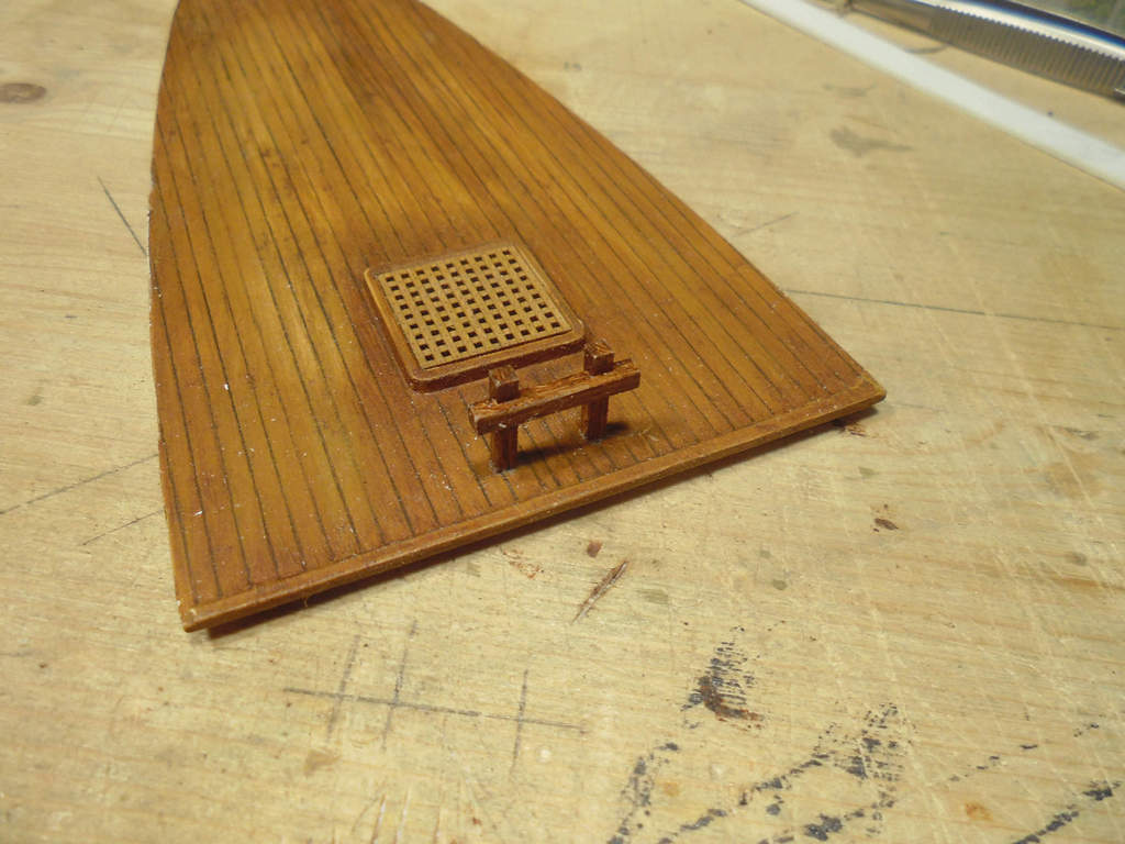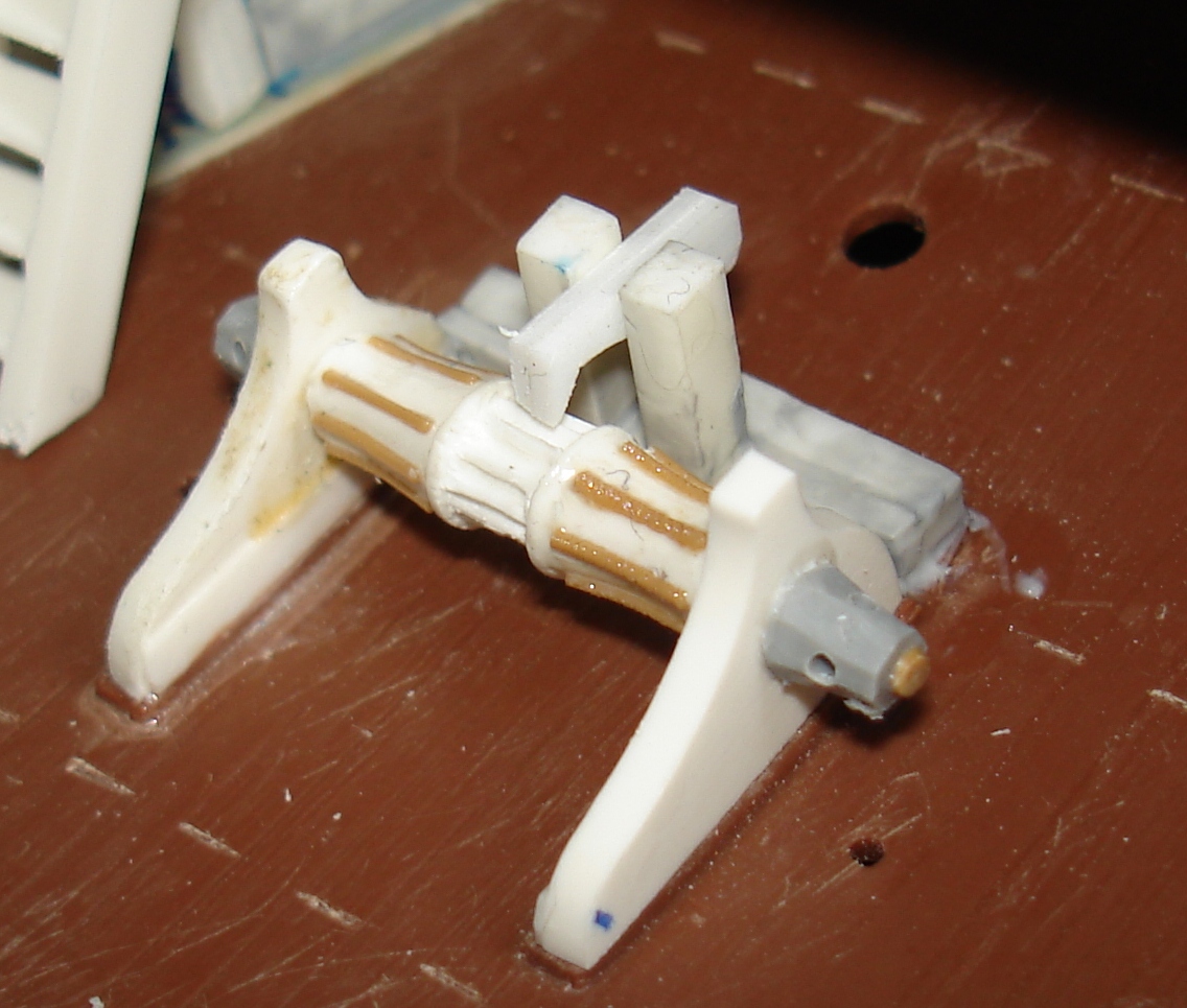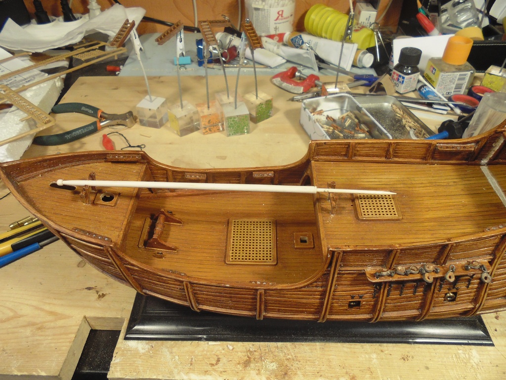 Выточена из маникюрной палочки (заявлена аж корейцами и аж как апельсиновая древесина). Наращена снизу зубочисткой. В палубе полубака просверлил отверстие для точного позиционирования мачты. Размеры тоже выдержал к пластику.