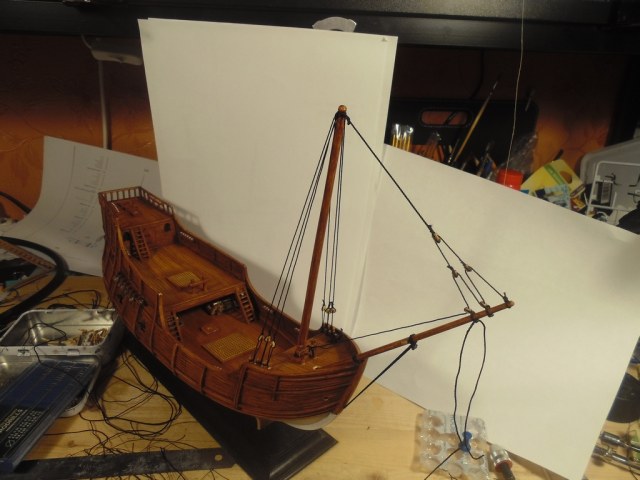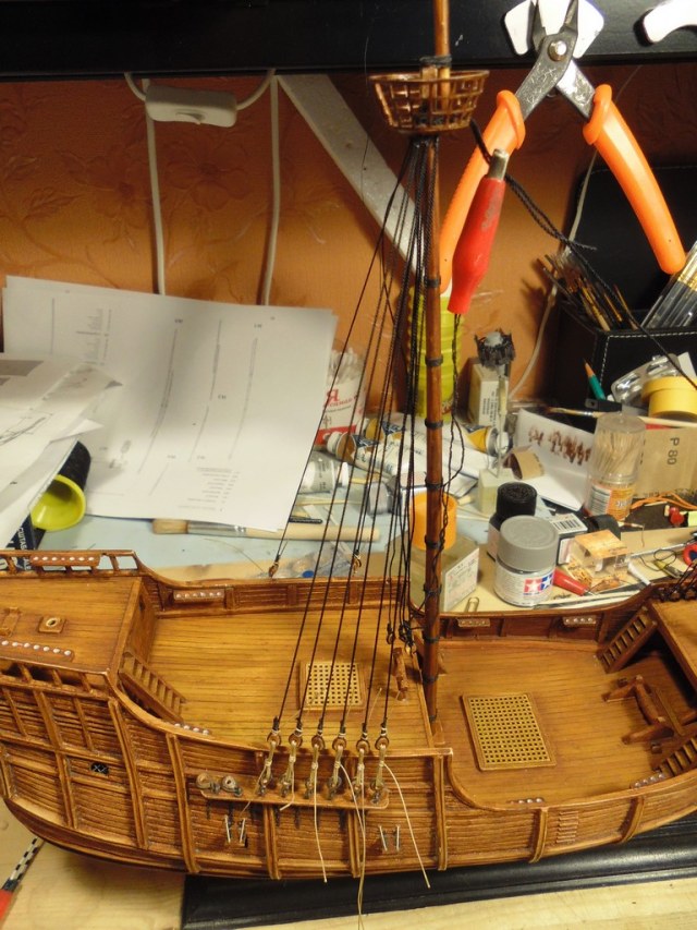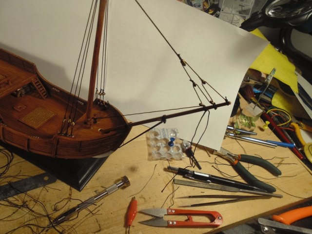 Установил фок-мачту и бушприт. Набил фордуны фока, ватер-бакштаг, и фока-штаг.
