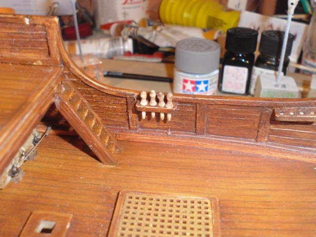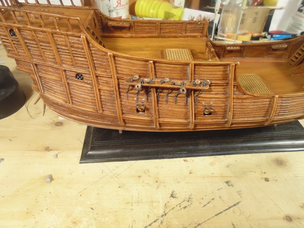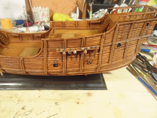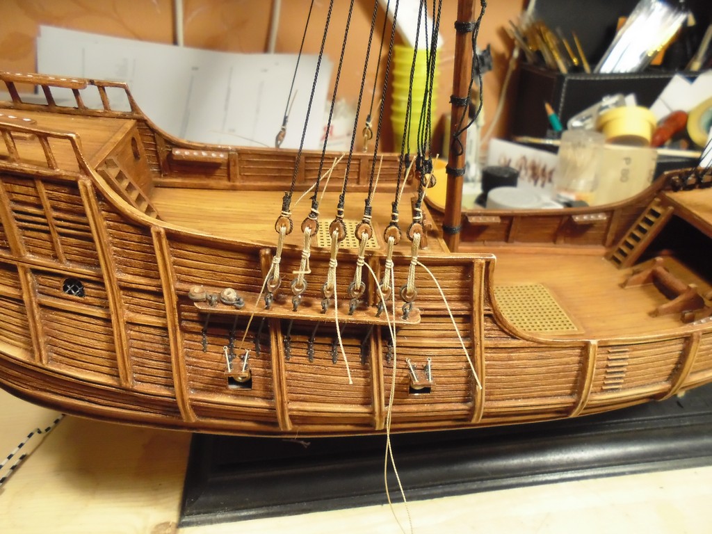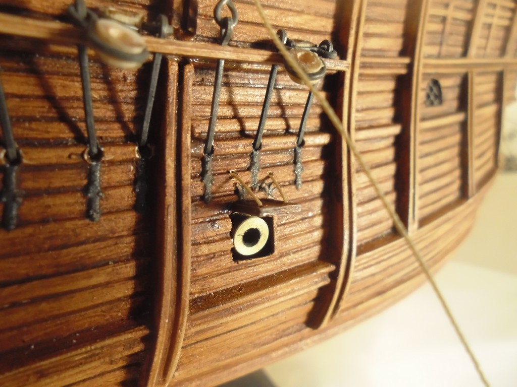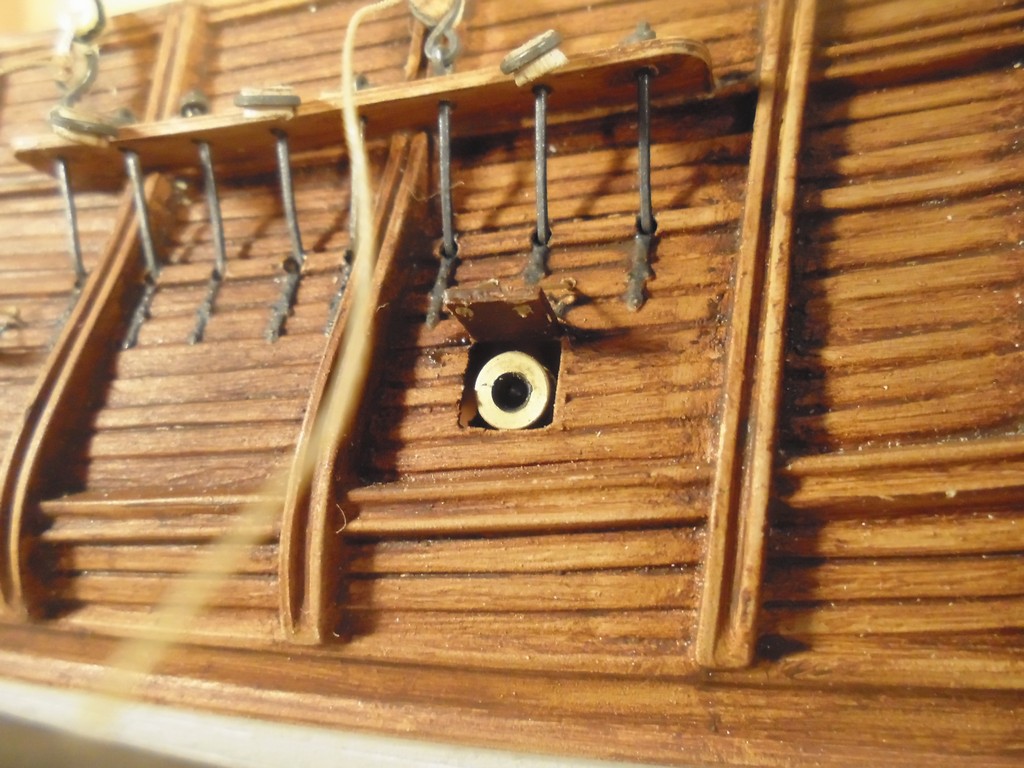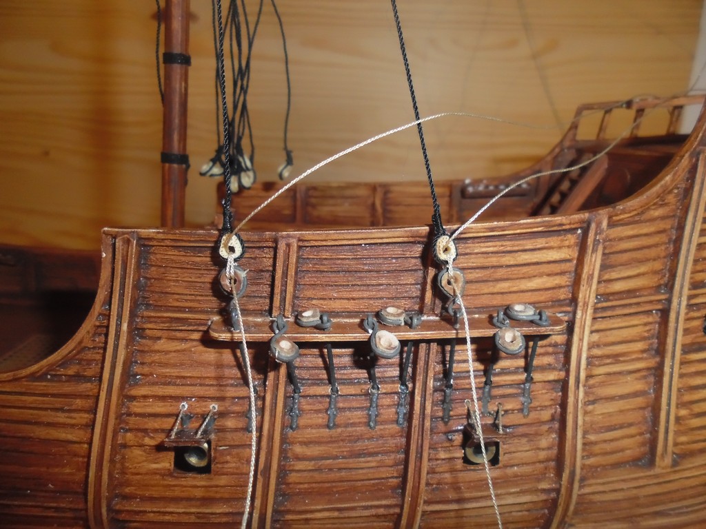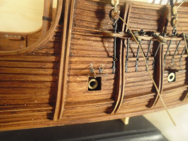 А пока обдумываю конструкцию, сделал подъёмные канаты на пушечных портах: