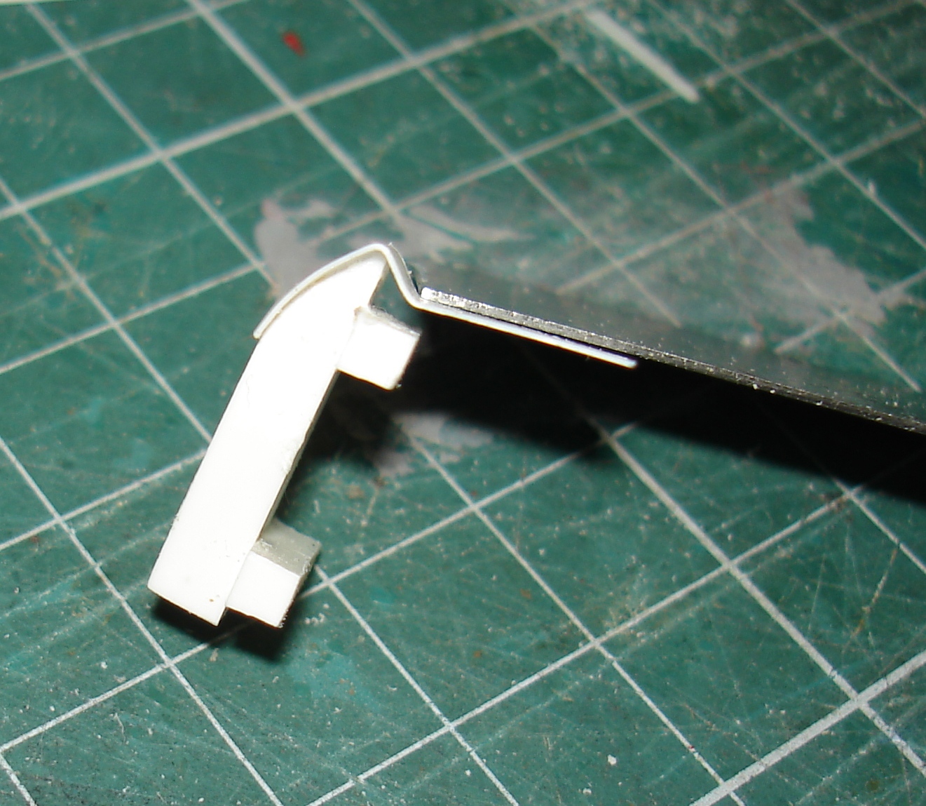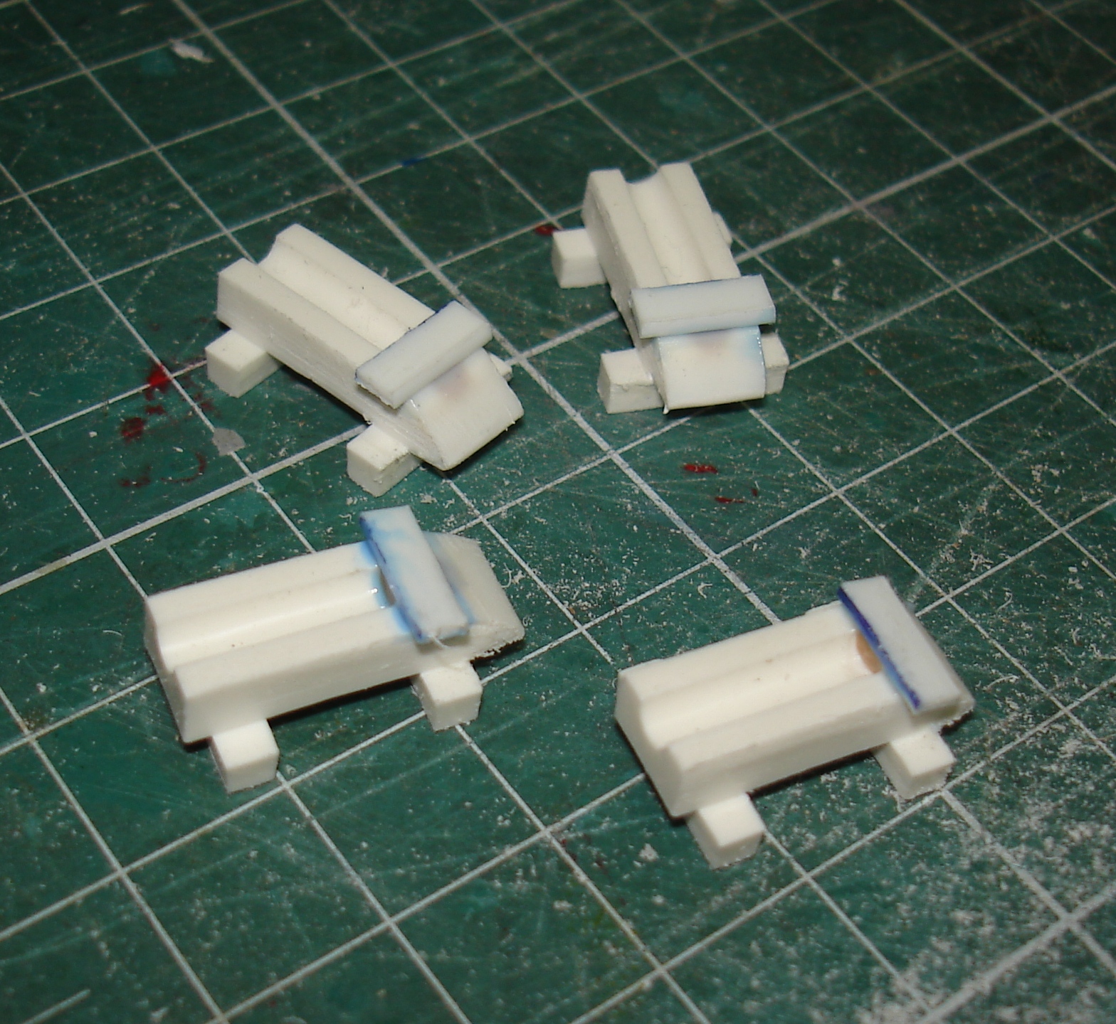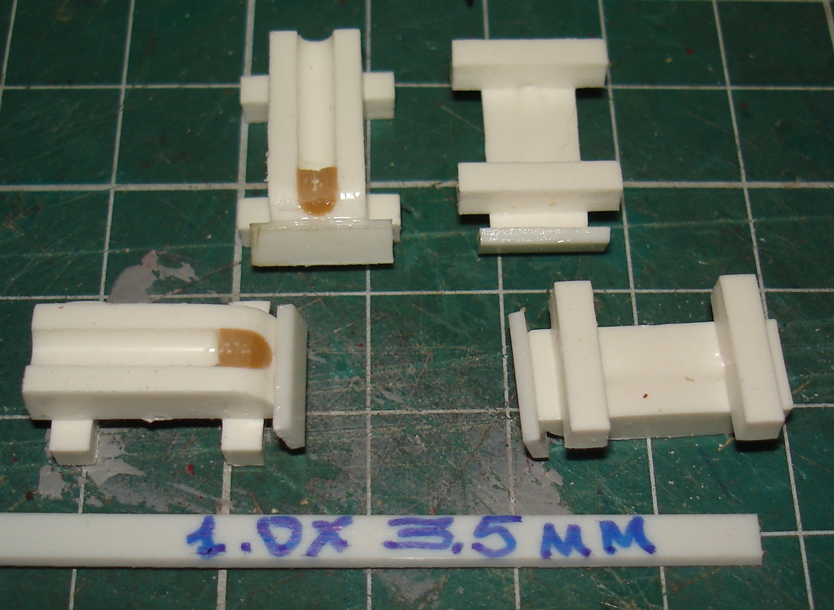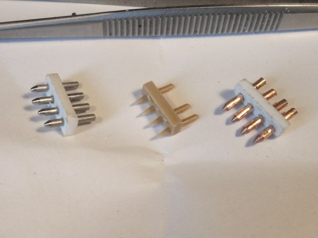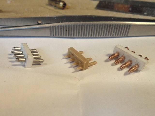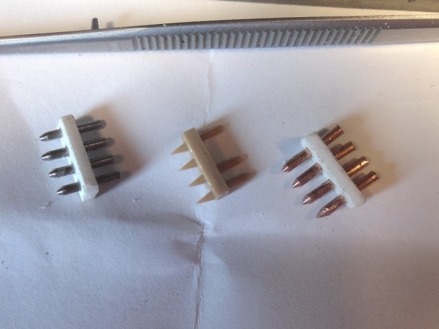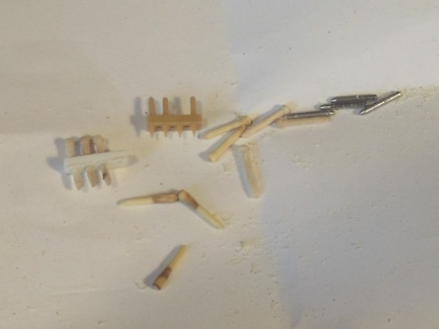 Слева пластик толщиной 1,5 мм и железные нагели (трудно обрабатывать железную проволоку и не хватает её мне). В середине из набора (чуть тронул и нагель отвалился). Справа пластик толщиной 1,5 мм и медные нагели (медная проволока мягкая и гнётся при обработке, но её навалом).