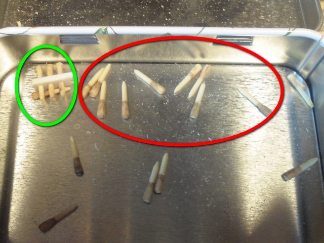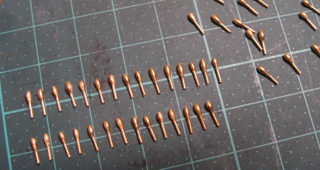 Была мысль использовать зубочистки. Но на штатной детали нагель диаметром 1,65 мм, а зубочистка 2 мм. Трудно для меня будет выдержать все 54 нагеля одинакового диаметра. Железная проволока диаметром 1,5 мм, а медная - 1,6 мм. Хотя можно взять медную чуток потоньше.