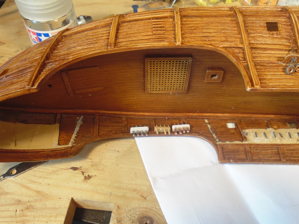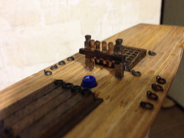 Теперь берусь за палубно-бортовую мелочёвку. Готов для сборки и установки якорная лебёдка (забыл как правильно называется, склероз, наверное). На очереди замена бортовых кофель-нагельных планок.