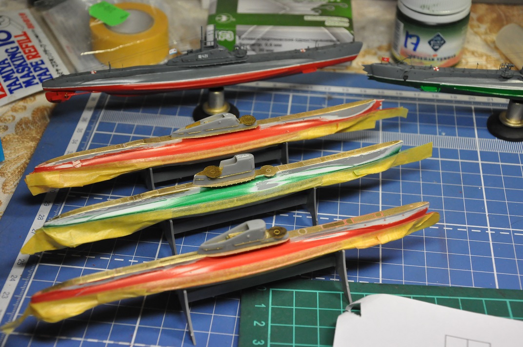 Снял маски с подводной части, которые полгода держались на подводной части. Снялось без проблем - небольшие следы только остались на краске, которые исчезли после того, как глянцевым лаком залил. А вот с ватерлиниями была засада. Забыл сверху по скотчу дунуть - образовались потеки. Причем на всех трех лодках. Пришлось повозиться, убирая огрехи. Но зато руку набил в рисовании тонких ватерлиний.