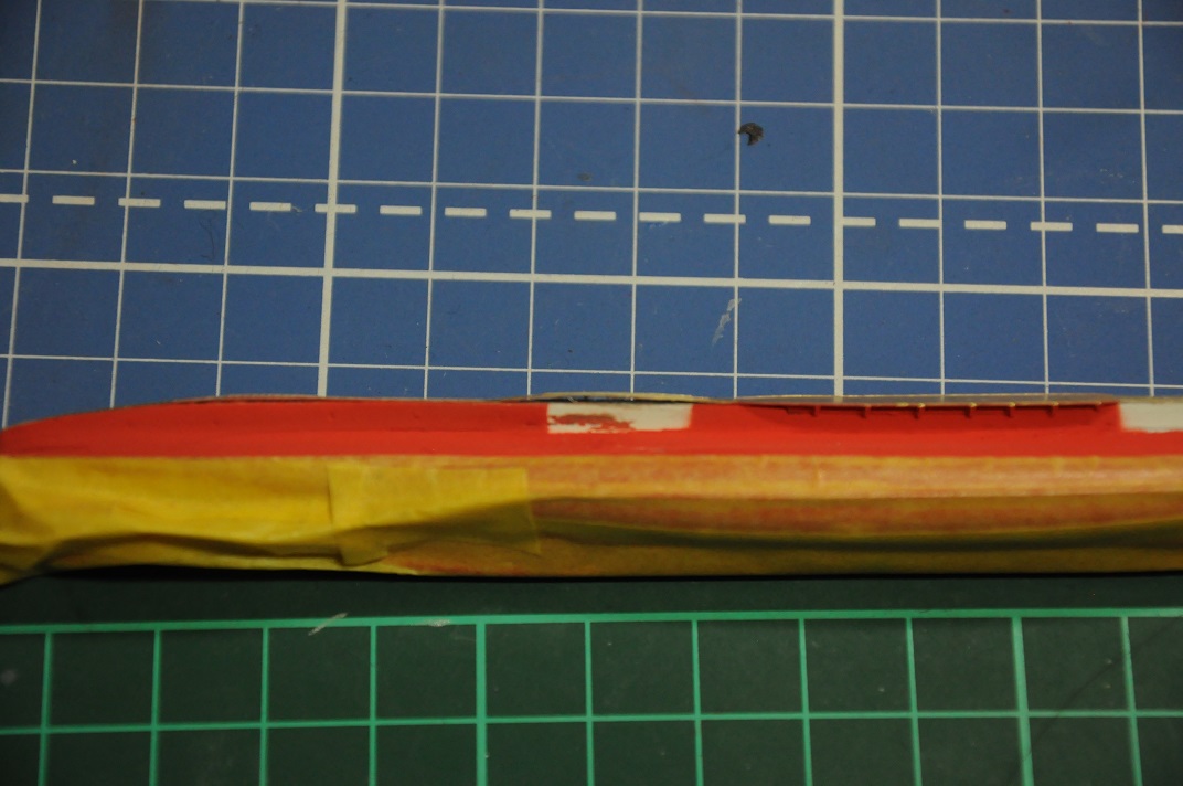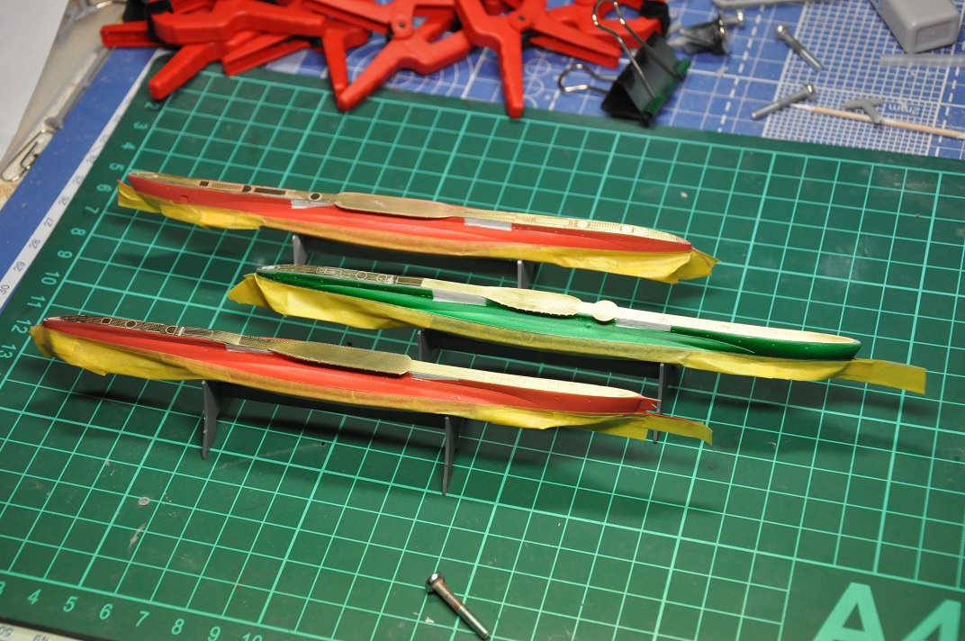 Сделал ватерлинии, покрасил подводные части - в зеленый и красный цвета. Теперь можно надстройки собирать.