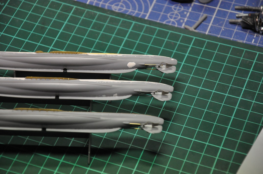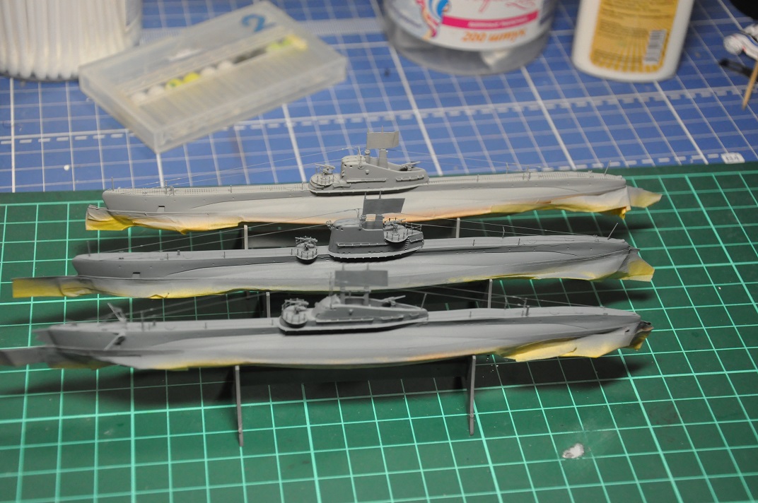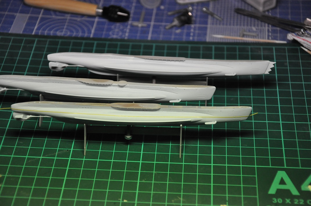 Шпатлевка затянулась - на всех 3-х лодках после высыхания образовались немаленькие вмятины в задней нижней части лодок - как будто подлодки на закритической глубине побывали. Видимо, там толщина корпуса тоньше, чем в середине лодки, клей для пластмассы размягчил пластик корпуса, а после высыхания тот деформировался. Надо было на СА клей литники в задней части клеить - он моментально схватывает без всяких побочных эффектов. Кто ж знал. Фото вмятин что-то не сделал, а сейчас уже все под шпатлевкой.