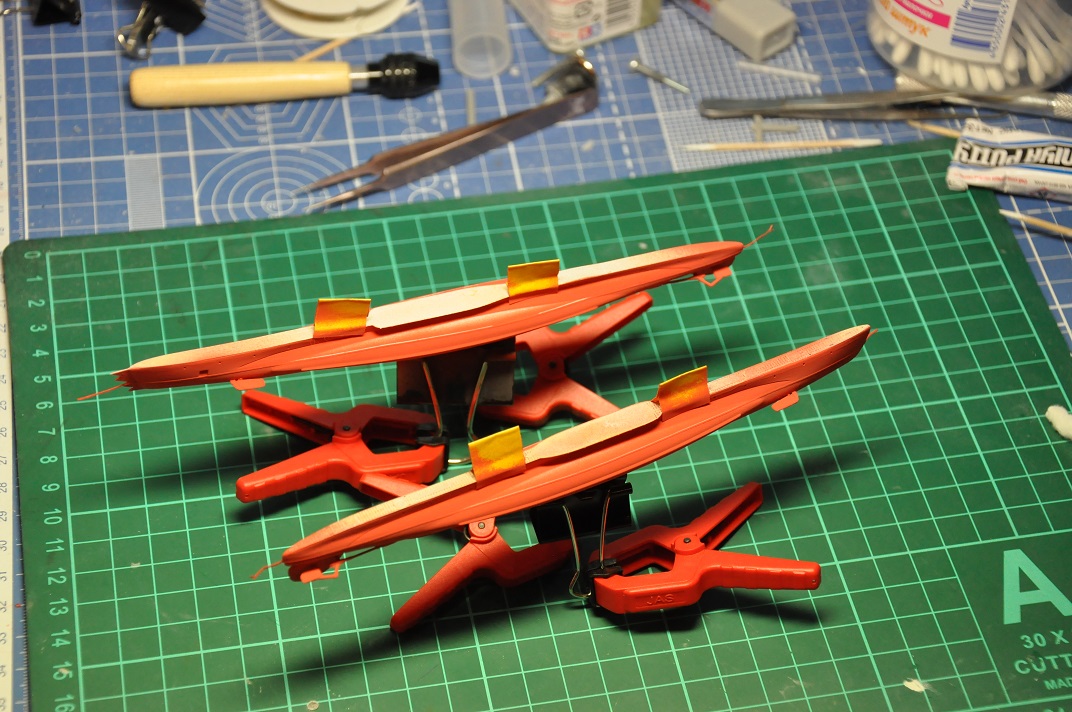 Сделал место крепления подставки в корпусах лодок, собрал корпуса. Подставку сместил к корме лодки. Для балансировки при сборке напихал в заднюю часть лодок обрезки литников. Лодочки потяжелели. Приклеил травленые палубы. Кое-где стык палуб и корпуса плохой, приходится шпатлевкой выводить.