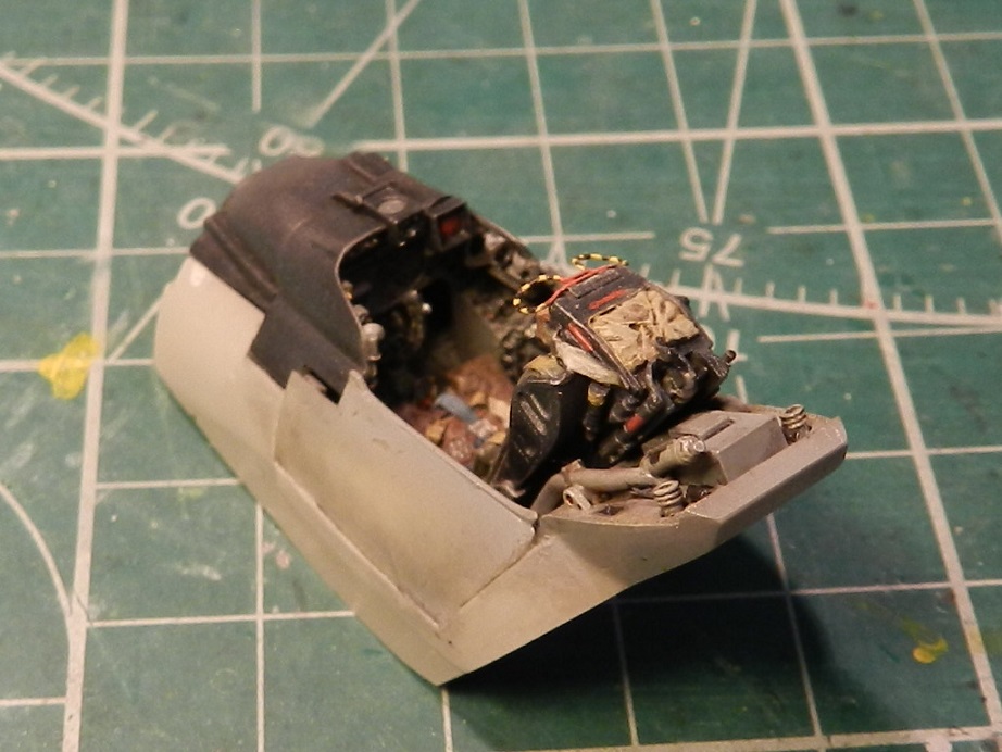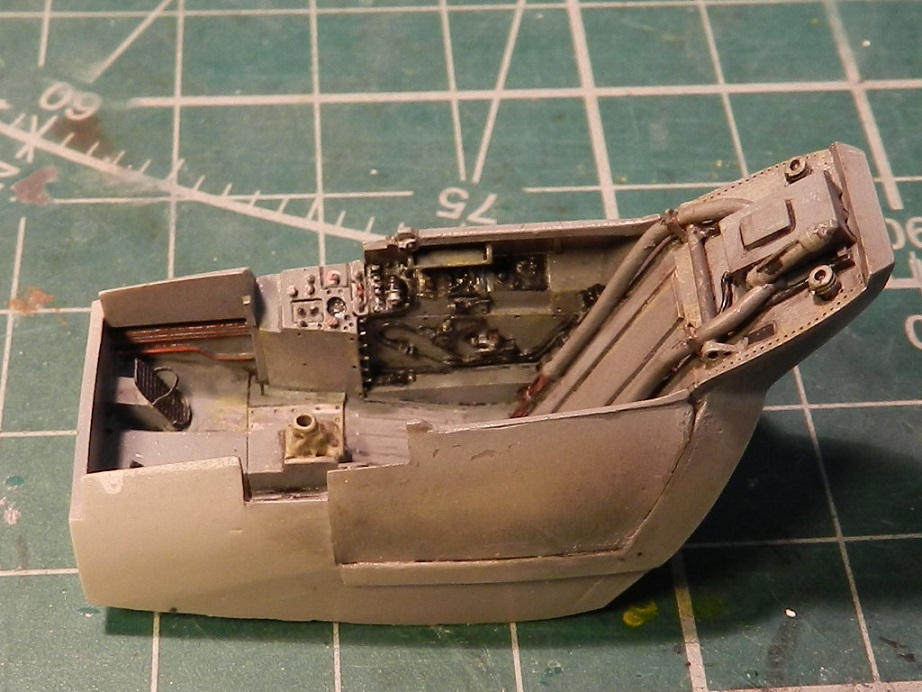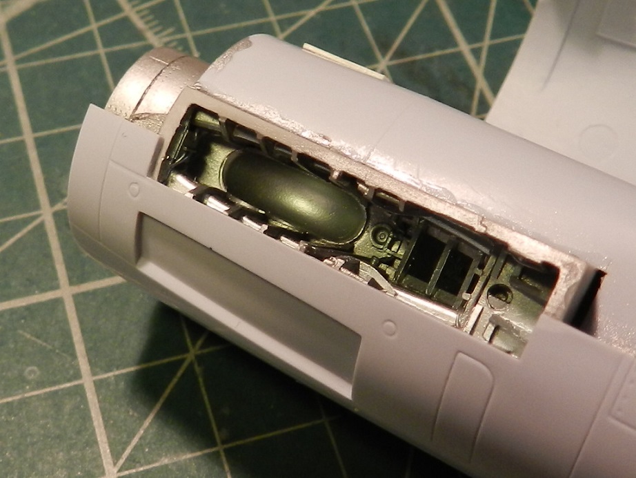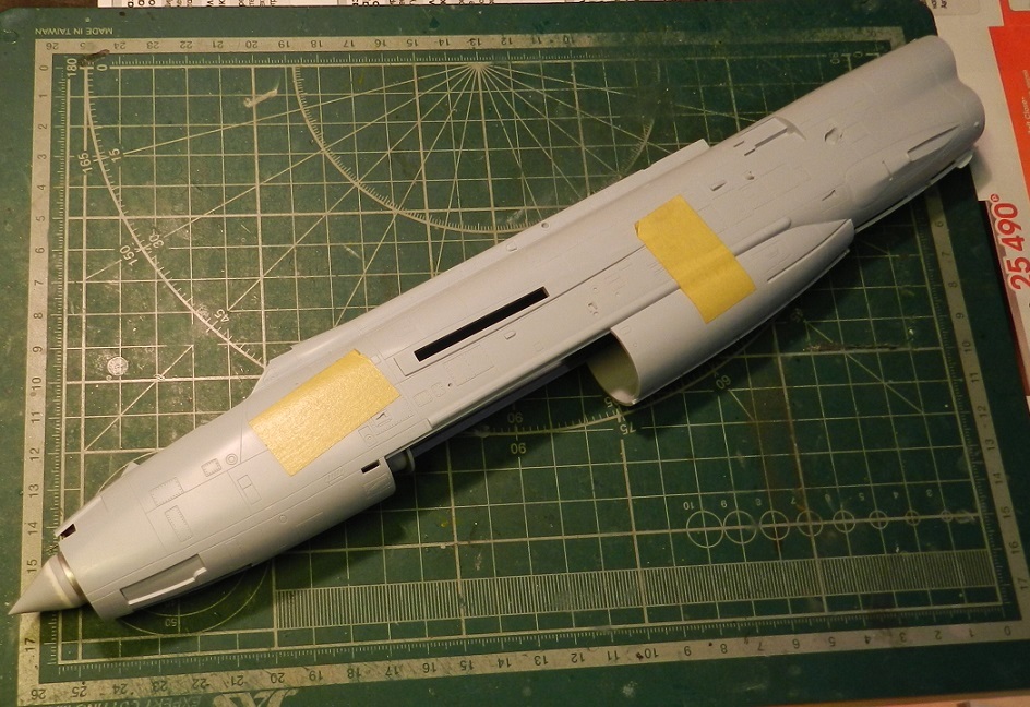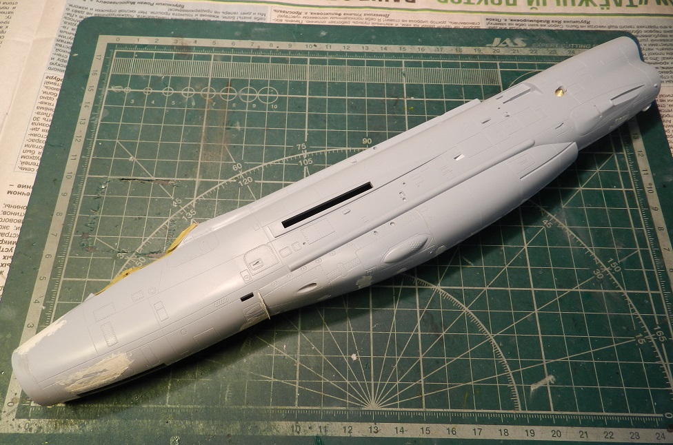 Склеил фюзеляж, покрасил изнутри и вклеил обечайку воздухозаборника, приклеил под пузо контейнер с пушками, зашпаклевал щели и утяжины.